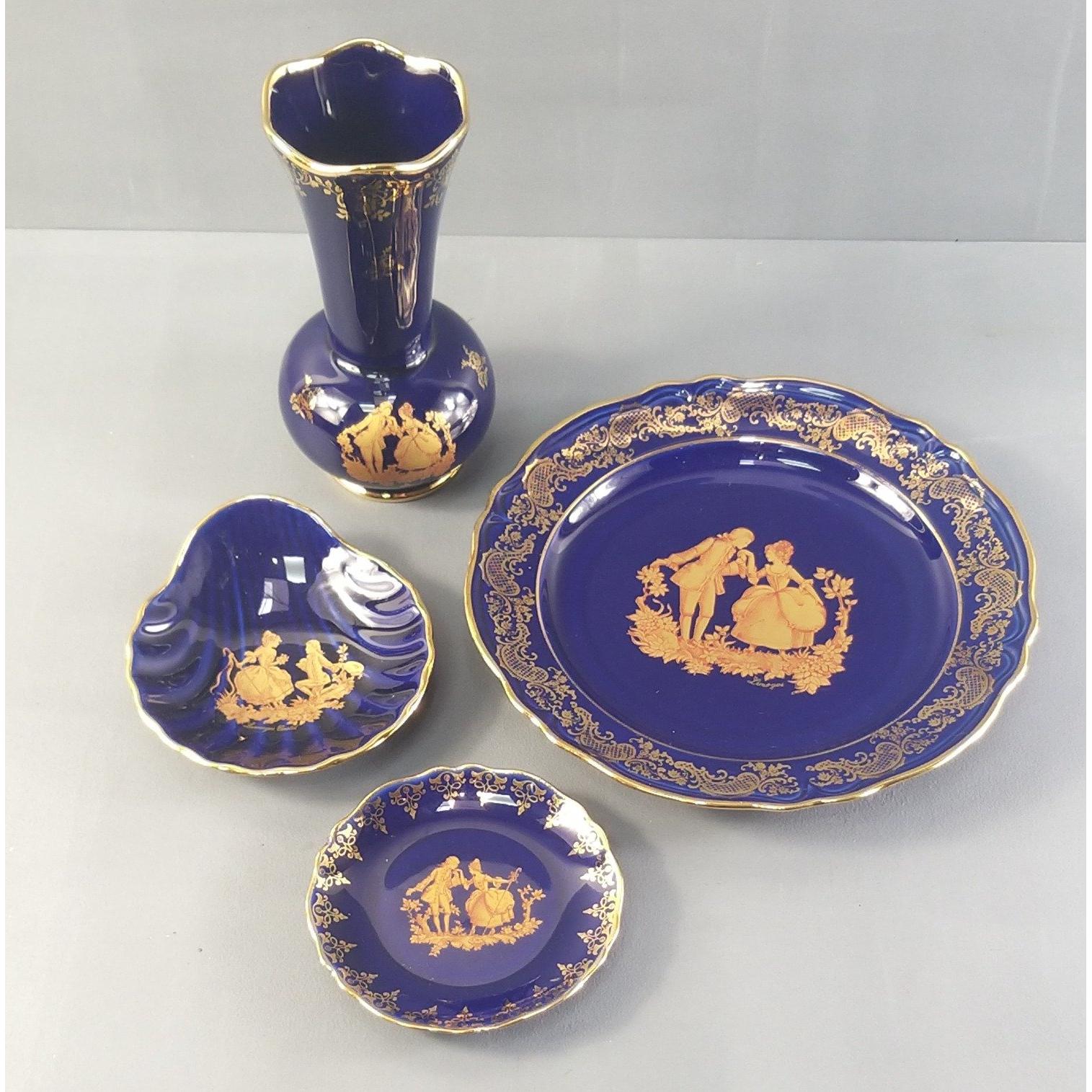 LIMOGES four pieces in the Real Gold Porcelaine Imperial Limoges all in good order with no chips, cracks or rubbing to gilt. The vase 15cm tall approx. Approx 4 pieces