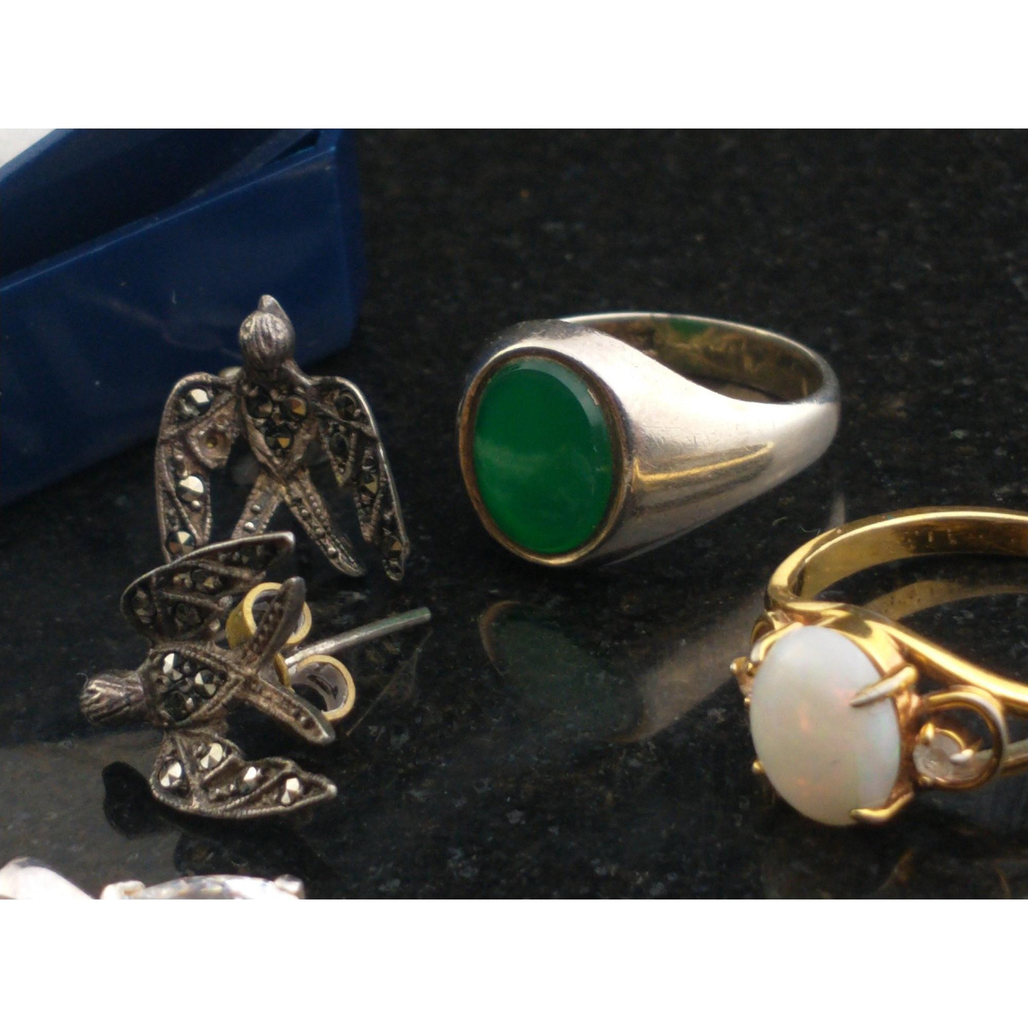 A mixed jewellery lot to include a 925 stamped tear drop pendant on a 925 chain 44cm approx, plus a pair of marcasite swallow earrings, a boxed filigree butterfly brooch (30mm approx), two rings and one other pair of earrings