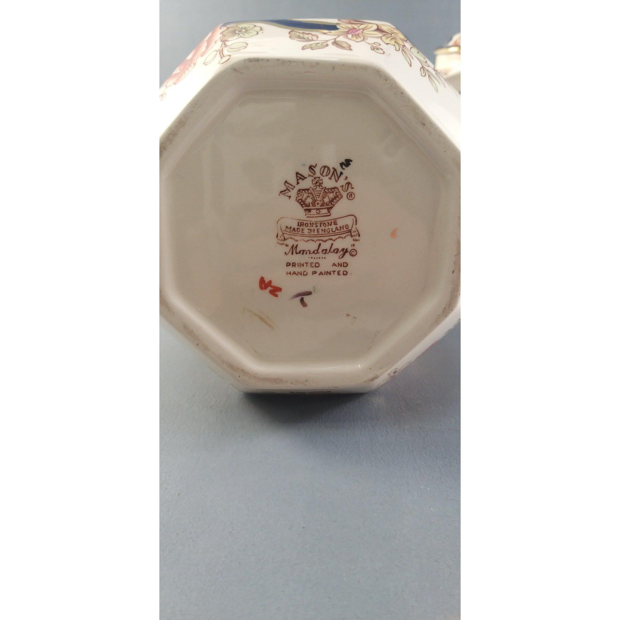 Lovely collection of five ANTIQUE MASONS IRONSTONE pieces, all in good condition with no chips or cracks. All MANDALAY pattern. Comprises jug 17cm, dish 26cm both approx, two other trays and a lovely tea caddy. A good collection of these collectible pieces.