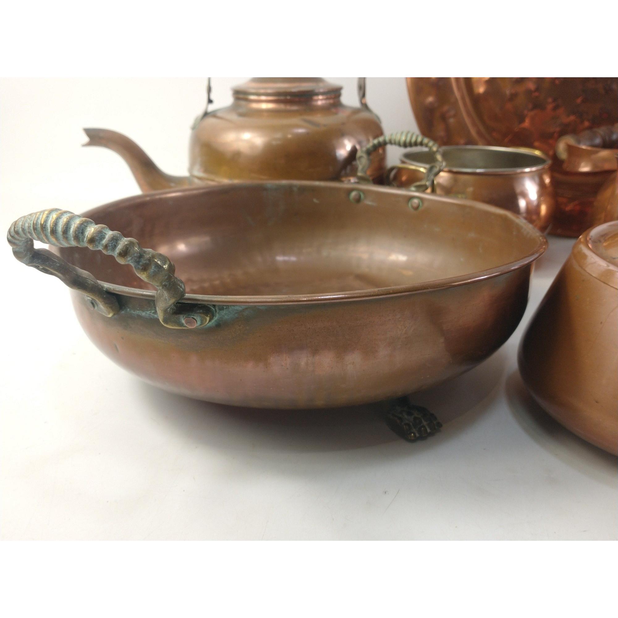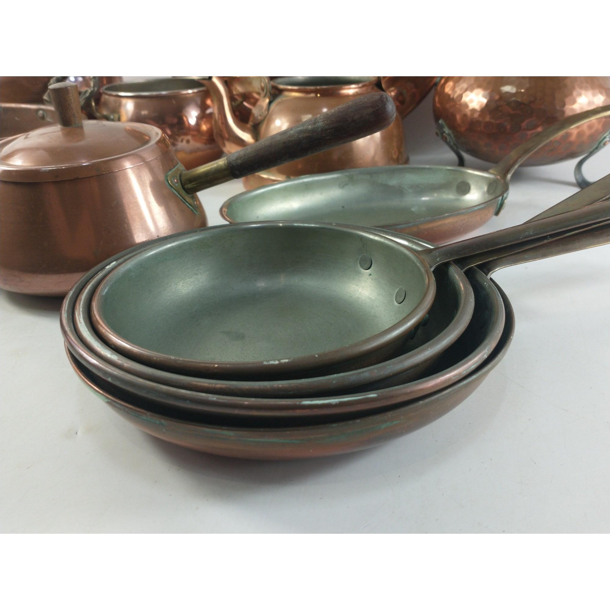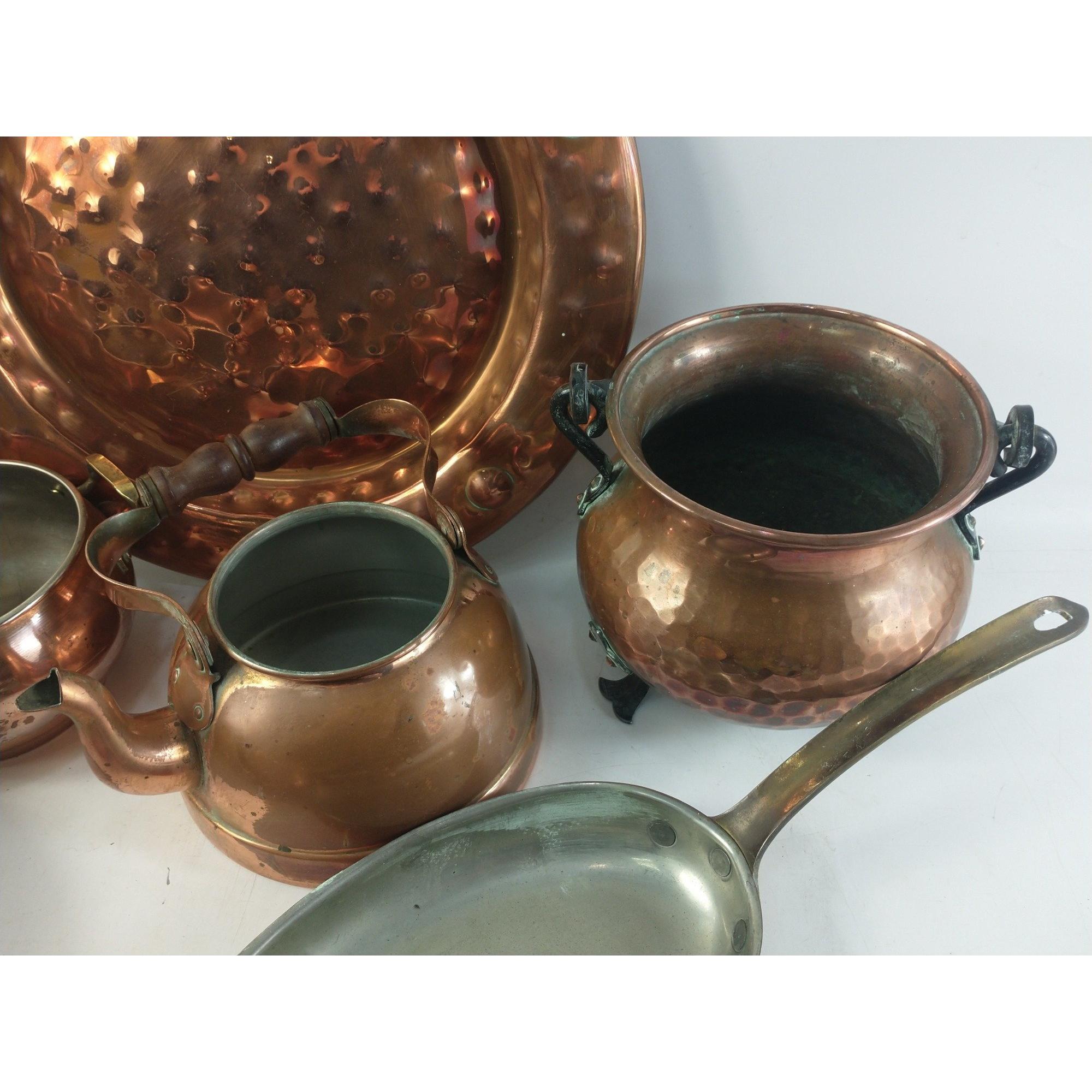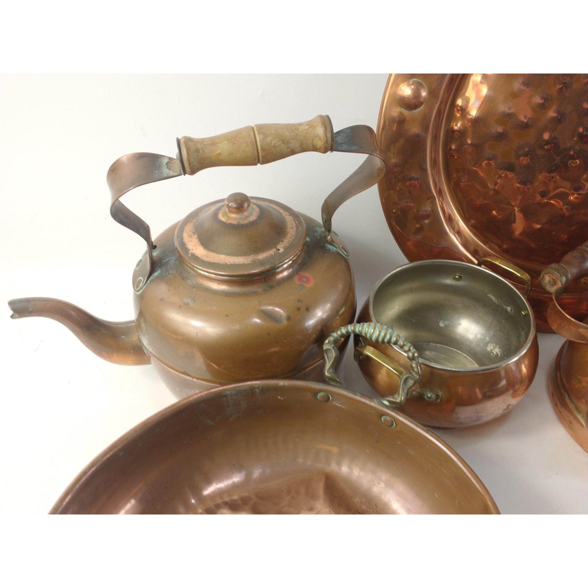 A box of copper kitchen ware items as well as decorative tray comprising four graduated frying pans, kettle, cauldron, fondue pot and others as well as a 34cm copper tray.