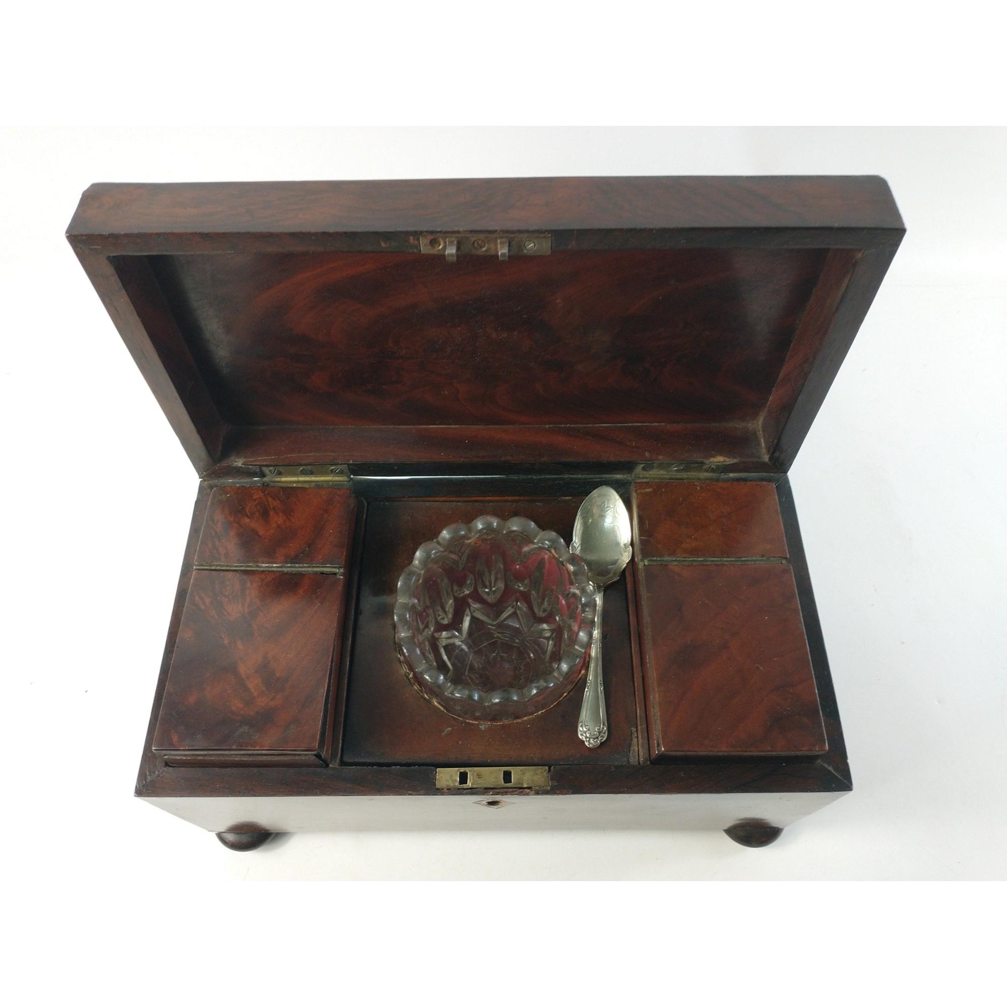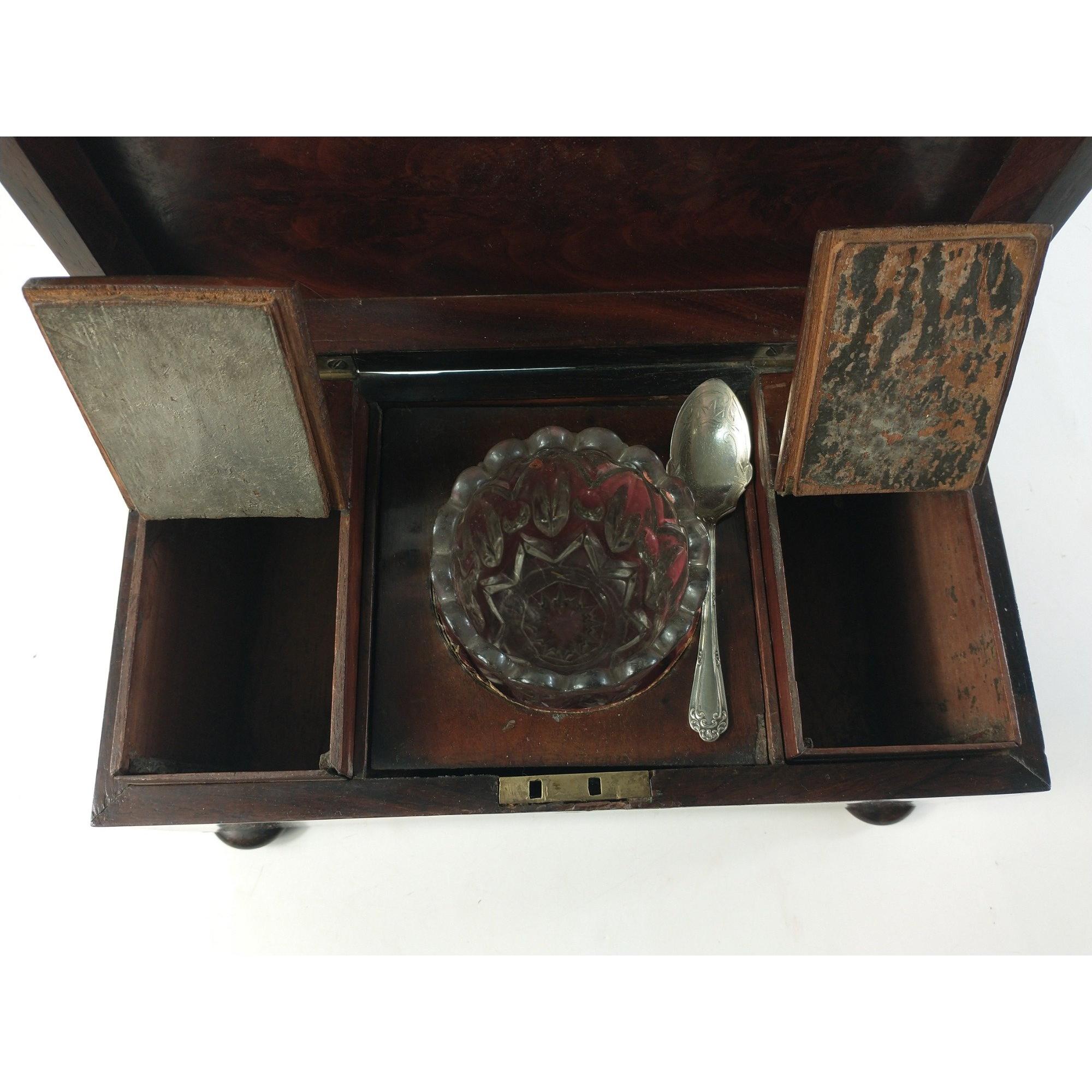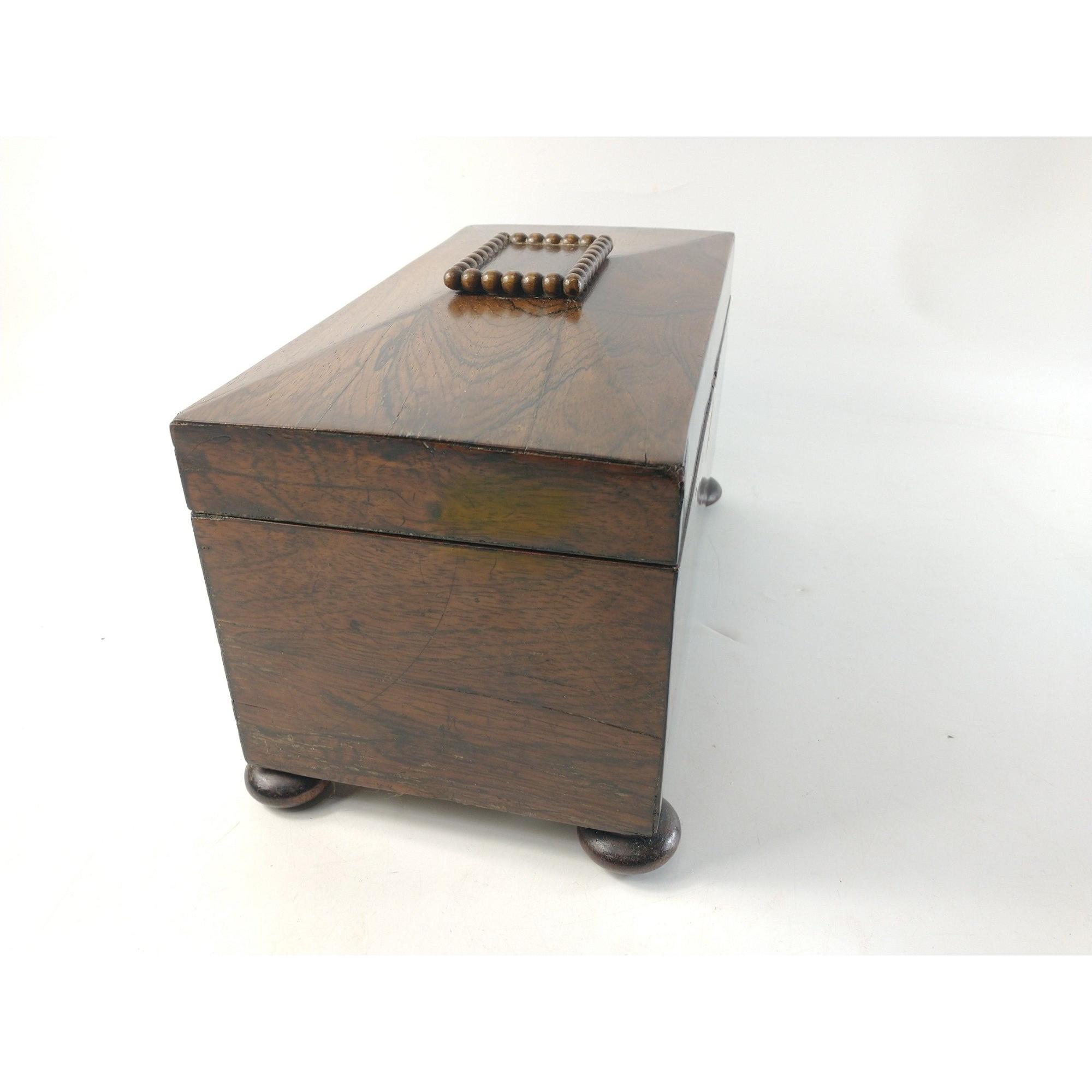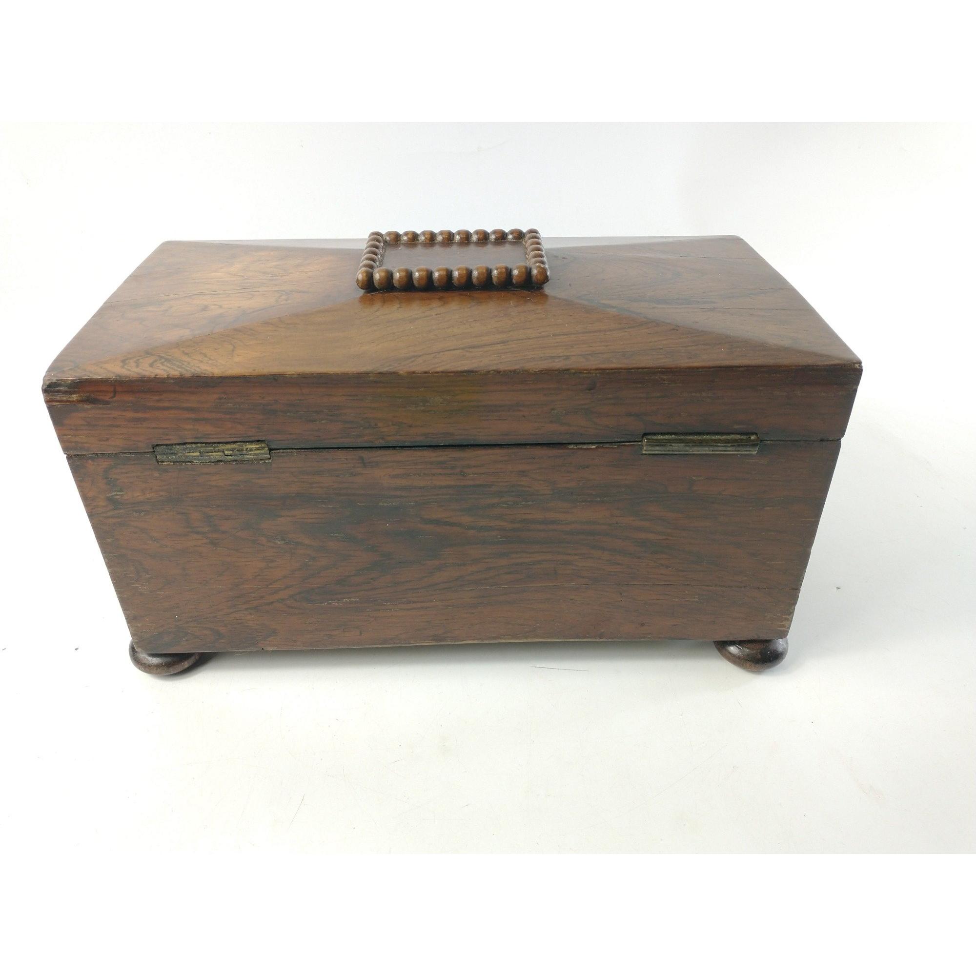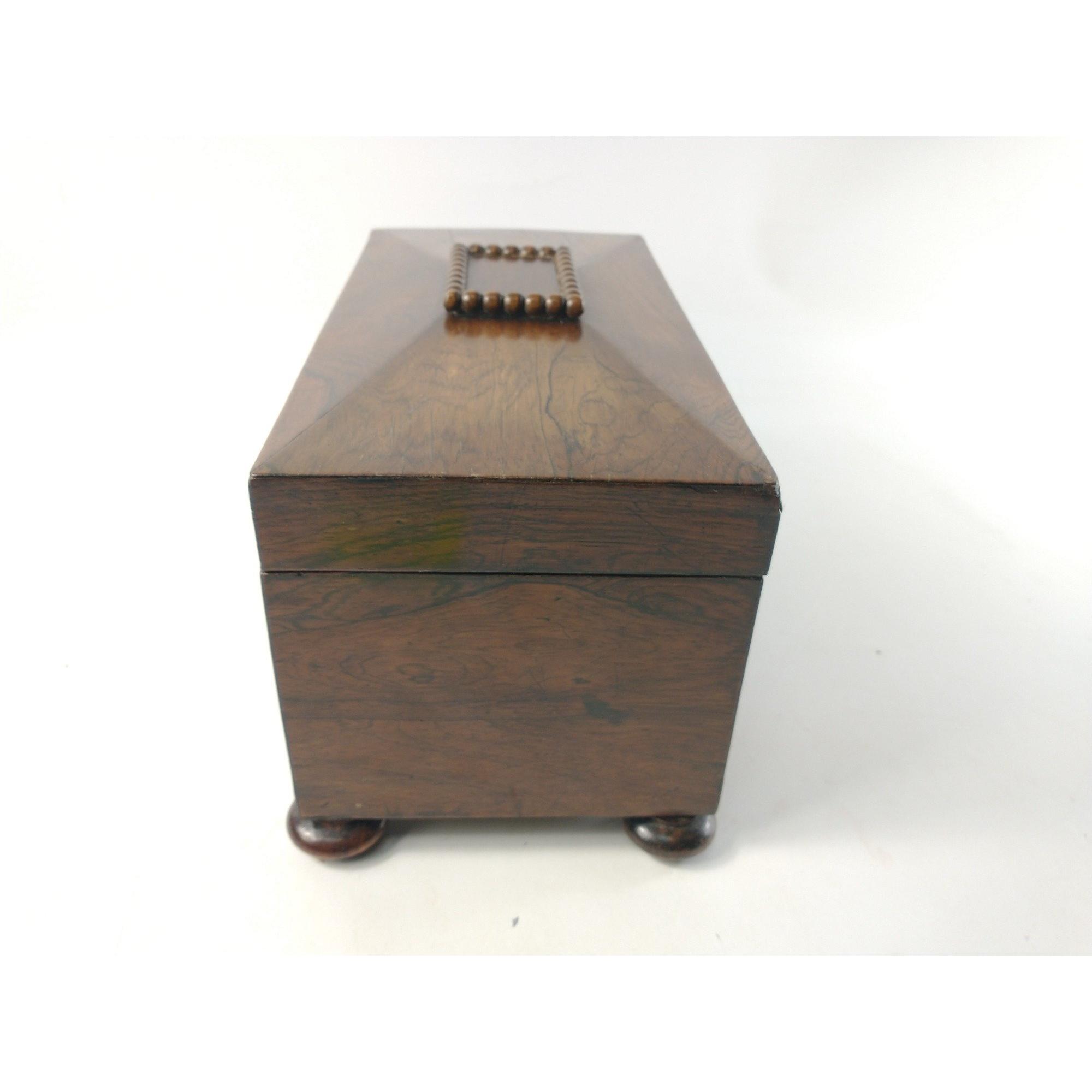 A splendid Rosewood sarcophagus shaped tea caddy with the two lidded internal caddies and bowl. Standing on bun feet, the whole presents well. 31cm x 18cm x 16cm approx.