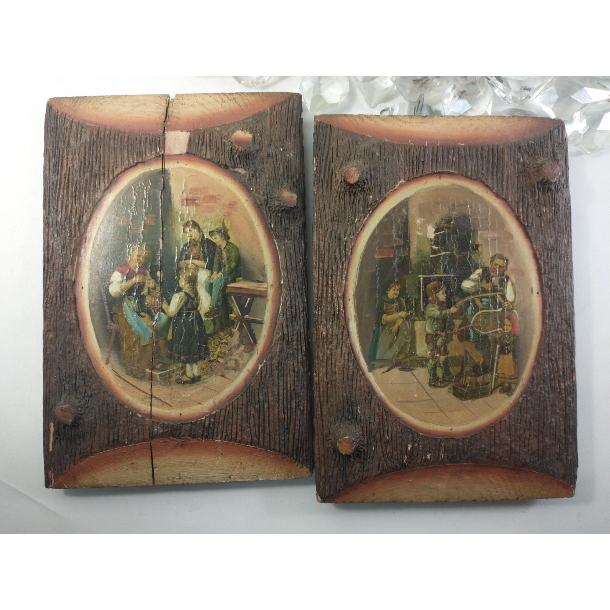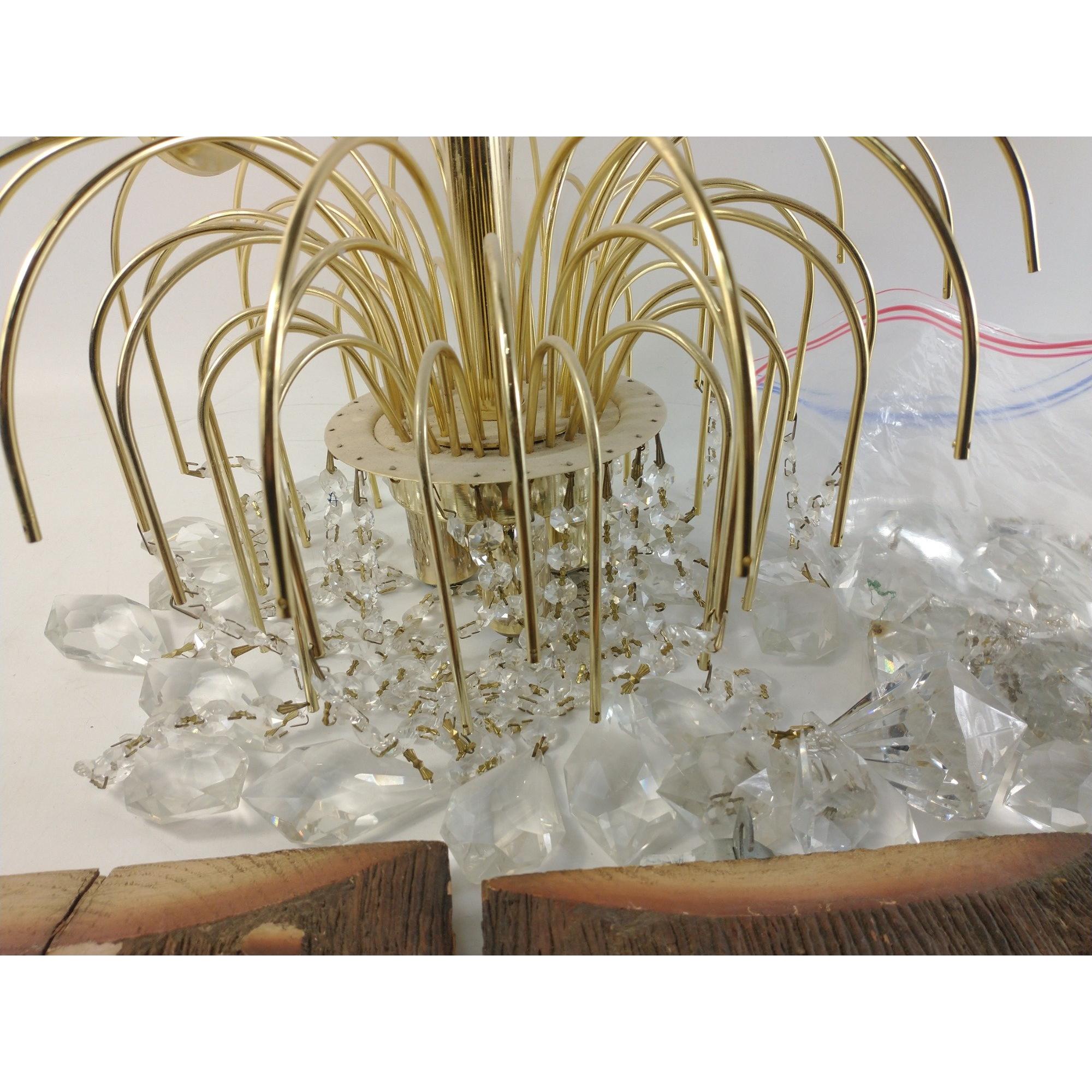 A brass effect chandelier ceiling lamp with attractive glass droppers. Approx 40cm across. With two unusual painted wooden wall plaques.