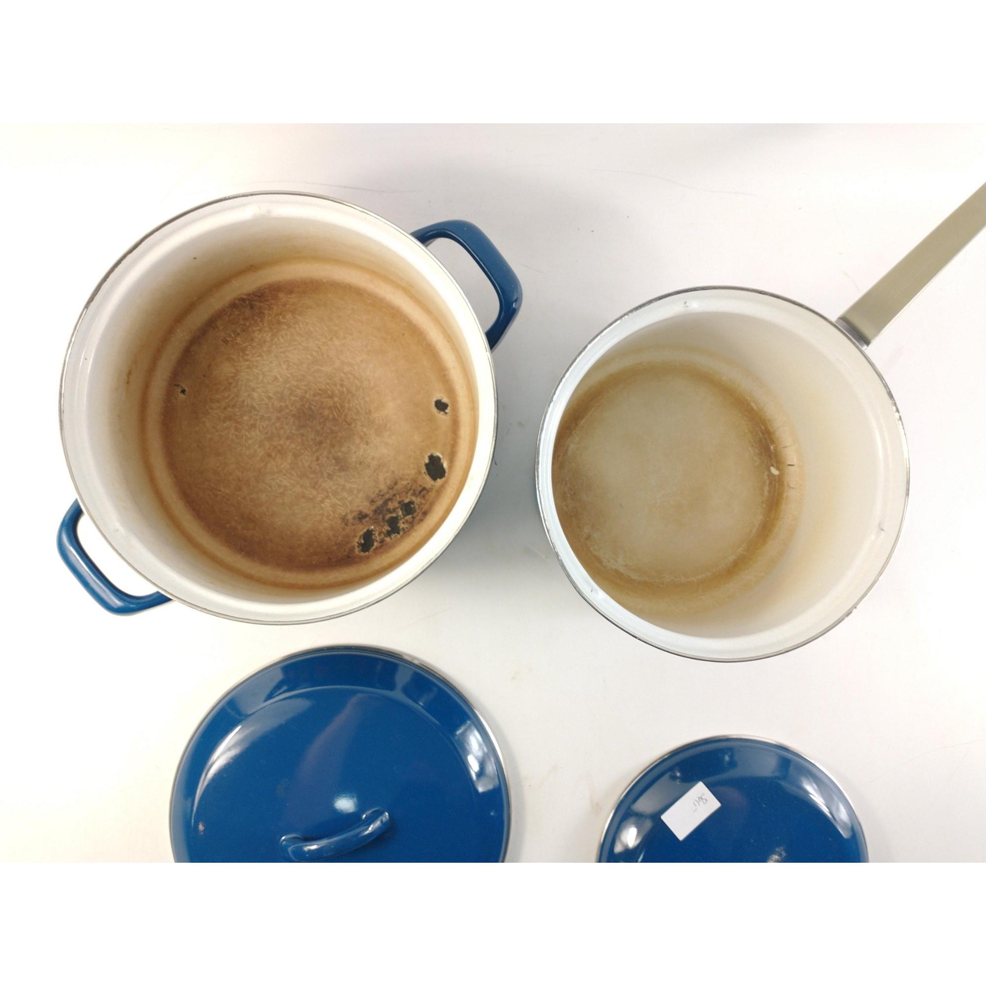 A used blue enamel saucepan and also a matching casserole dish. Both a good weight.Approx 2 pieces