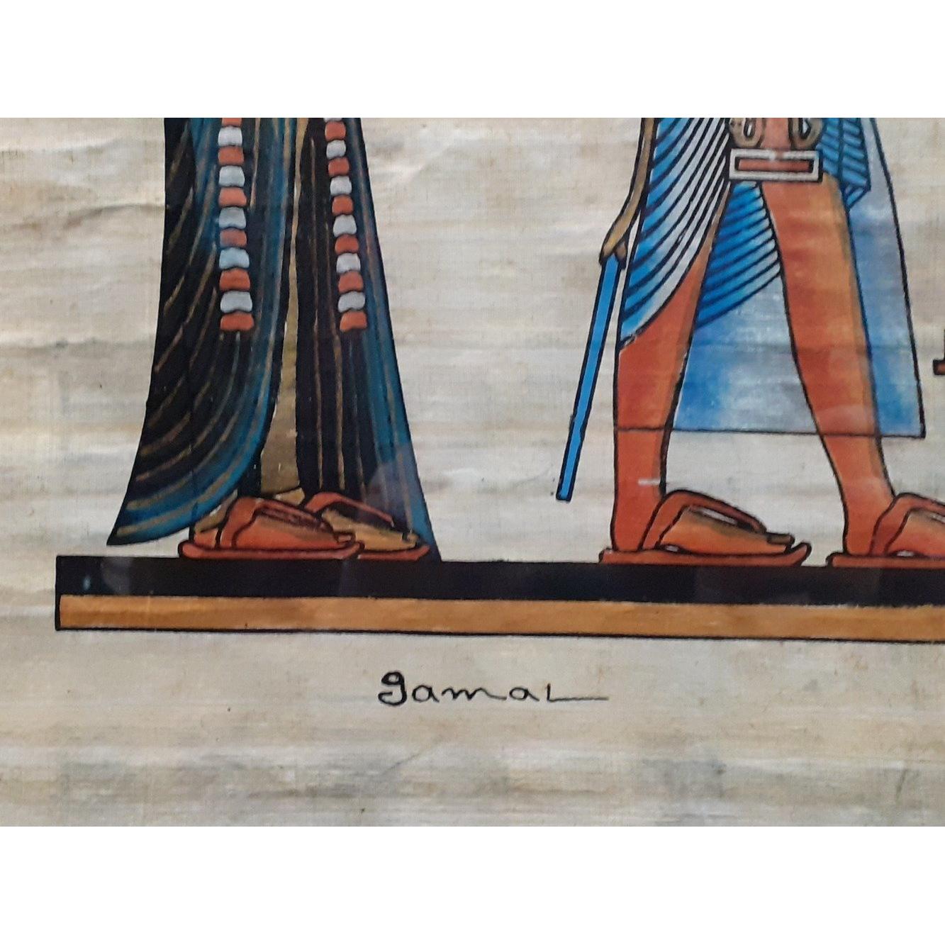 A large and attractive Egyptian framed papyrus art work piece. Colourful and impressive piece. 53cm x 100cm approx. Nicely framed in subtle gilt frame.