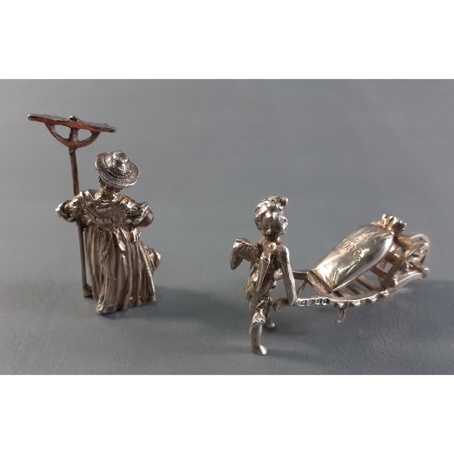 A wonderful and scarce CHESTER hallmarked small character piece of winged cherub pushing barrow. Hallmarked 1898 Chester with BERTHOLD MULLER maker's mark. 6cm long approx 27.4g approx. A very unusual and desirable piece. Comes with another similar unmarked item of a lady with rake.