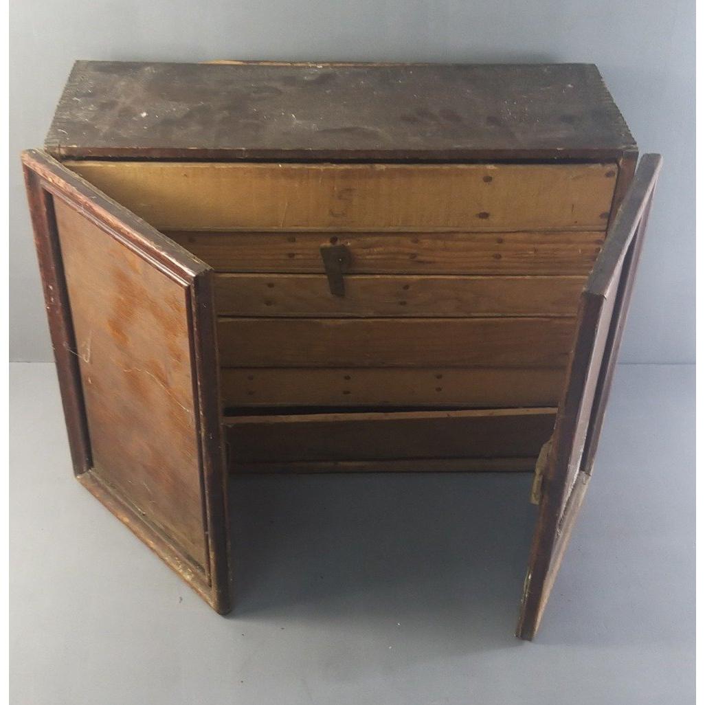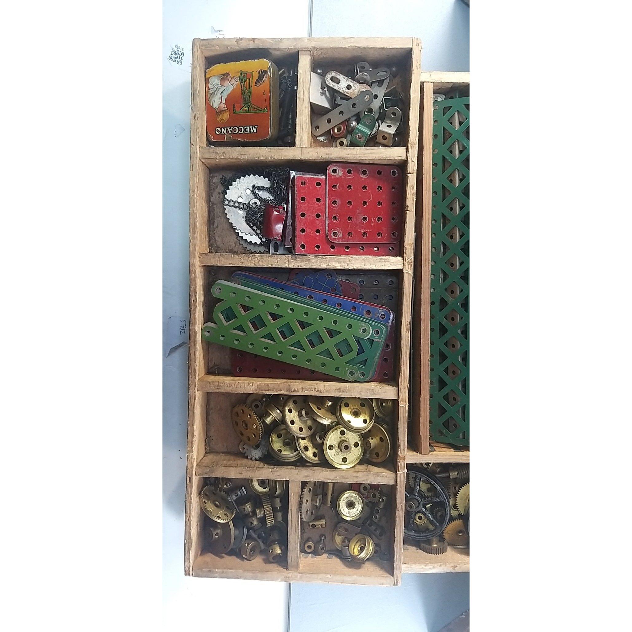 A very old home made wooden box filled with MECCANO. Older pieces and much of interest.