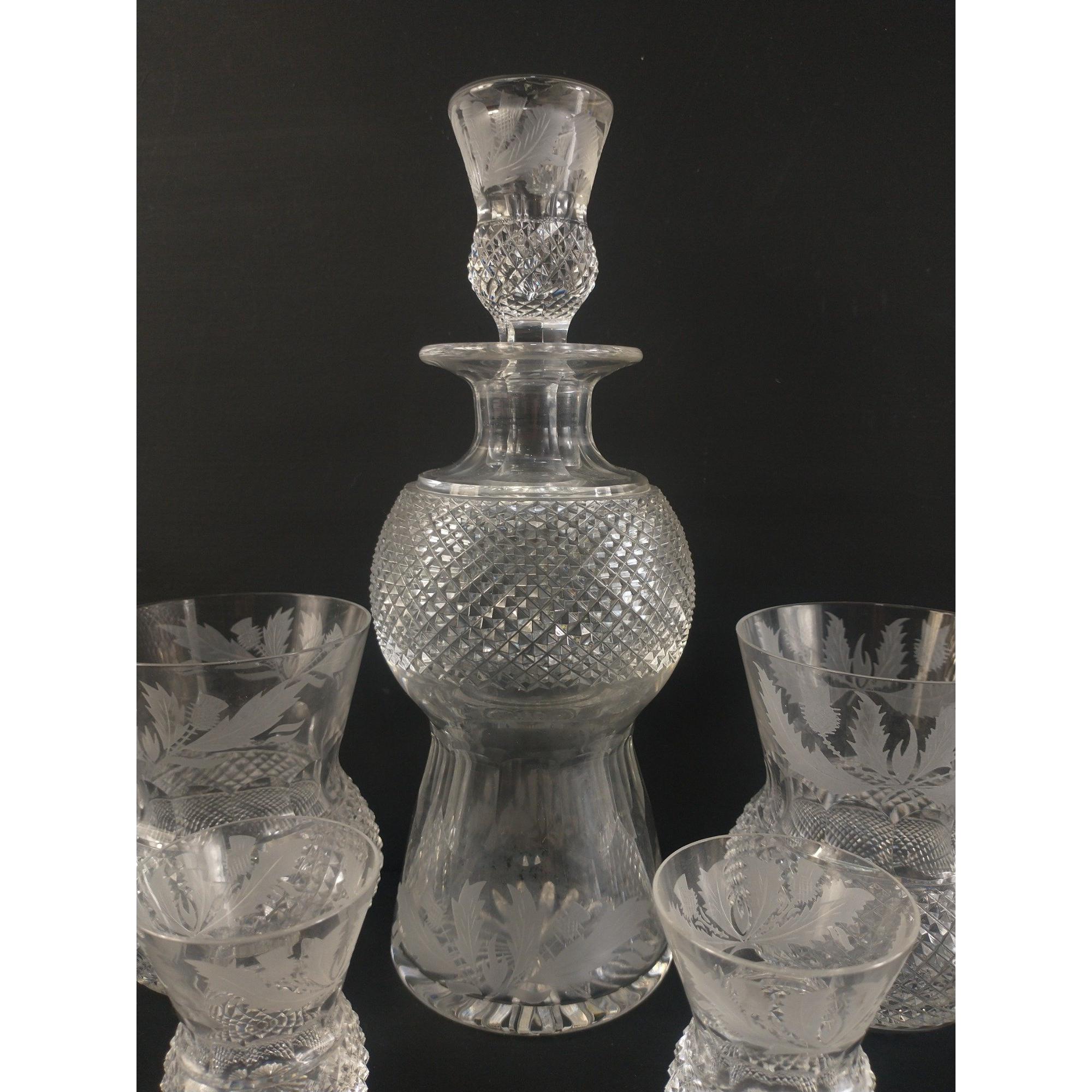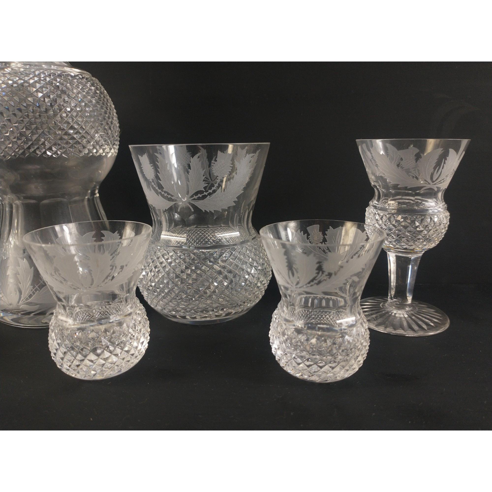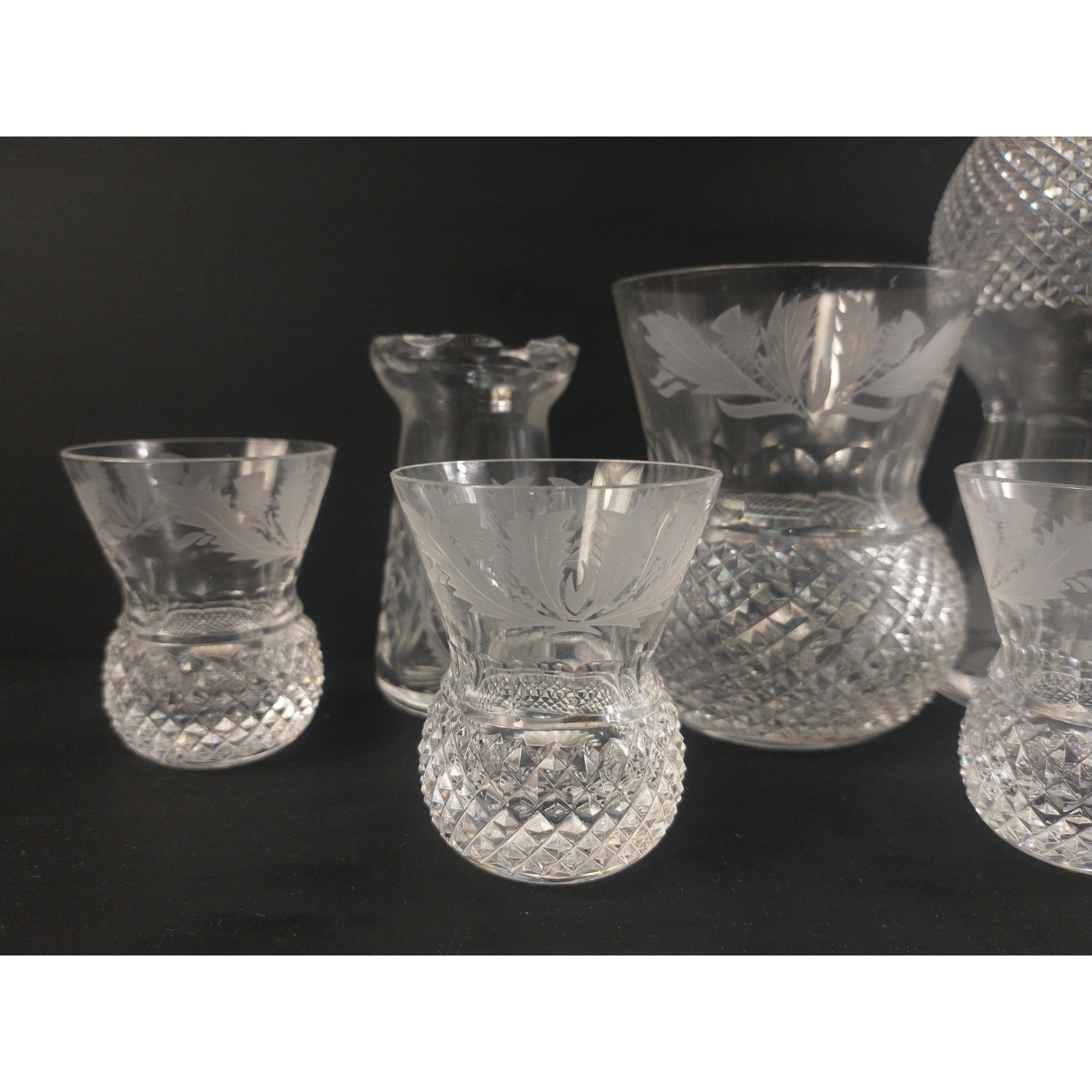 A collection of pressed glass THISTLE WARE including 5 small tot glasses, 2 large tot glasses, a small decanter, etc