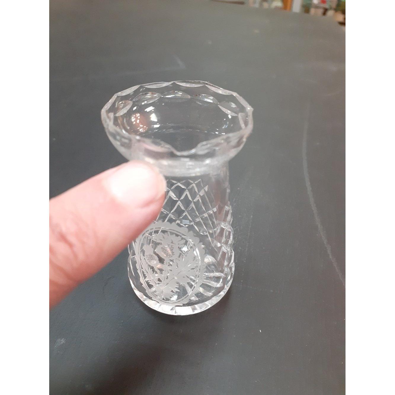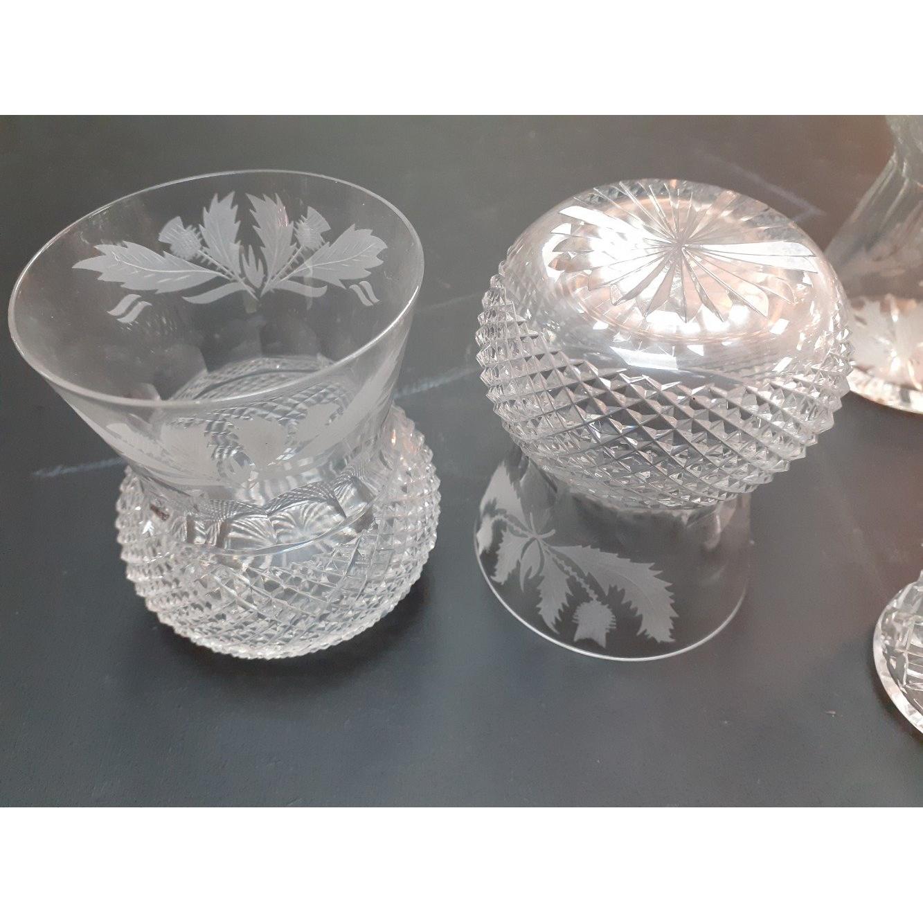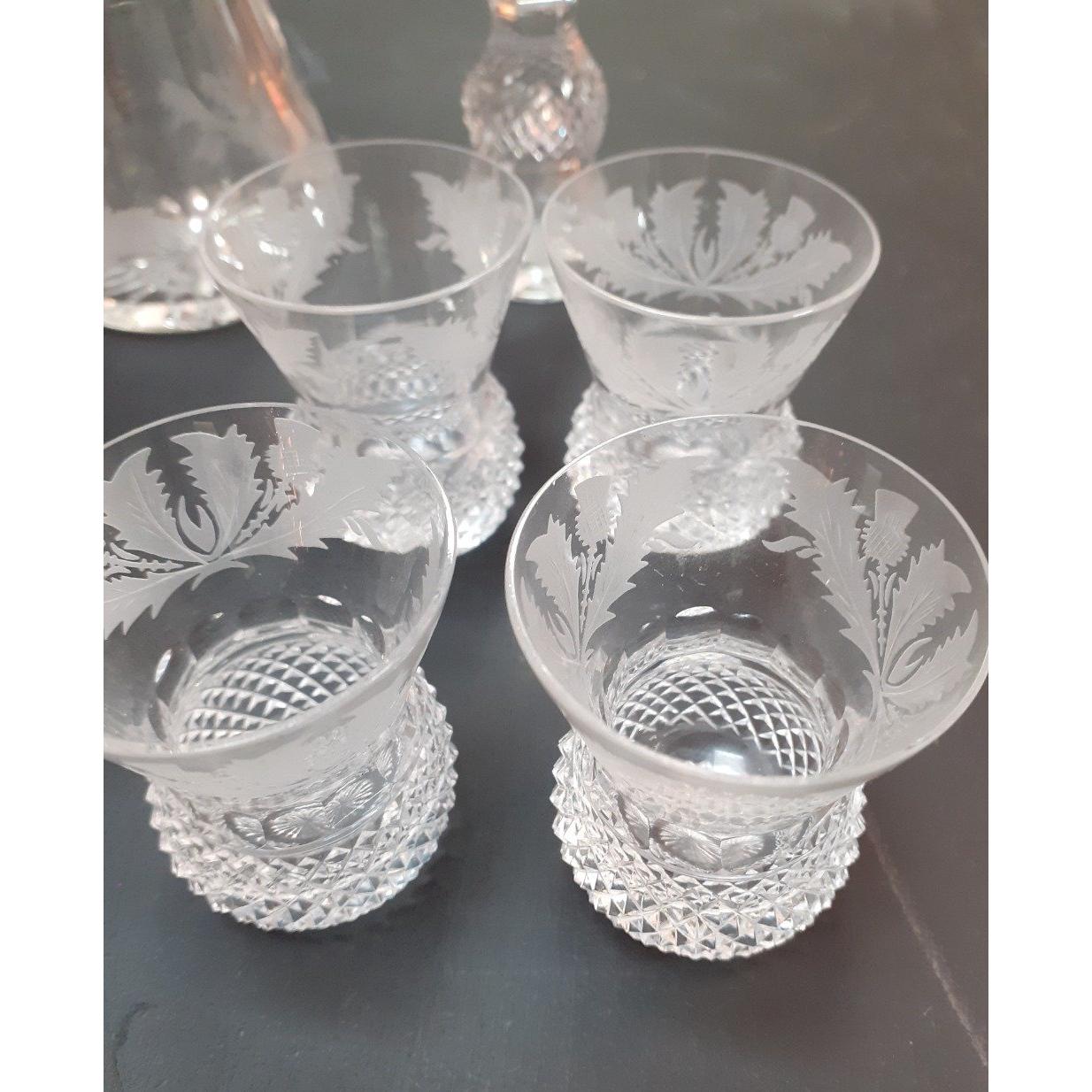 A collection of pressed glass THISTLE WARE including 5 small tot glasses, 2 large tot glasses, a small decanter, etc