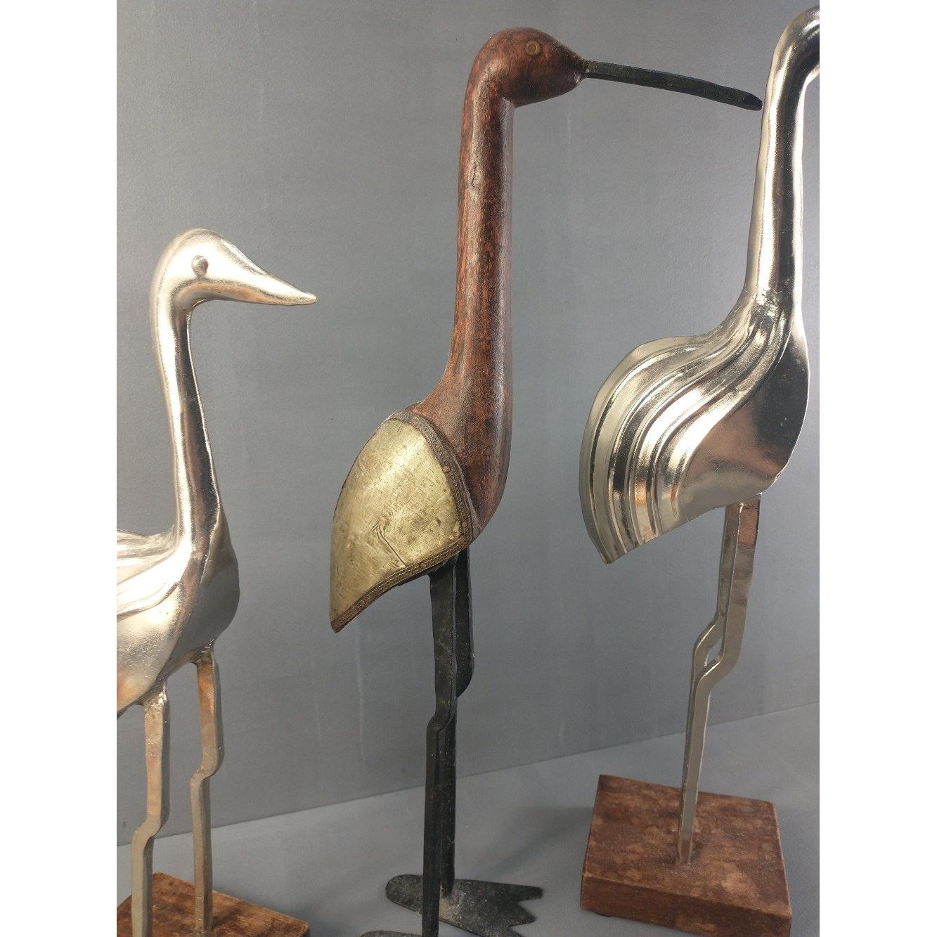 Two M&S metal bird figurines on plinths, taller 48cm approx plus one other wood and metal crane standing approx 46cm tallApprox 3 pieces