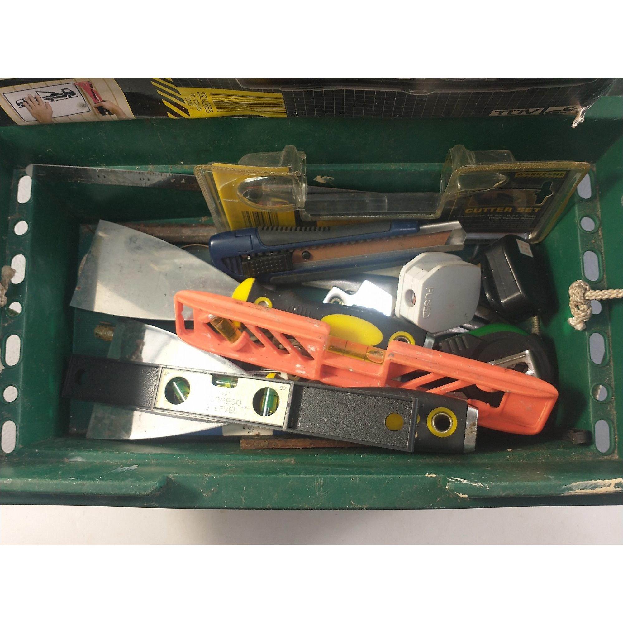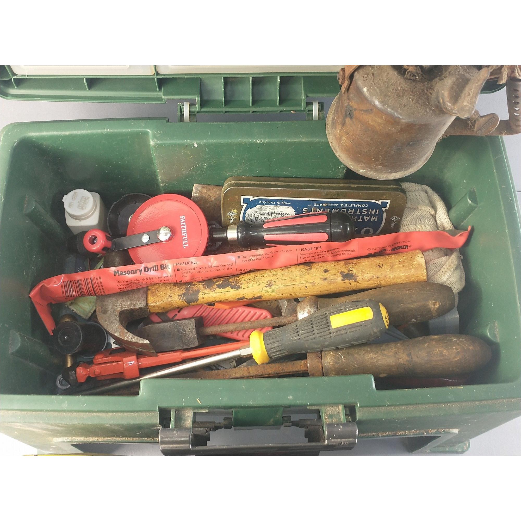 A toolbox footstool stuffed full of tools including hammers, screwdrivers, fixtures, fittings, with a tool tray with vintage blow torch and others. Approx 1 pieces
