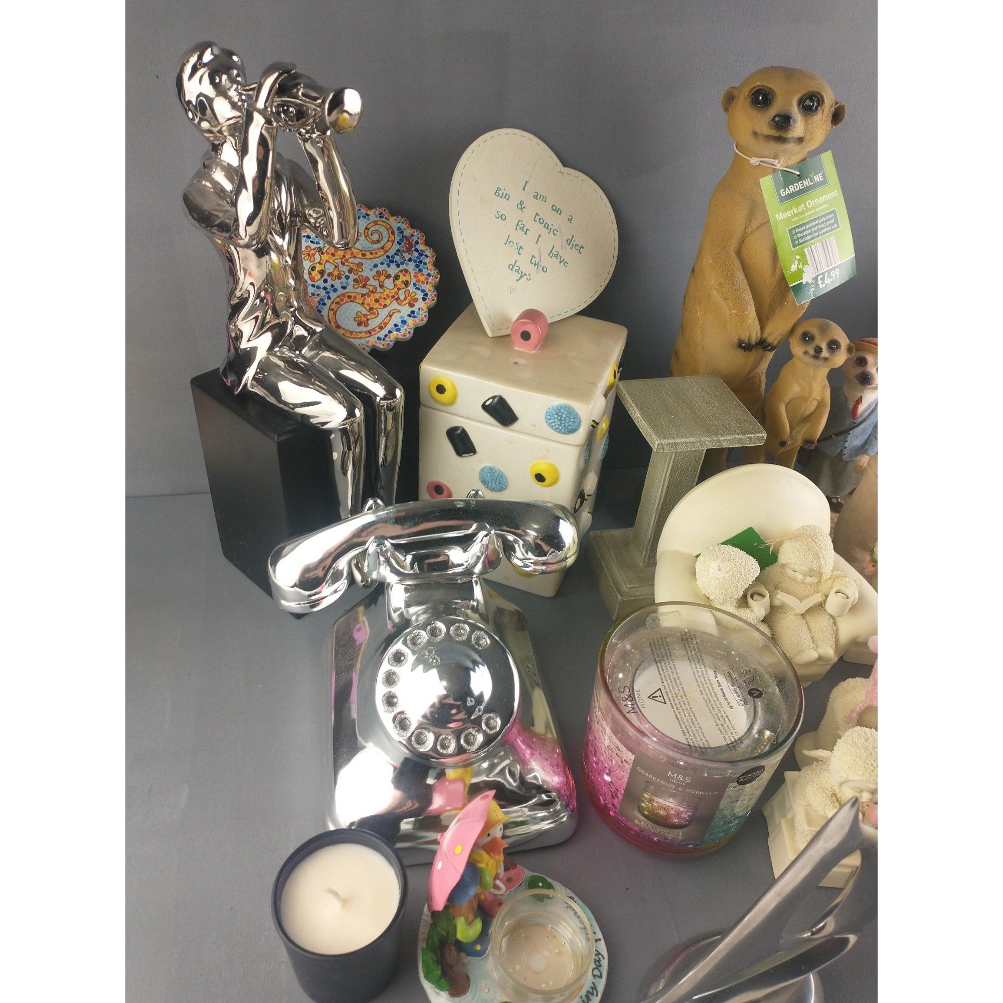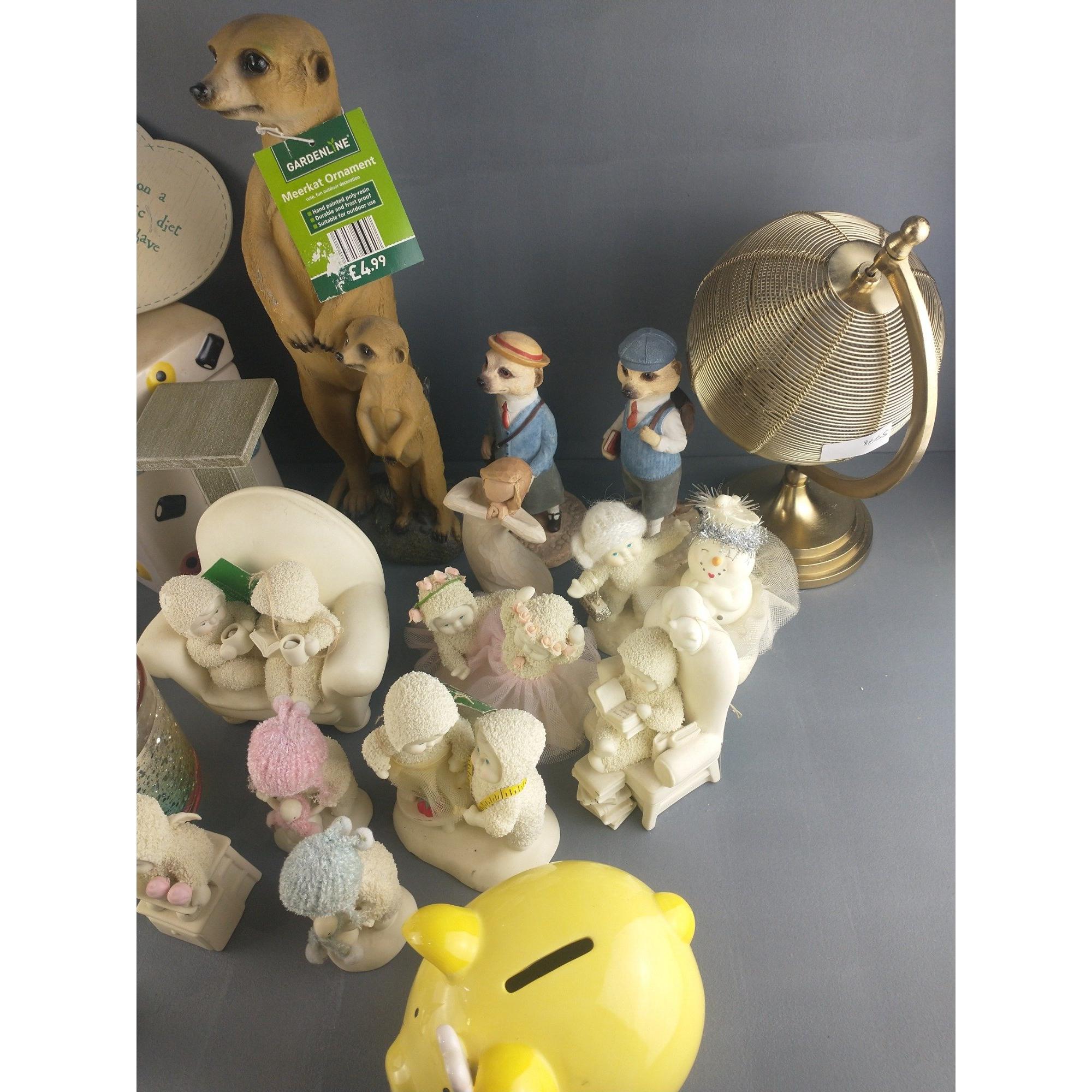 A mixed lot of decorative items to include meerkat ornaments, snowbabies ornaments, liquorice all sorts storage jar etc