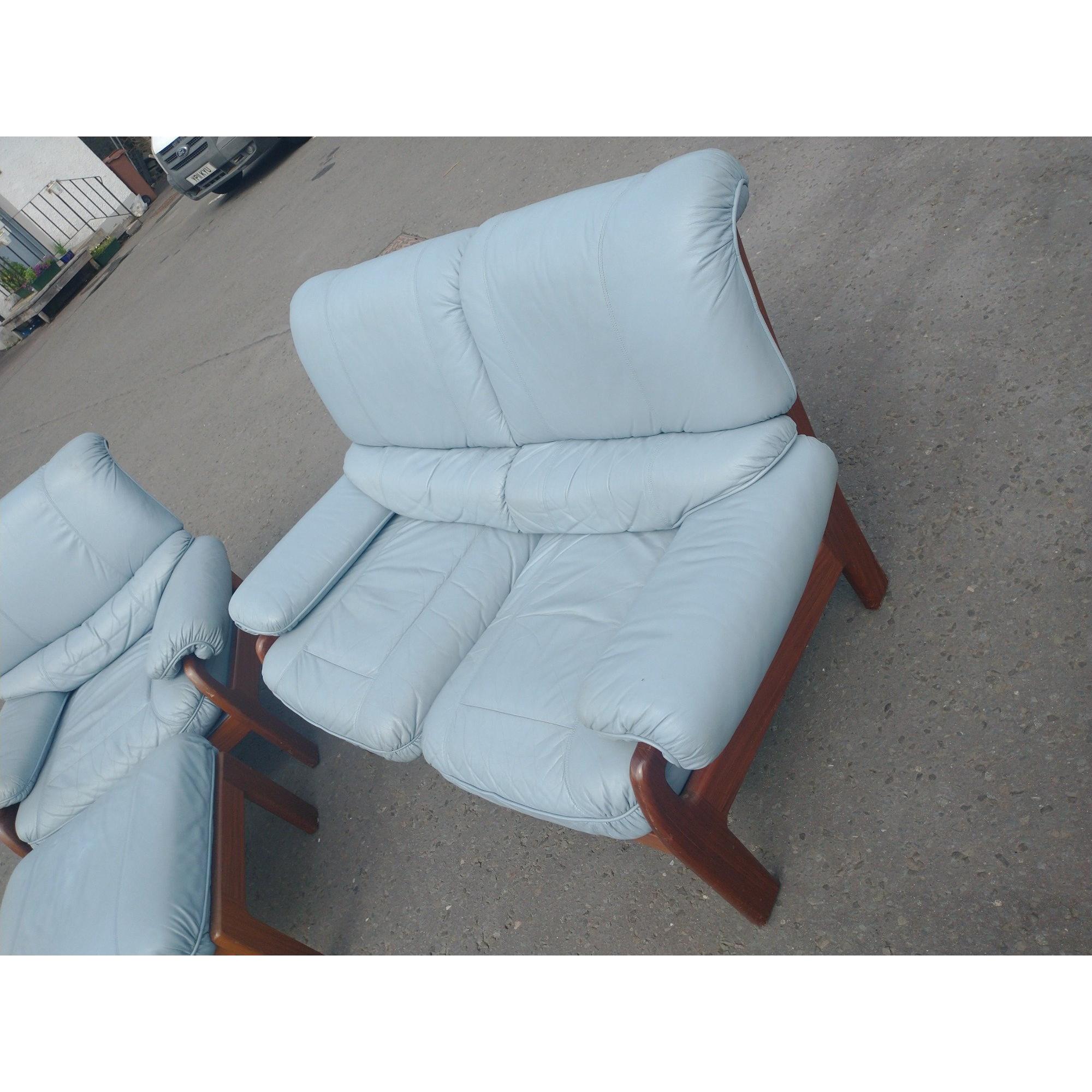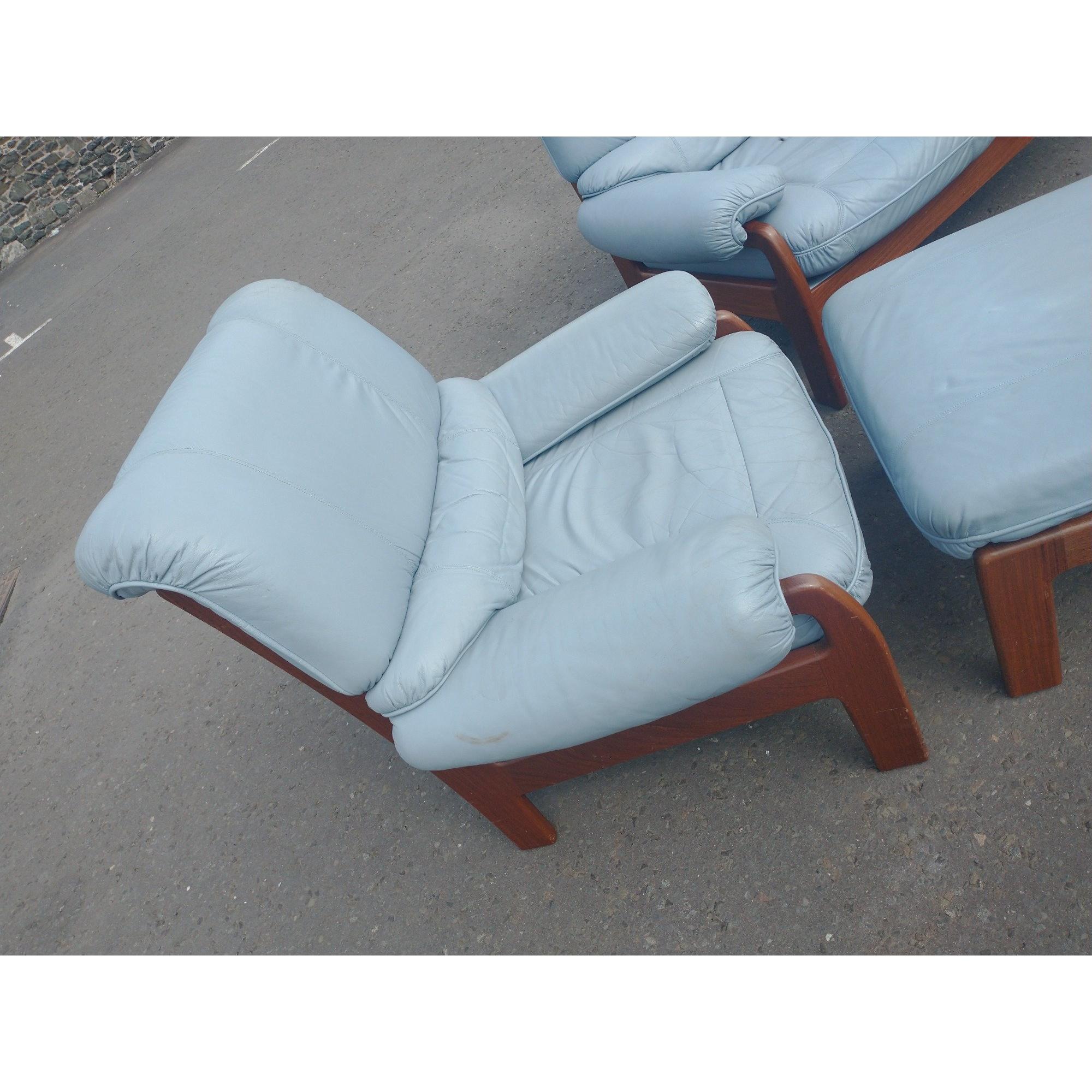 REMARKABLE RETRO Light blue leather G-Plan (label on footstool) two seater suite with an arm chair & footstool - it's just SO COOL! - in good condition for all the decades of daily wear and tear - quite remarkable indeed! - the vendor really looked after this much loved suite.