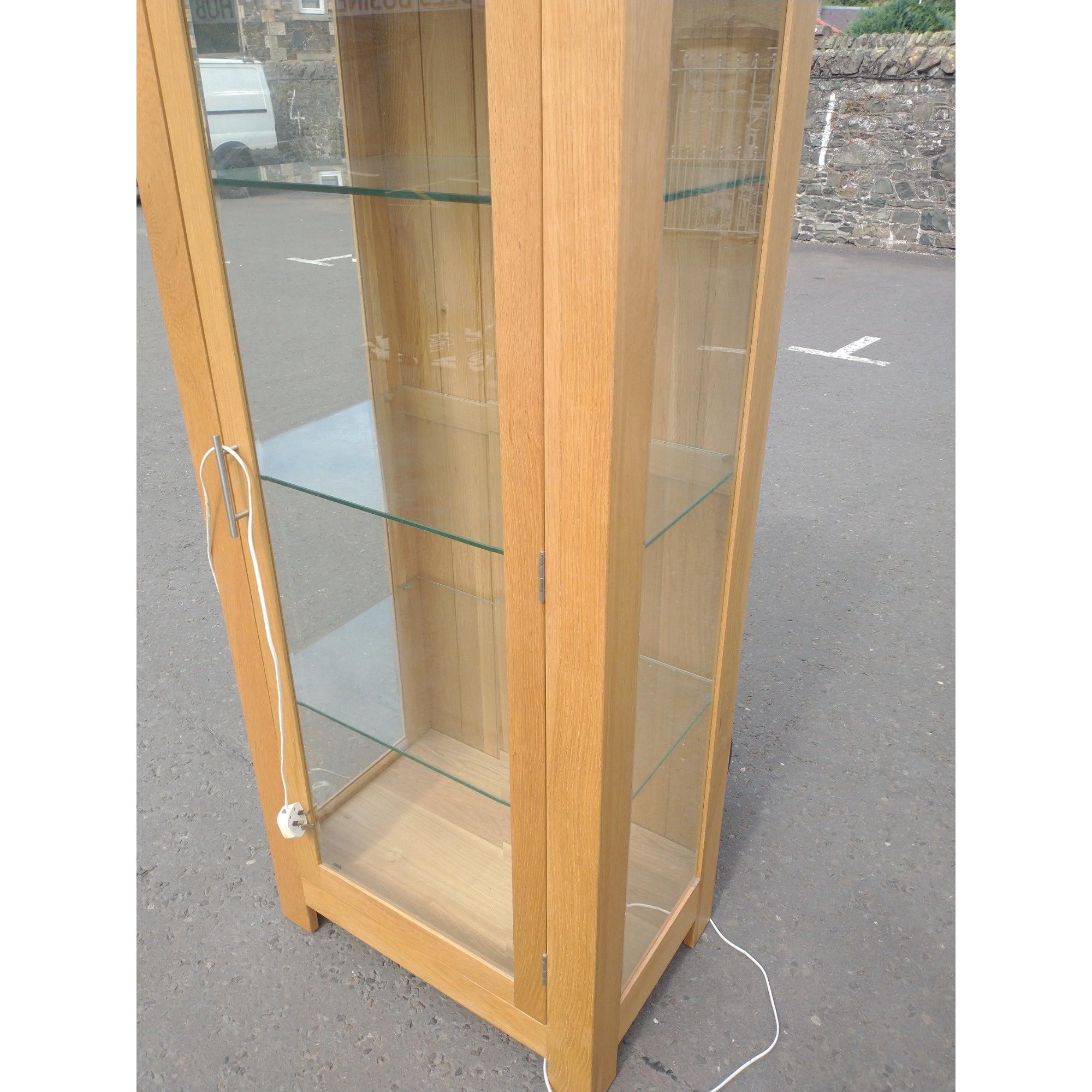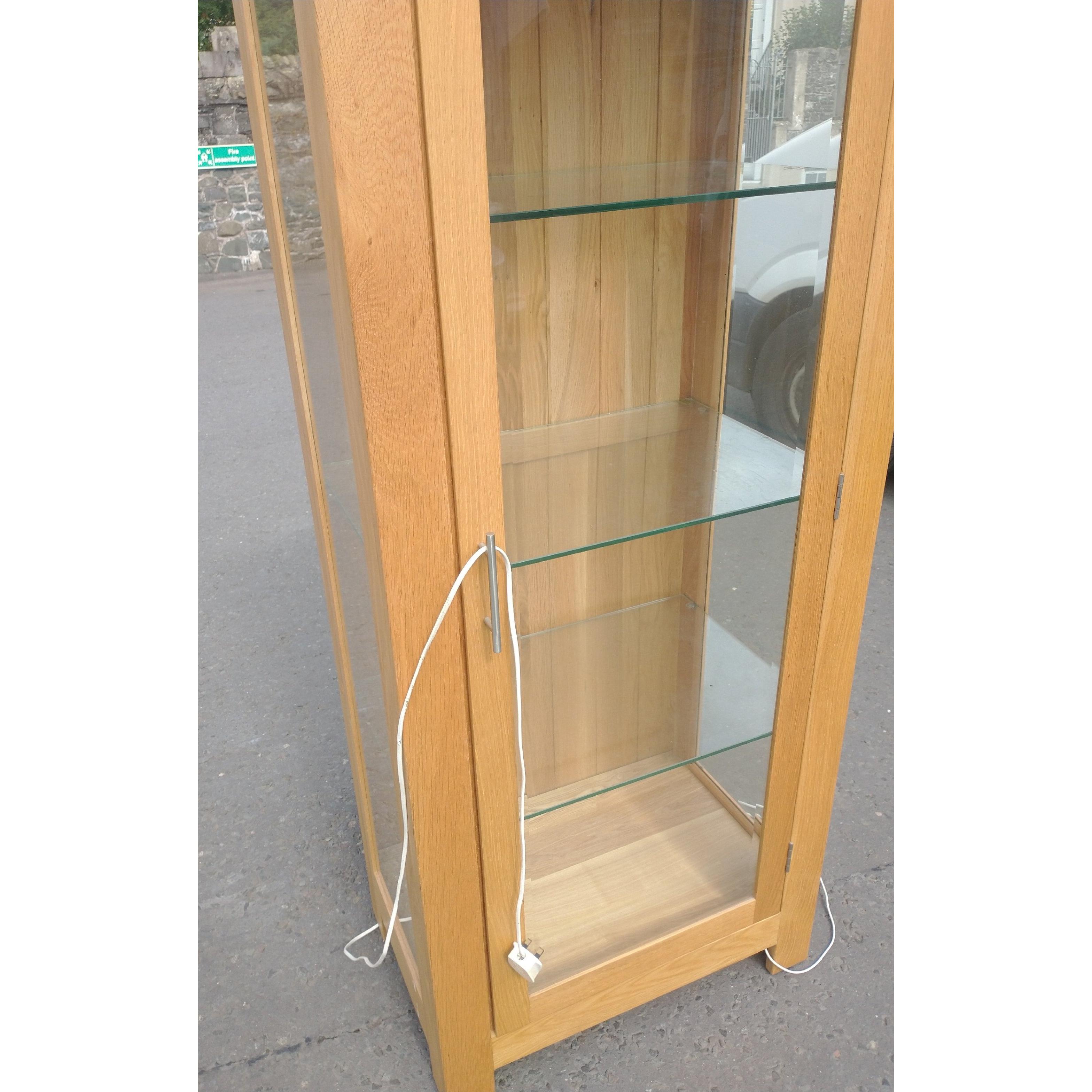 OAK wood modern display case with glass side and 3 glass shelves 178cm tall x 70cm width x 45cm depth approx - this cabinet lights-up electrically 240 volt plug-in - in nice condition!