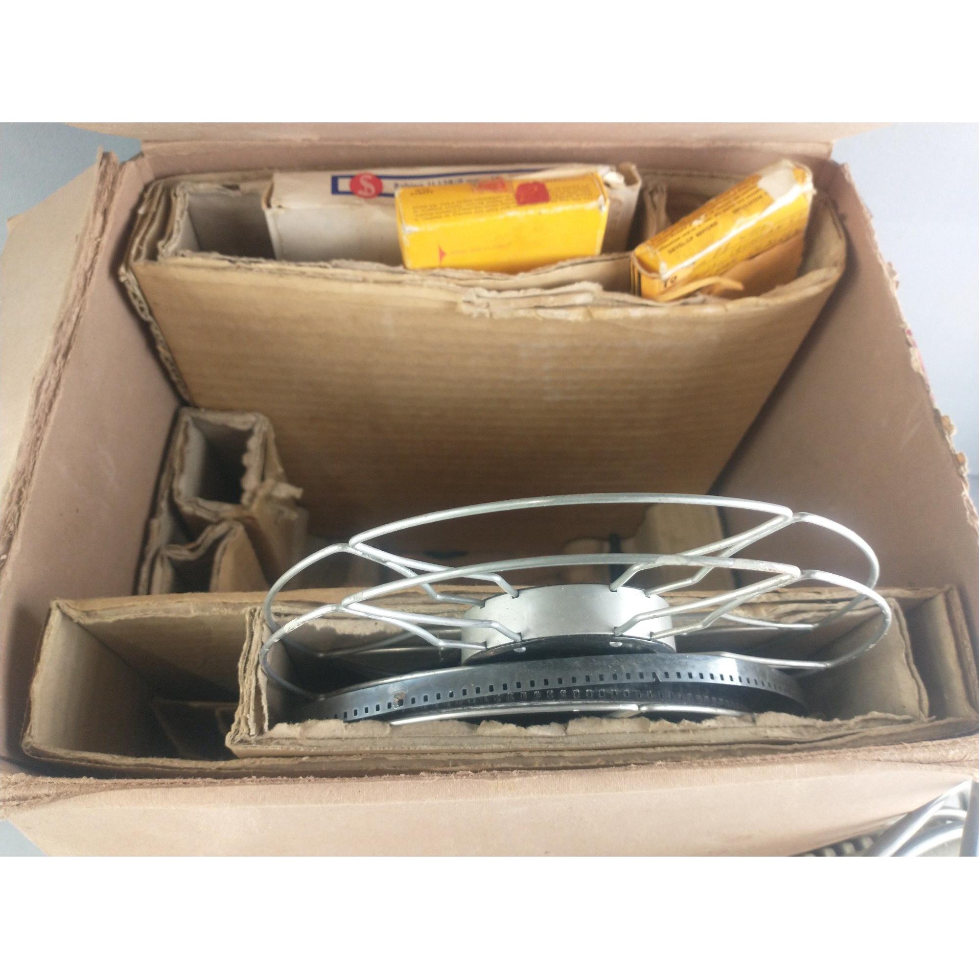 A boxed EUMIG P8M Austrian made movie projector in box with splicer and some film.