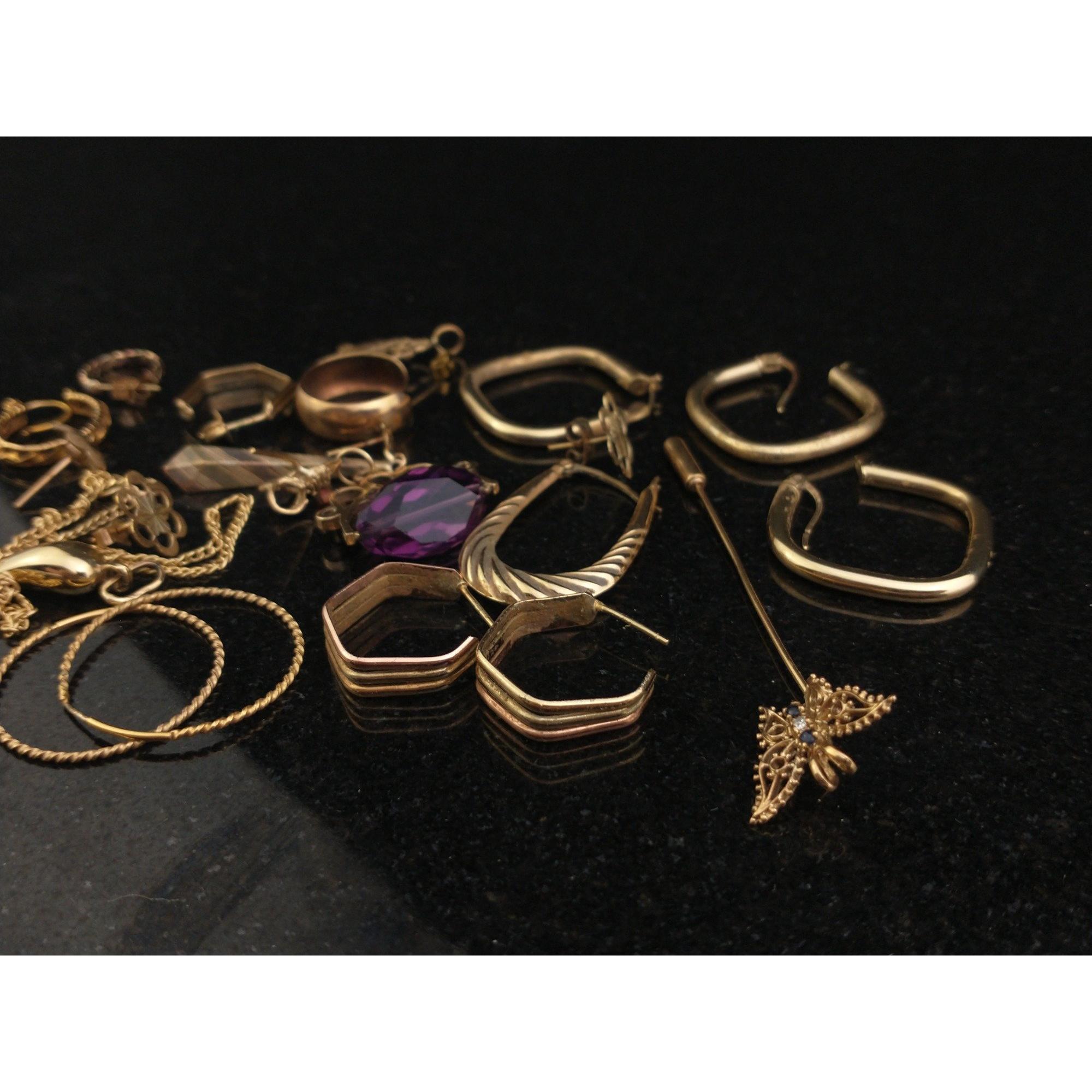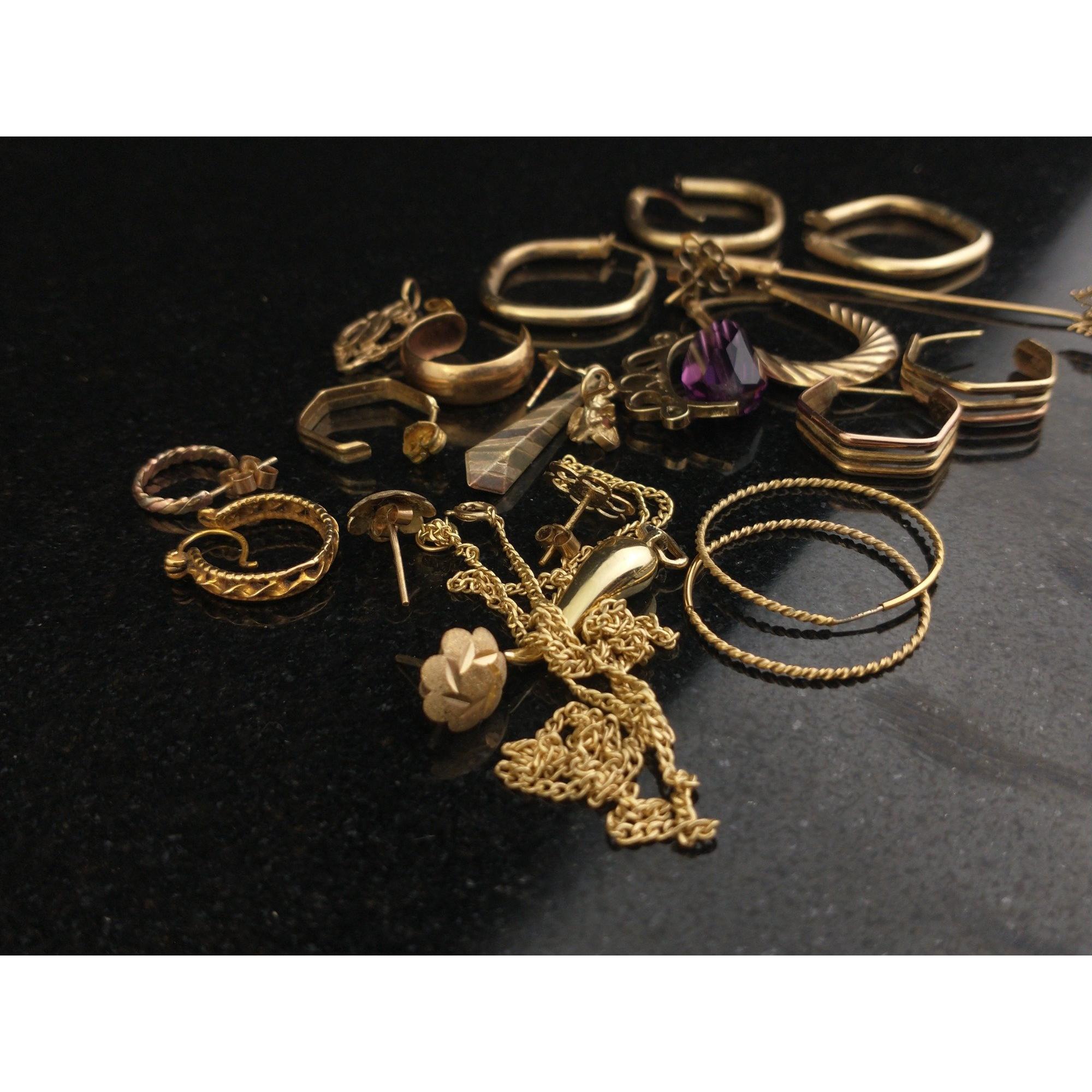 A PIRATES HOARD! A quantity of stamped 9ct / 375 jewellery pieces such as earrings, chain etc. Total weight 20.2g approx Plus a 375 stamped fob with large amethyst coloured glass stone, gross weight 4.4g approx