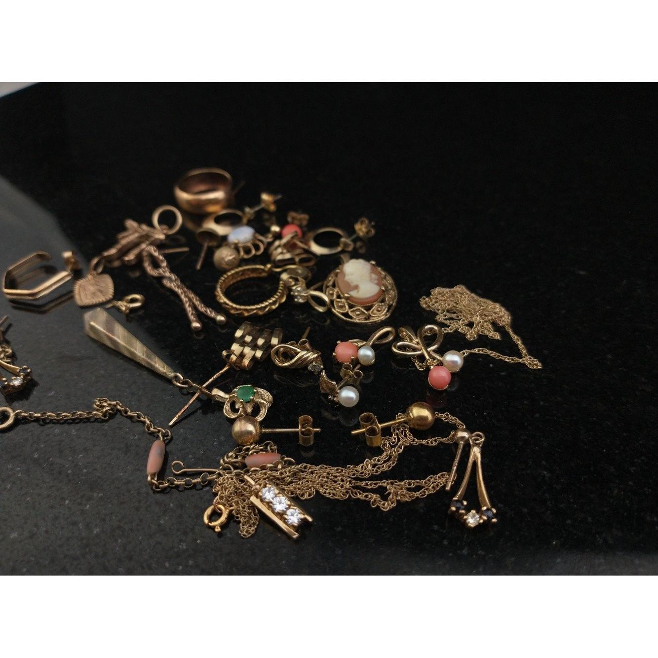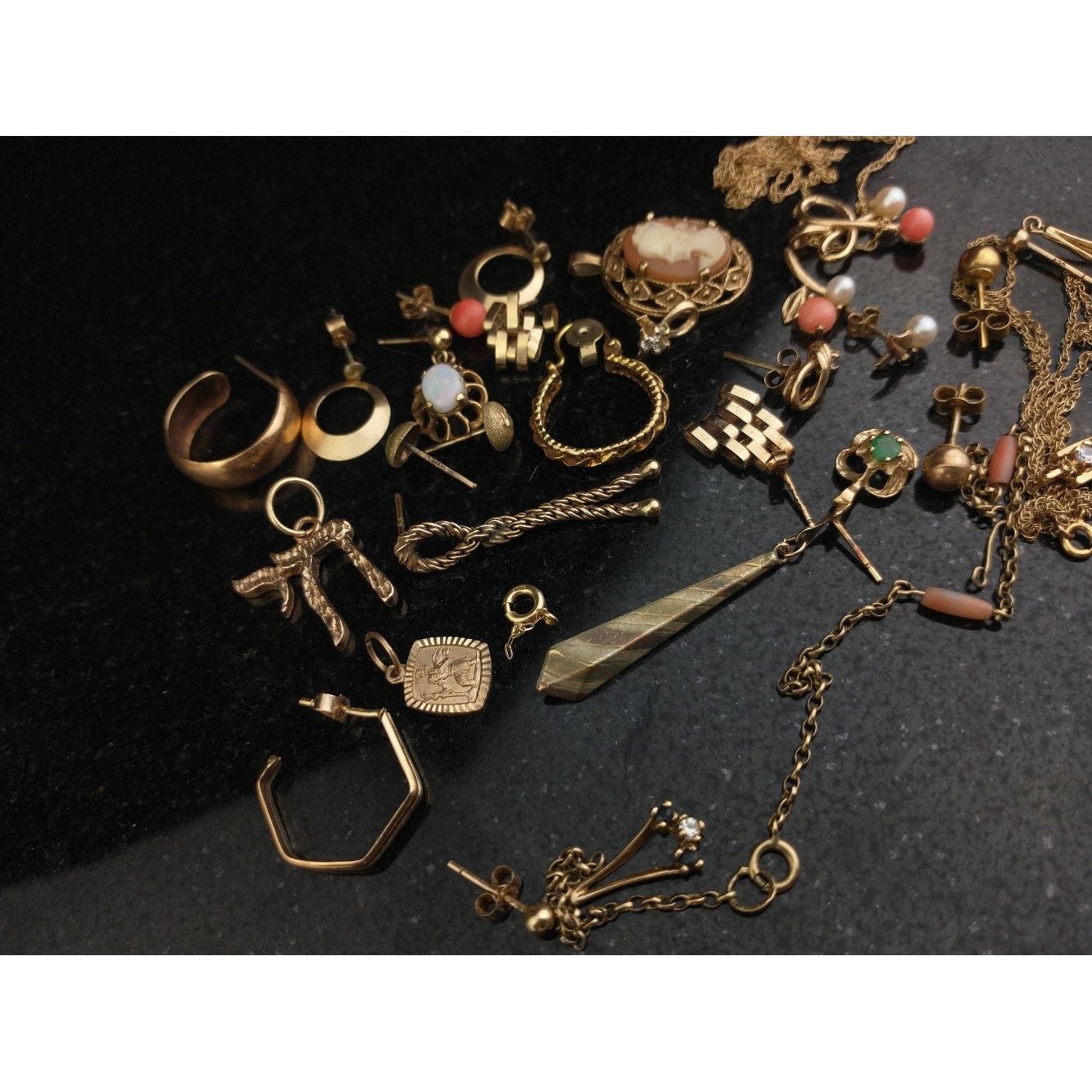 A small quantity of 9ct / 375 marked jewellery pieces. Earrings, chains etc, minor stones, gross weight 21.5g approx