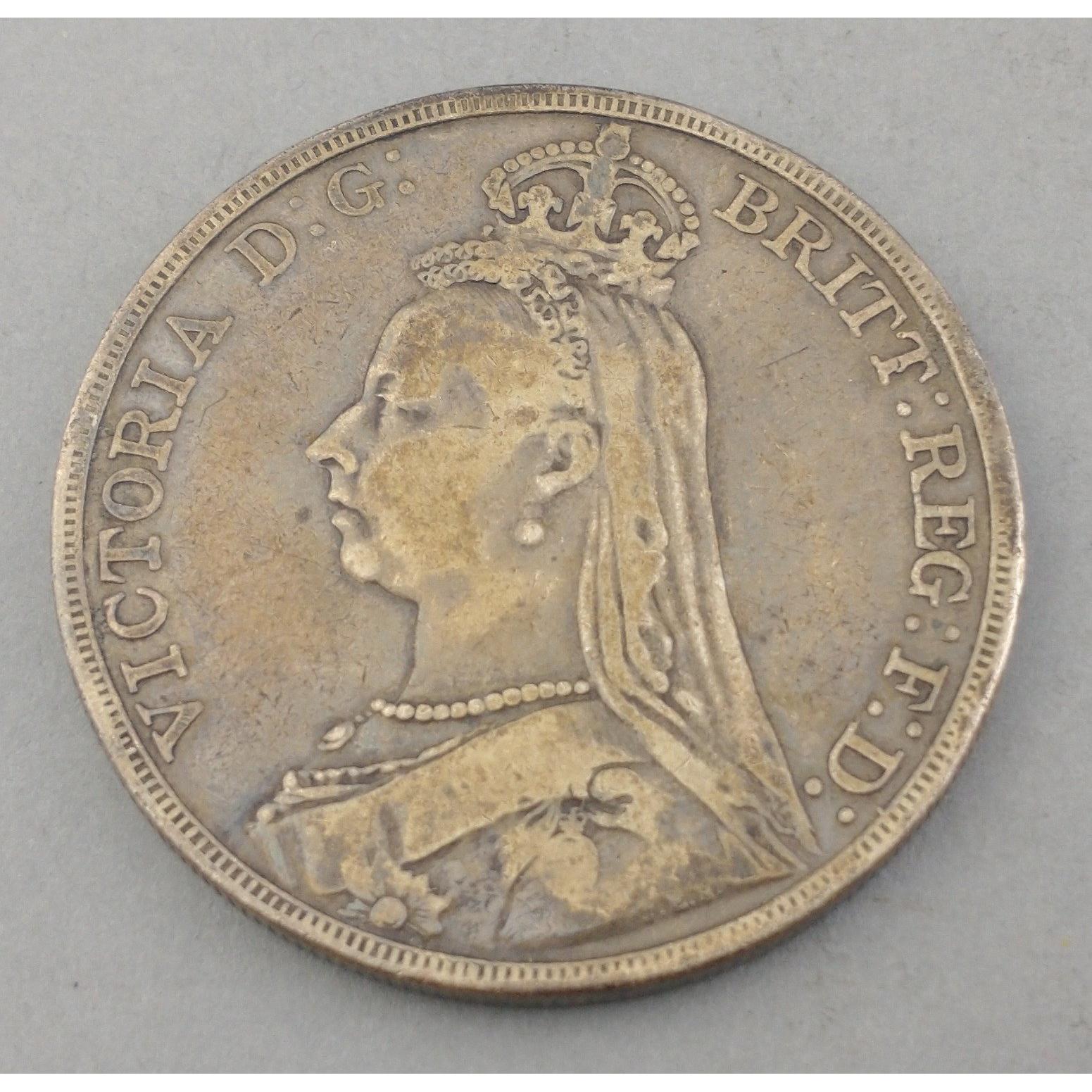 A 1892 Victoria silver crown coin. Overall good detail with toning.