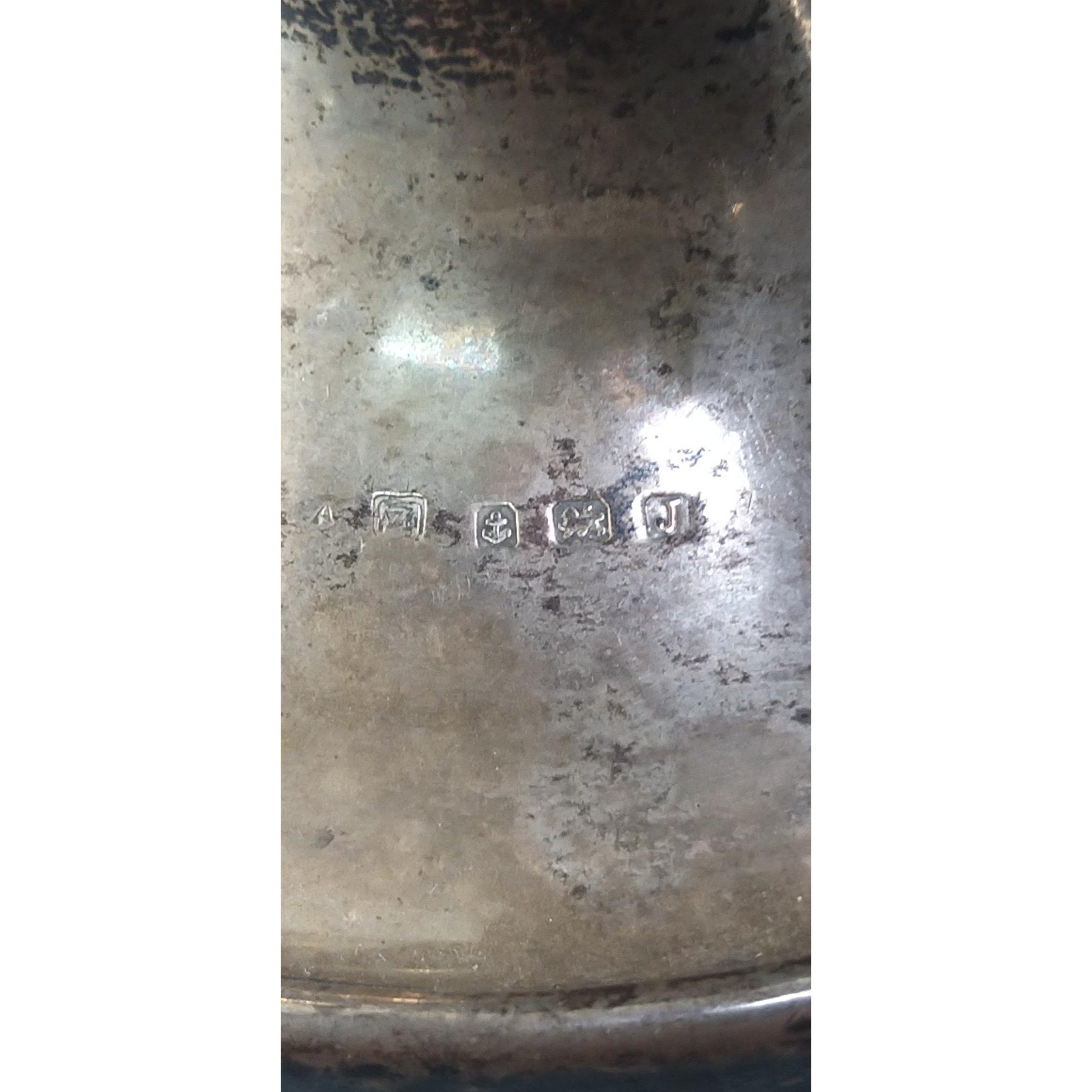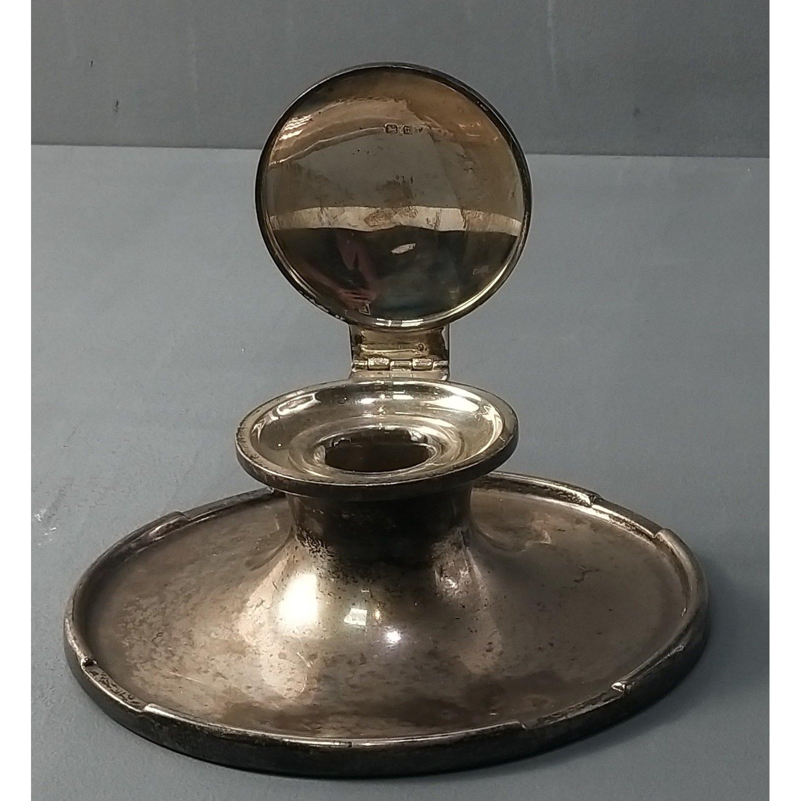 A Capstan Deco style STERLING SILVER desk inkwell BIRMINGHAM 1933. Weighted base, gross weight 590g approx, 15cm diameter approx. Retaining glass ink well hallmarked to base and cover