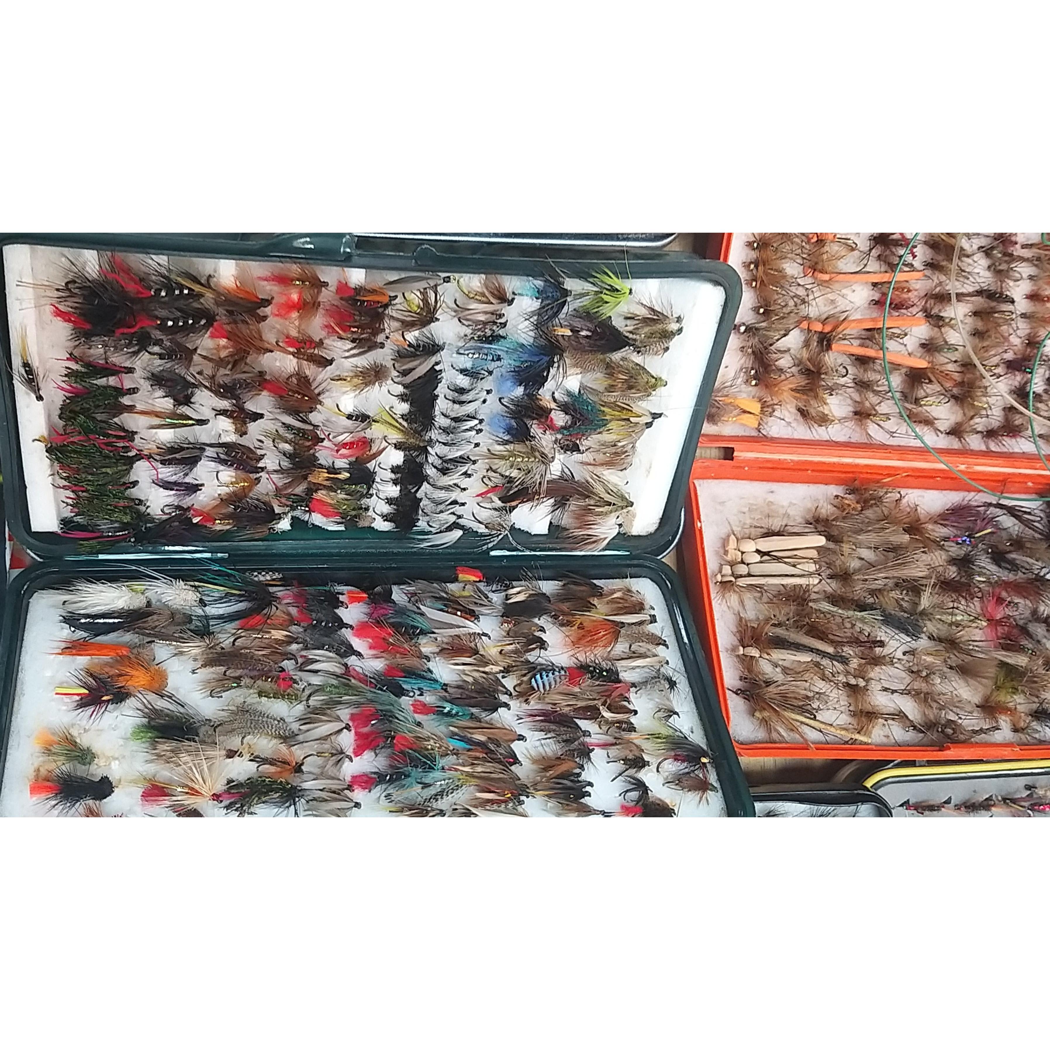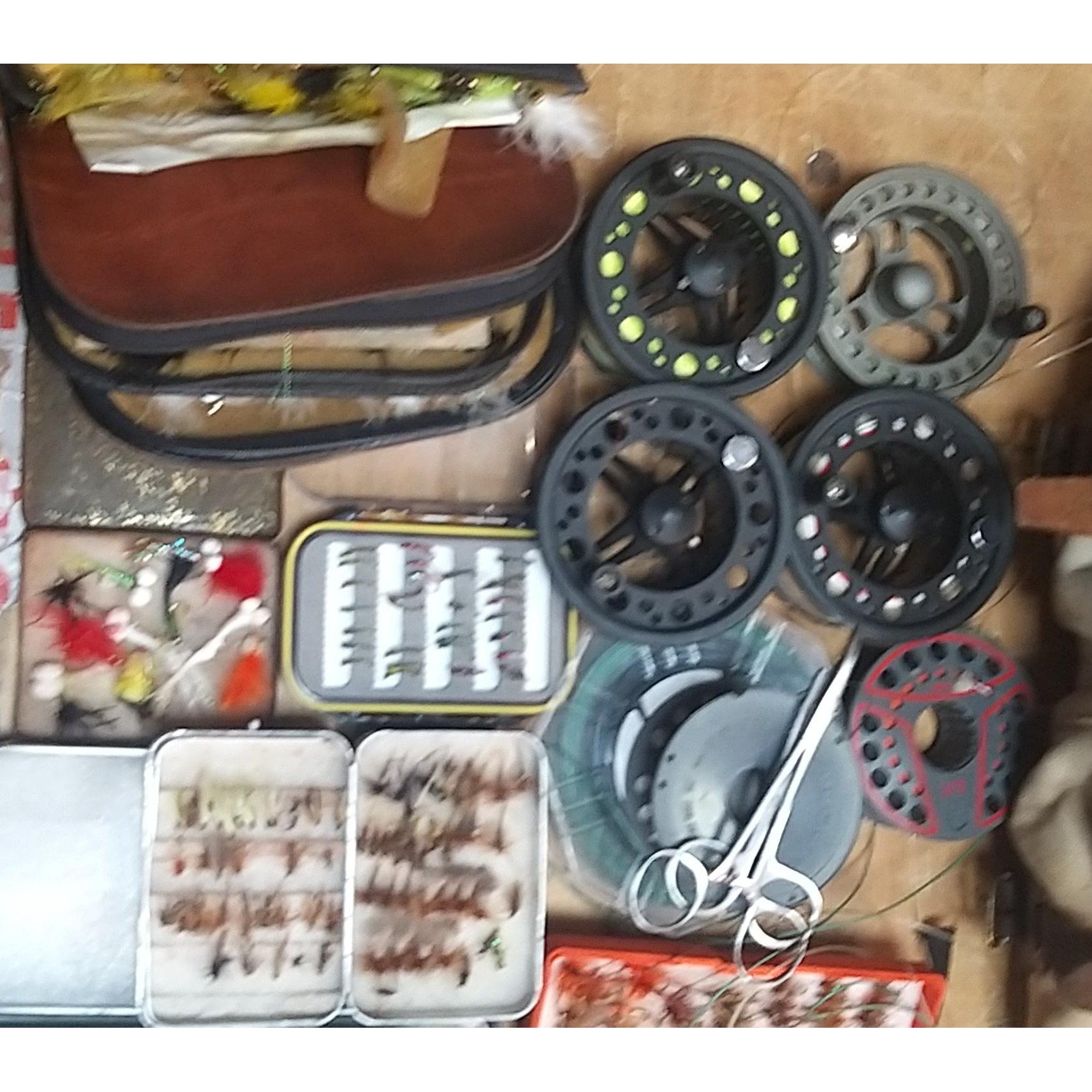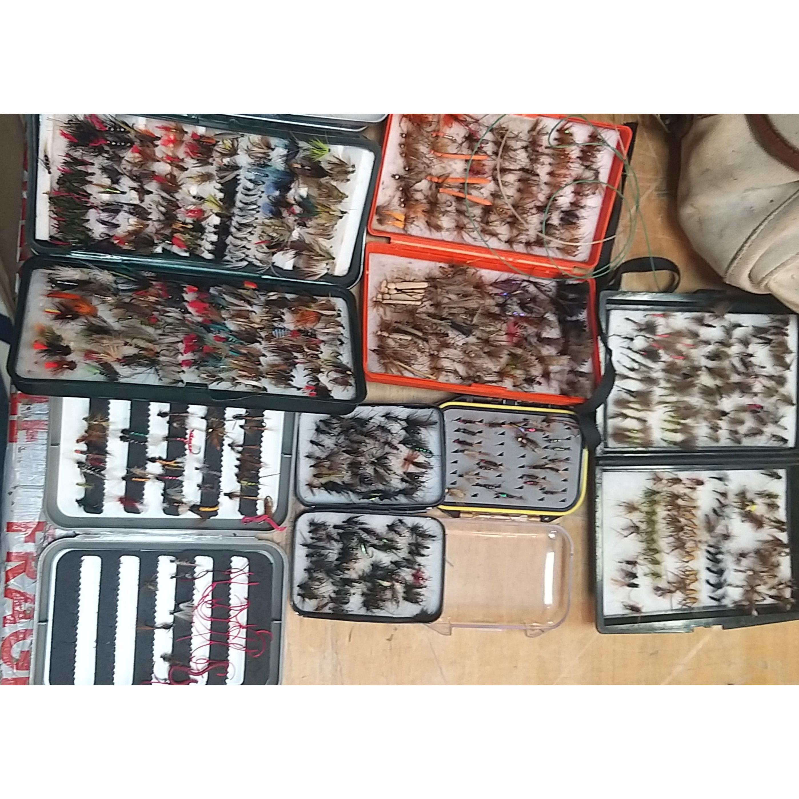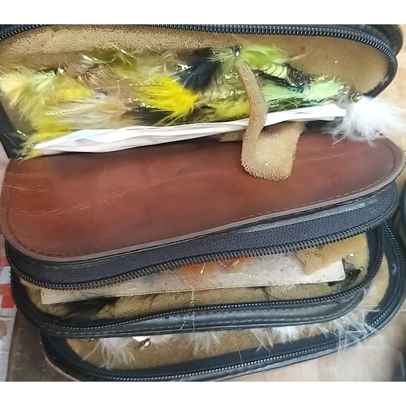 A good quality BRADY canvas fishing tackle bag containing a super collection of many assorted fishing flies, spools, fishing glasses, priest, etc