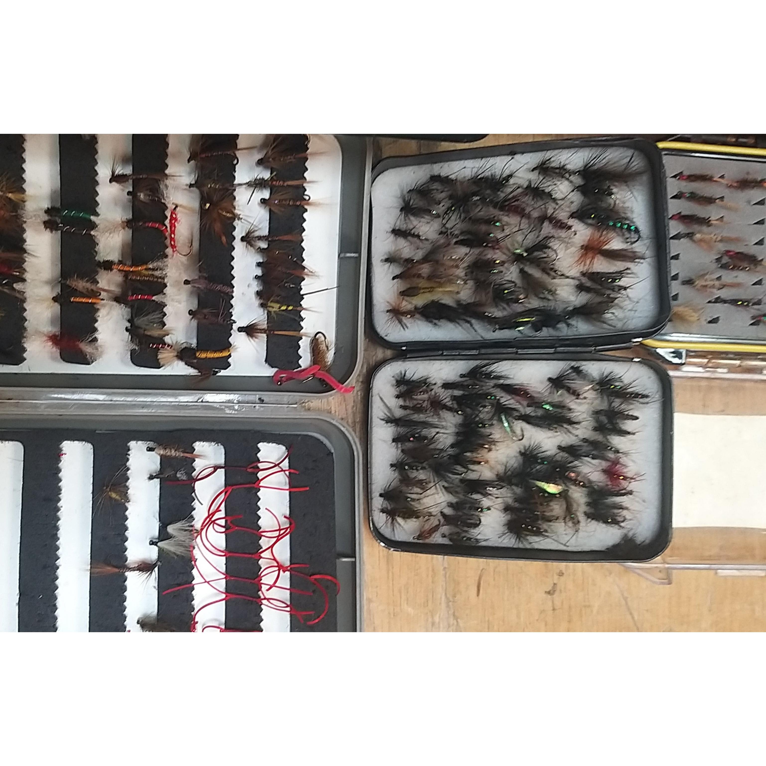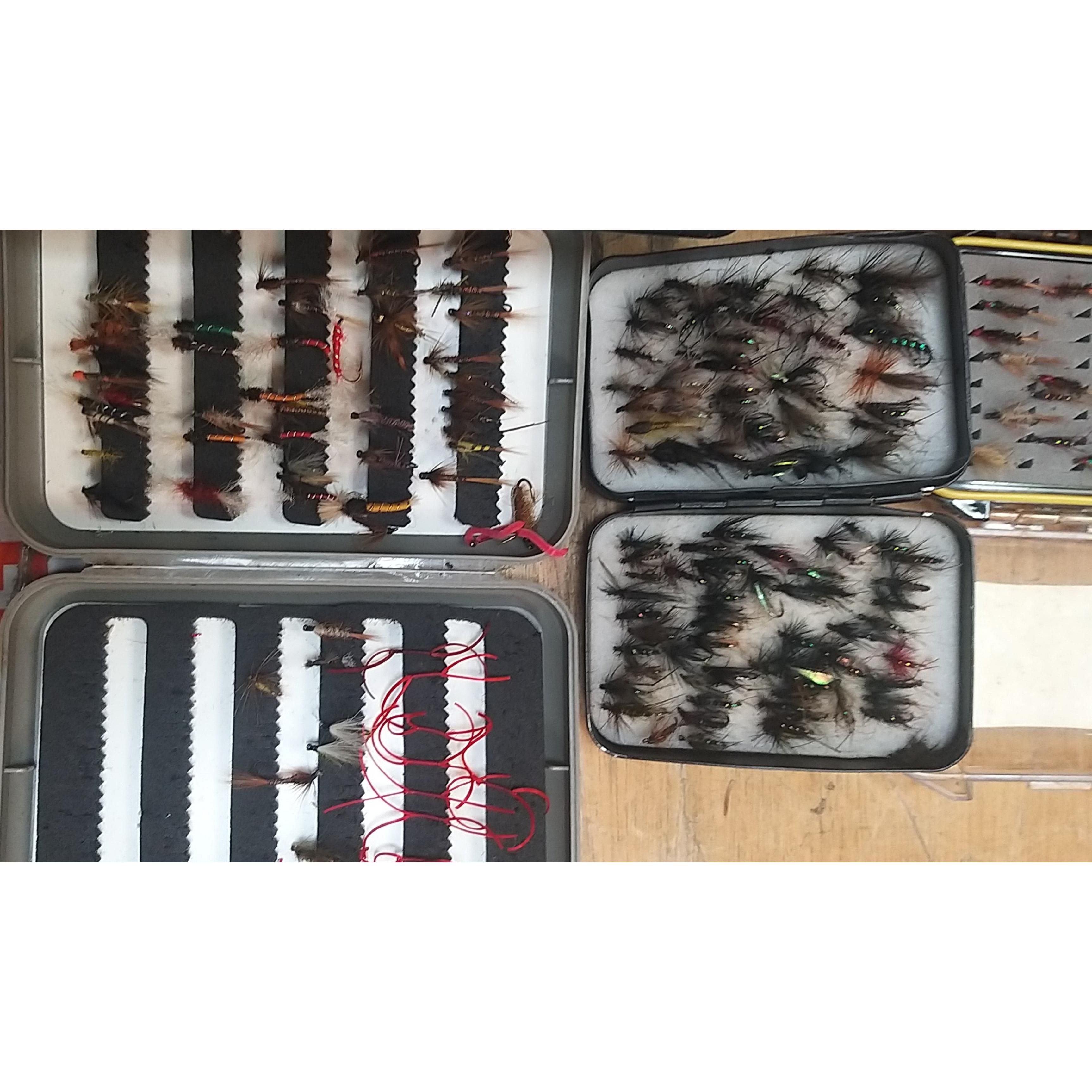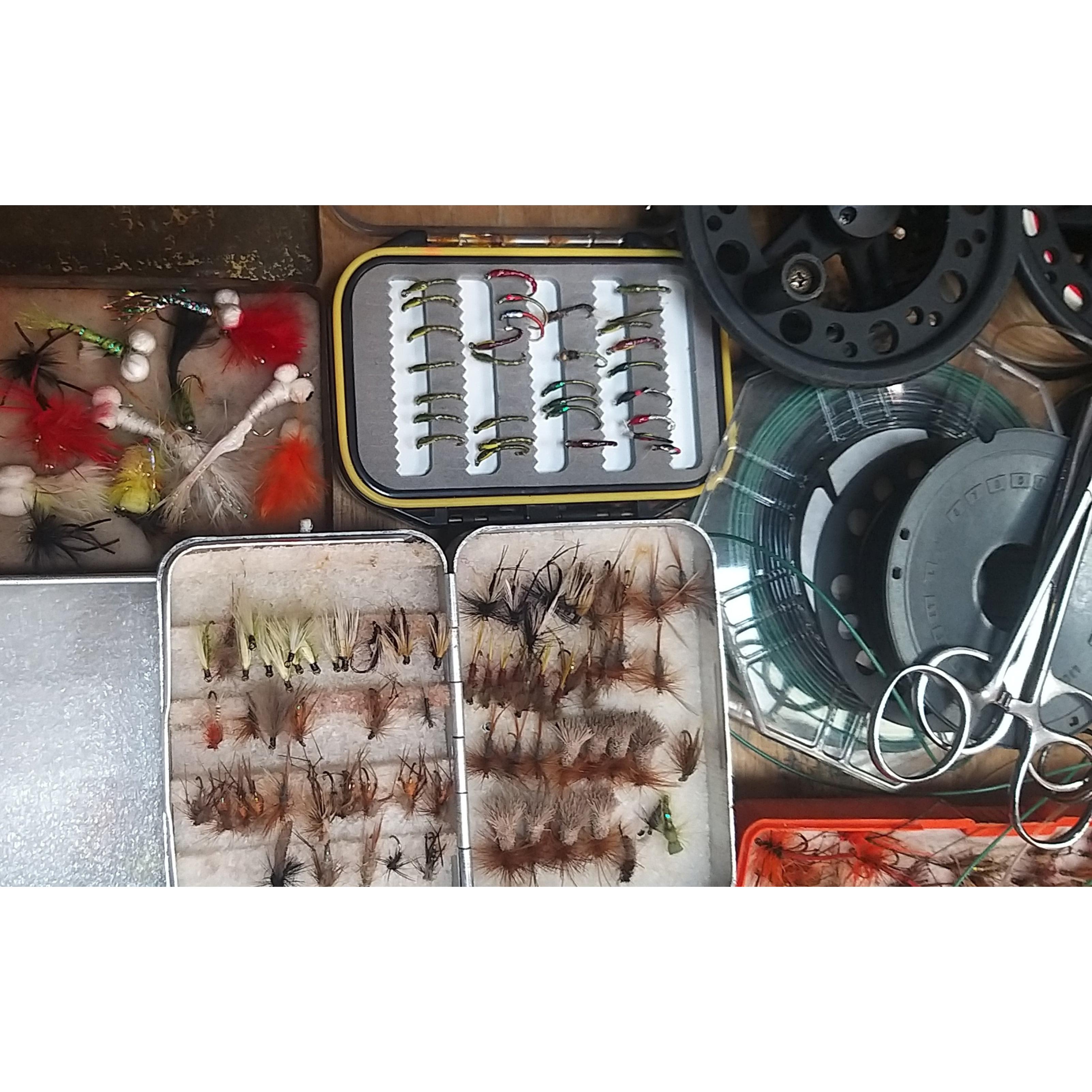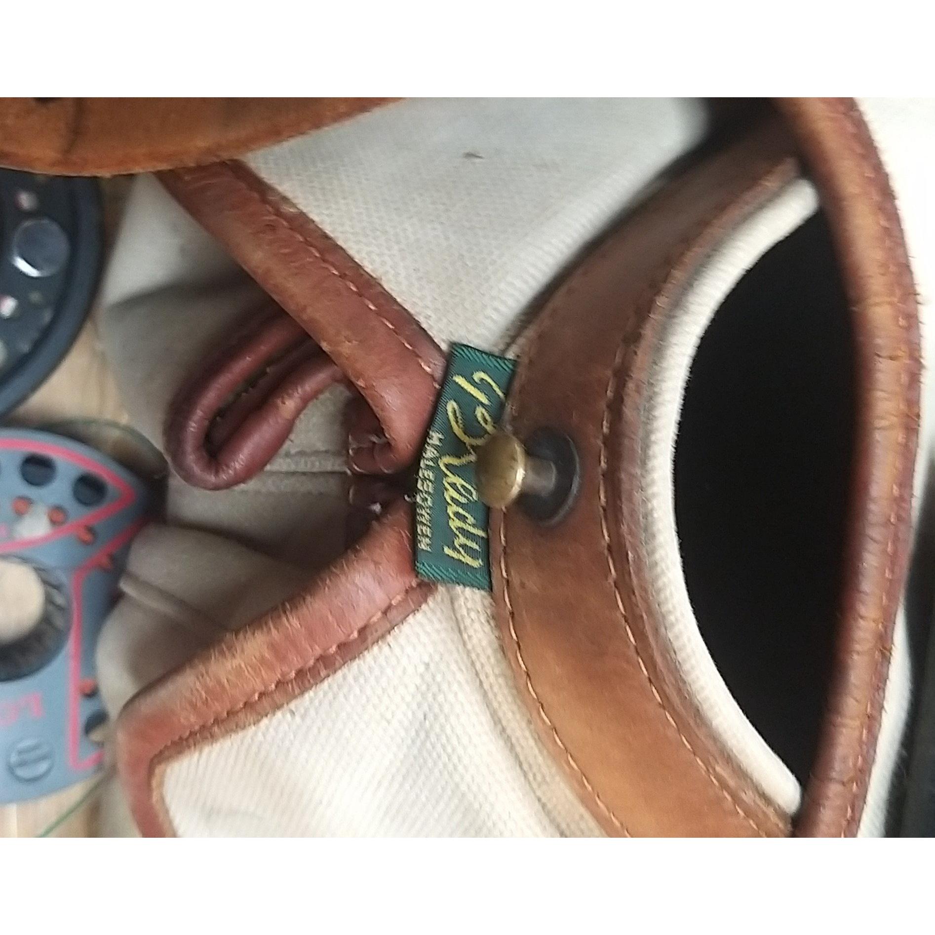 A good quality BRADY canvas fishing tackle bag containing a super collection of many assorted fishing flies, spools, fishing glasses, priest, etc