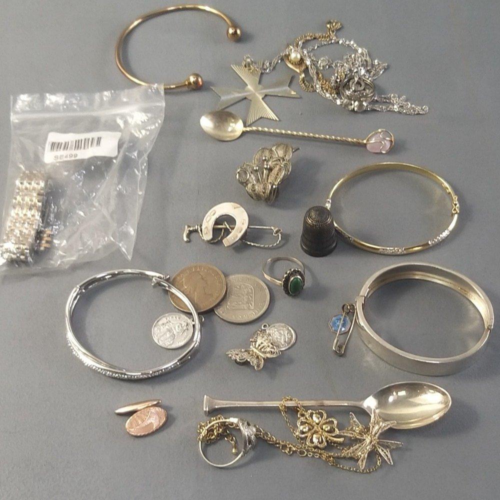 A small collection of dress jewellery to include a silver horseshoe brooch and a silver bangle plus some filigree brooches and more