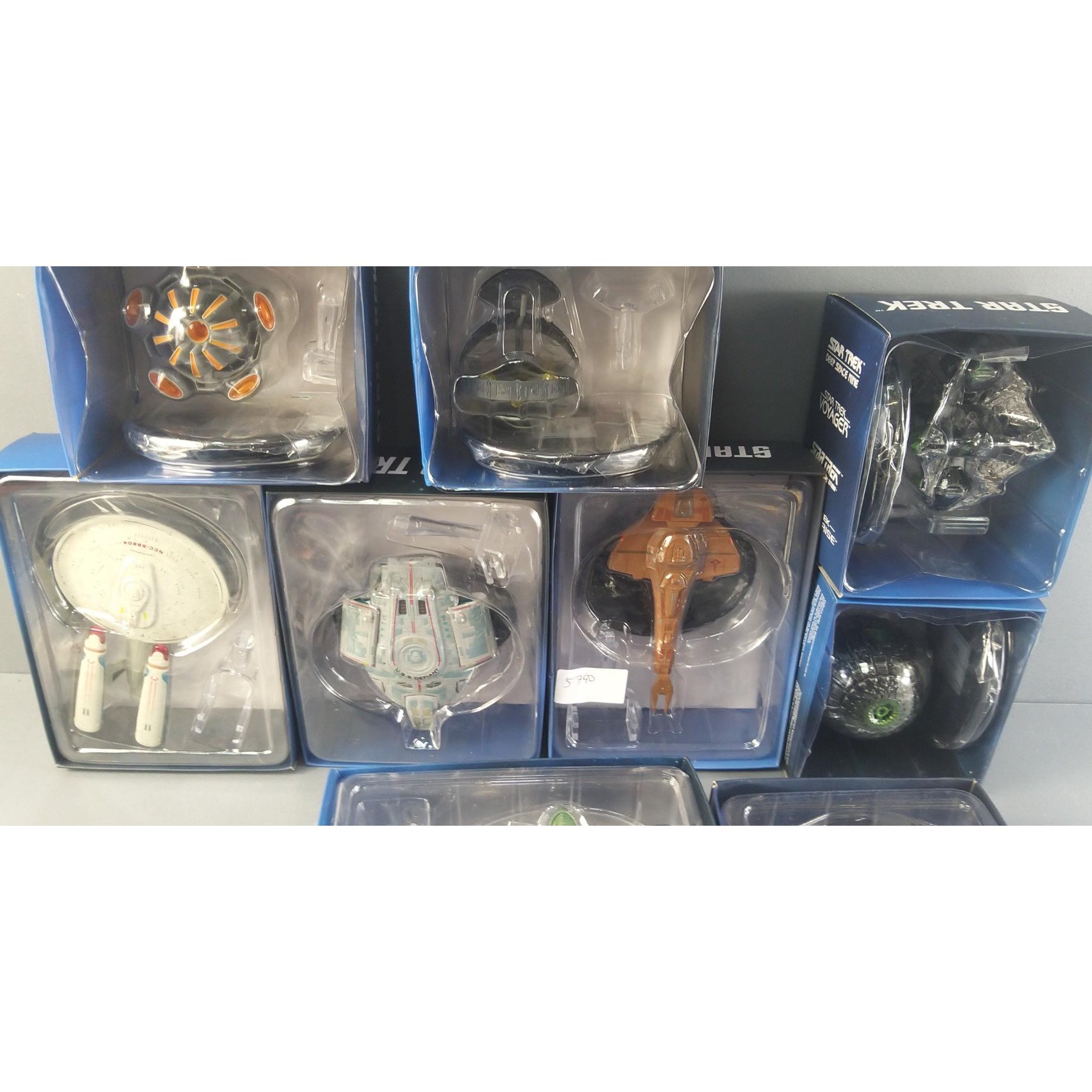 Eaglemoss STAR TREK models to include BORG QUEEN'S SHIP (8178-A/A), EYMORG ION DRIVE SHIP (4107-A/A), ORION SHIP (1846-A/A), BORG SPHERE (4747-A/A), KLINGON BIRD-OF-PREY (5339-A/A), B'OMAR PATROL SHIP (5102-A/A), NIAGRA CLASS (6144-A/A), GALOR CLASS (0783-A/A), USS DEFIANT NX-74205 (7177-A/B), XINDI INSECTOID VESSEL (3081-A/K), USS ENTERPRISE NCC-1701-D (8332-A/E), and one other complete with Star Trek : The Official Starships Collection, Issue 93. All in good condition in original boxes and Perspex protection. Eleven pieces in total.