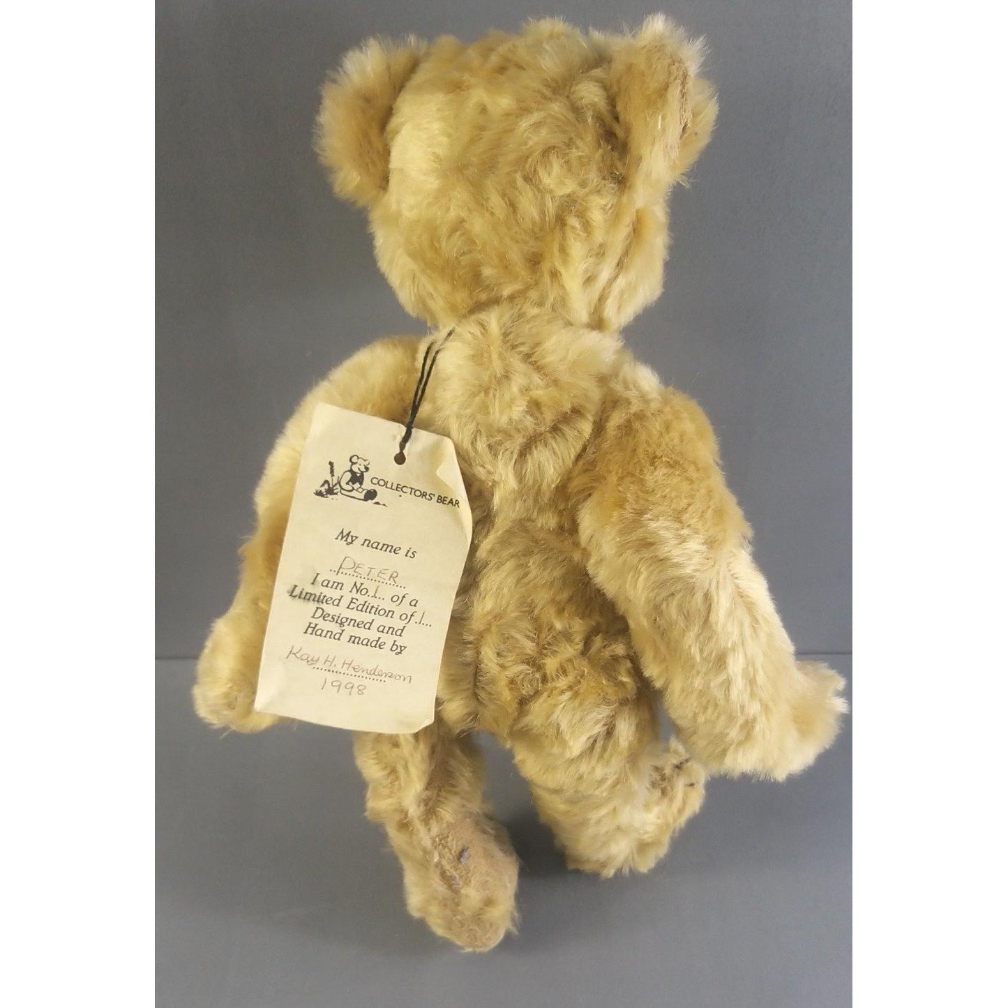 A KAY HENDERSON teddy called Peter in a limited edition of 1made in 1998. Stands 27cm high approx. Shows some signs of wear but retains a friendly wee face.Approx 1 pieces