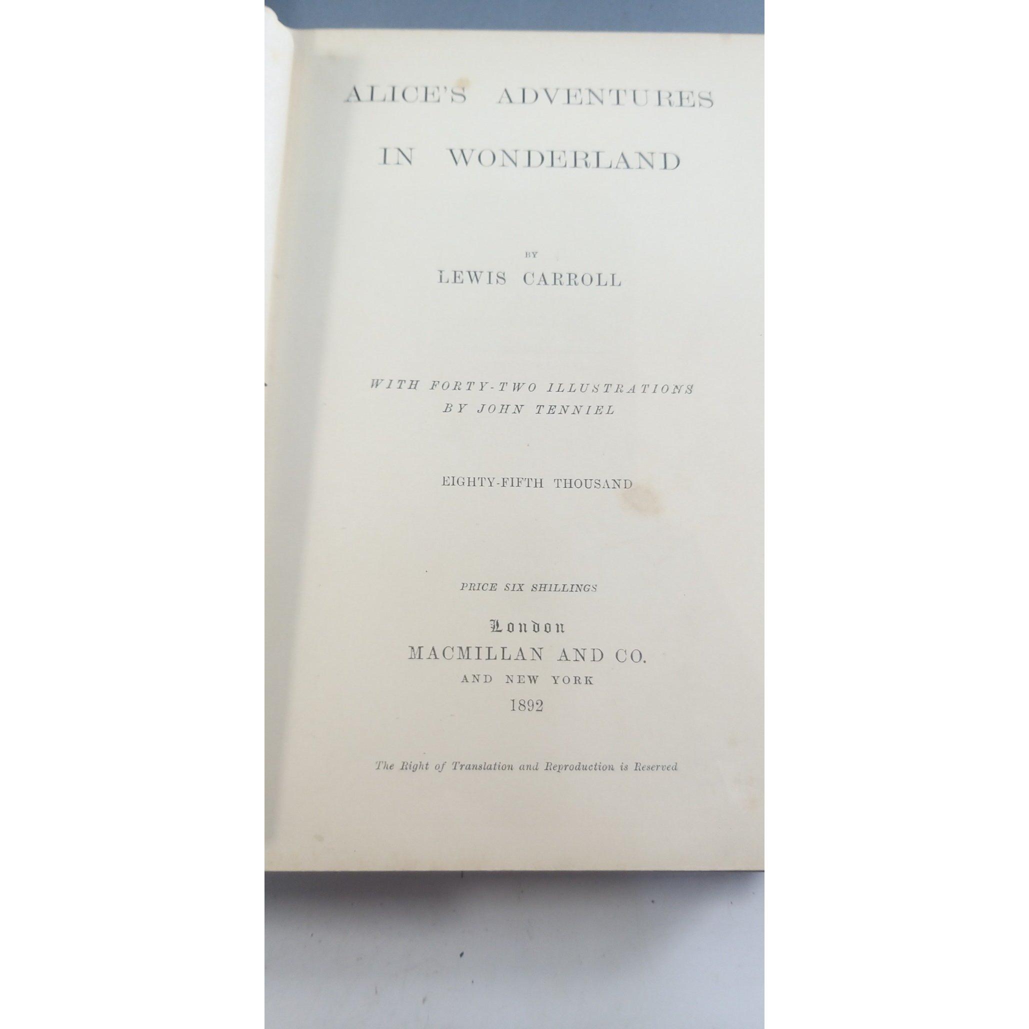 ALICE'S ADVENTURES IN WONDERLAND by Lewis Carroll, with 42 illustrations by John Tenniel, eighty-fifth thousand published 1892 by MacMillan. Red cloth binding with gilt lettering. Also THROUGH THE LOOKING-GLASS AND WHAT ALICE FOUND THERE by Lewis Carroll with 50 illustrations by John Tenniel, twenty-sixth thousand published by MacMillan 1895. Some foxing and a few loose pages