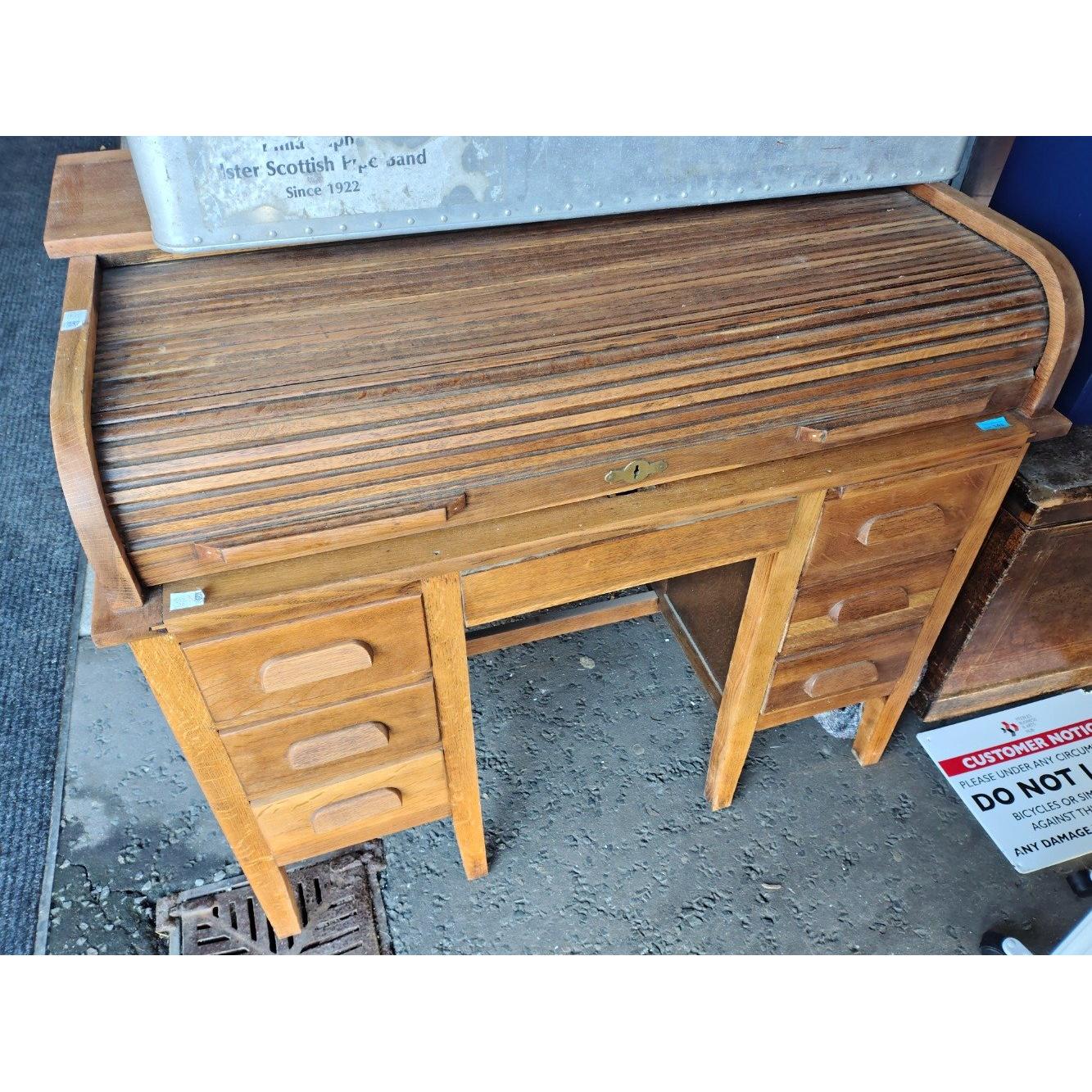 ANTIQUE - A SUBSTANTIAL light oak roll-top knee-hole desk with 6 drawers - the roller top is in good condition