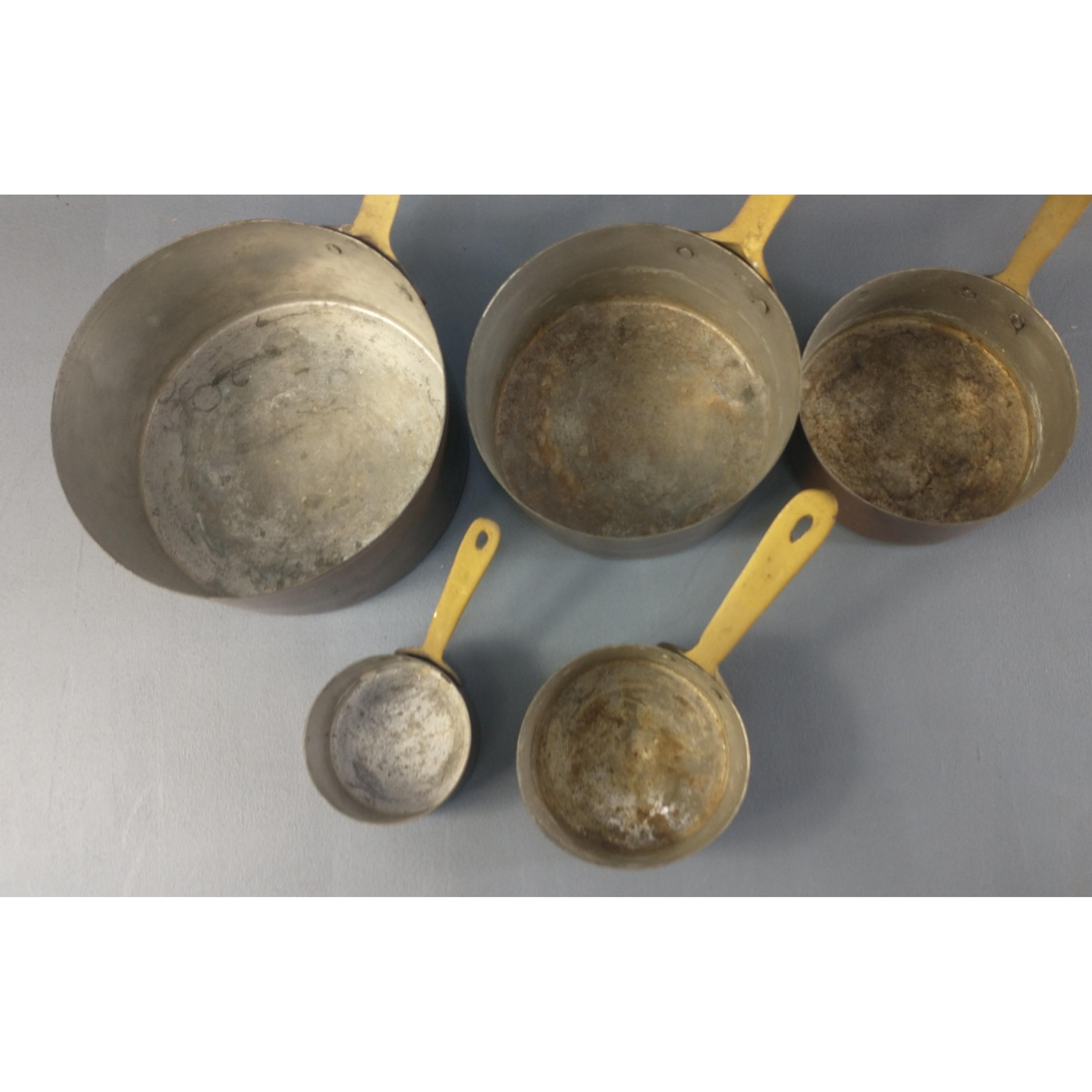 An ANTIQUE set of 5 brass and copper sauce pans - largest pan 16cm diameter approxApprox 5 pieces