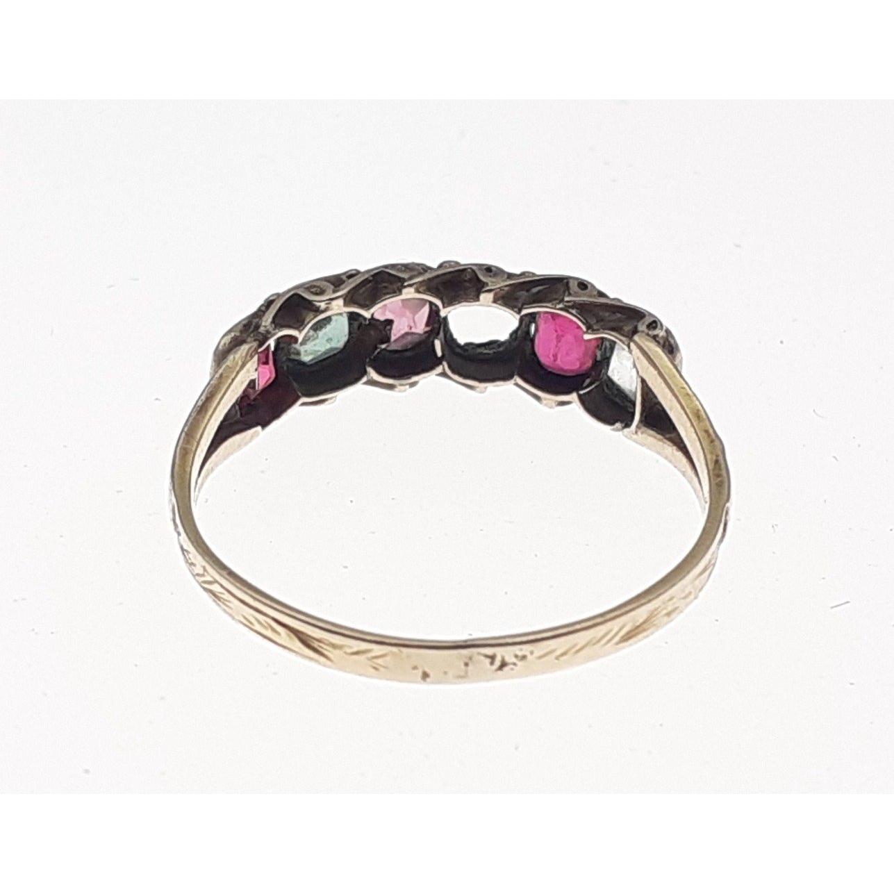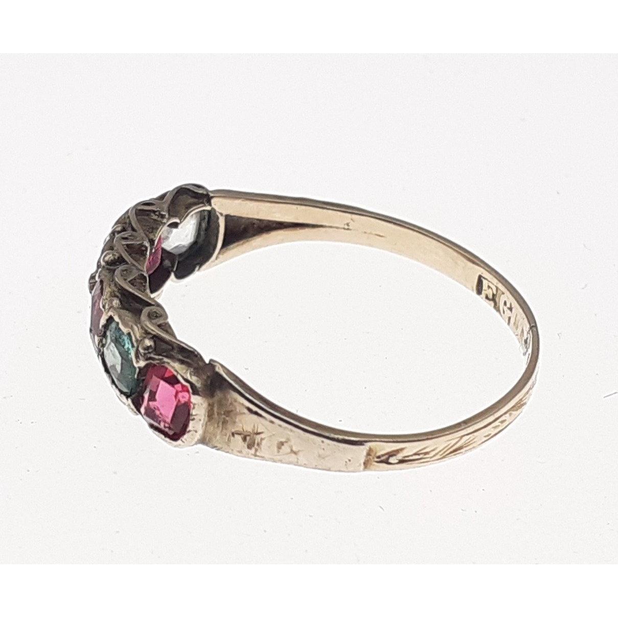 A pretty VICTORIAN acrostic ring with one gem missing - worn hallmark starting with a rubbed '1' - ring size L - gross weight 1.10g approx - comes with a vintage H Samuel jeweller's box