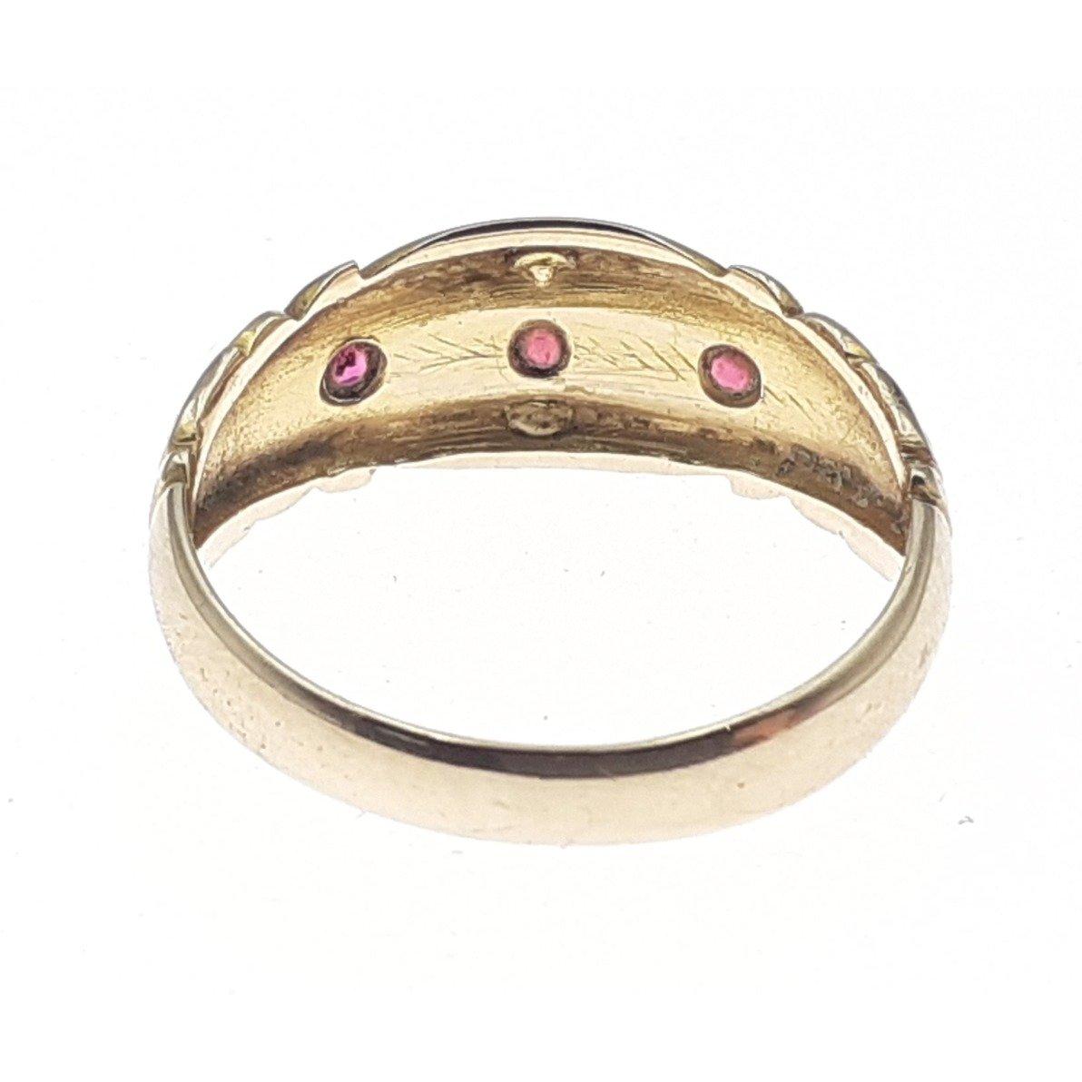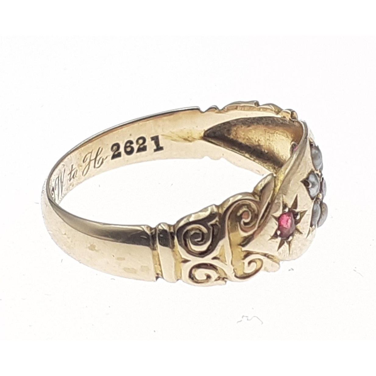 Victorian/Edwardian - marked for Chester 9ct - garnet and seed pearl gold ring size N - gross weight 1.99g approx - comes also with a vintage jeweller's box