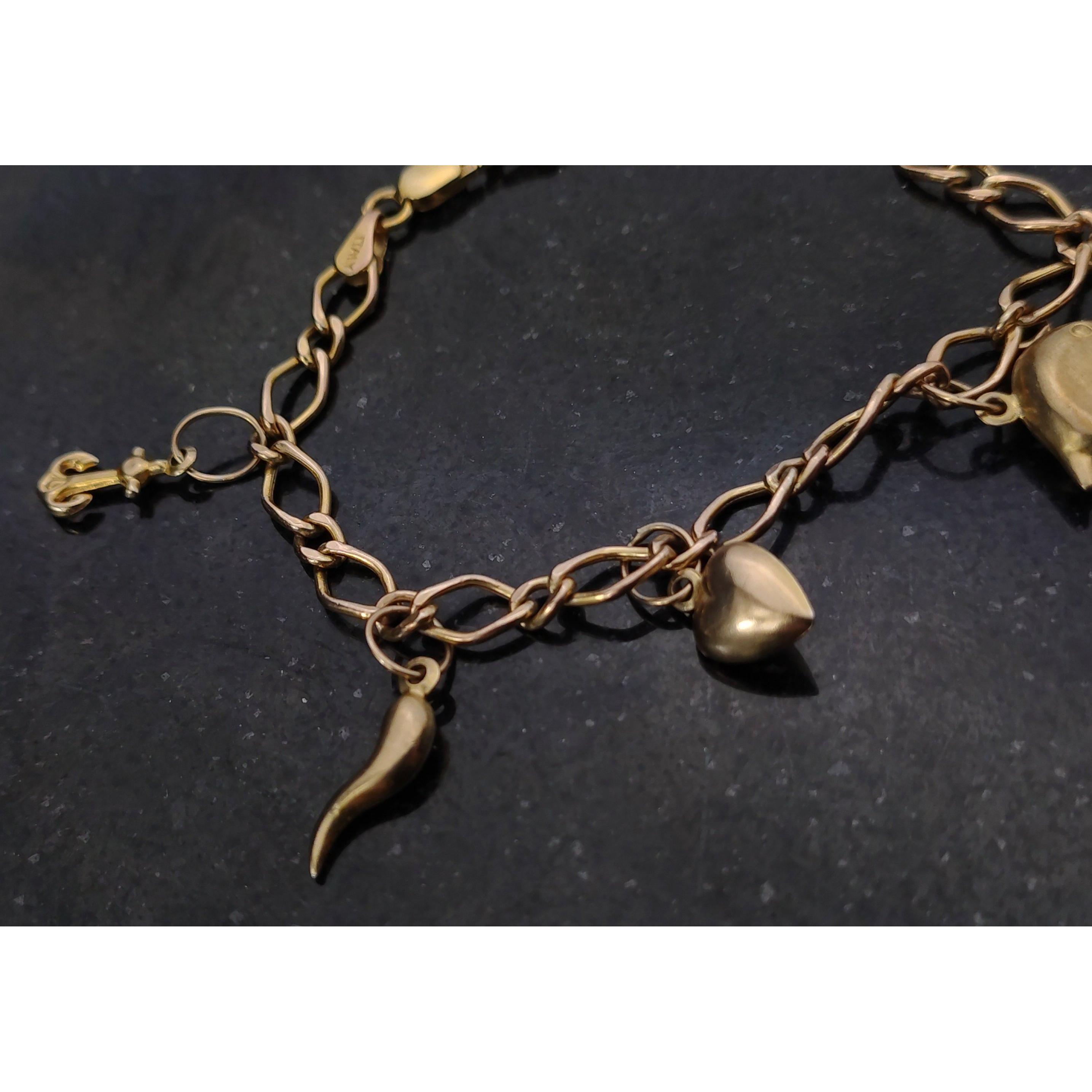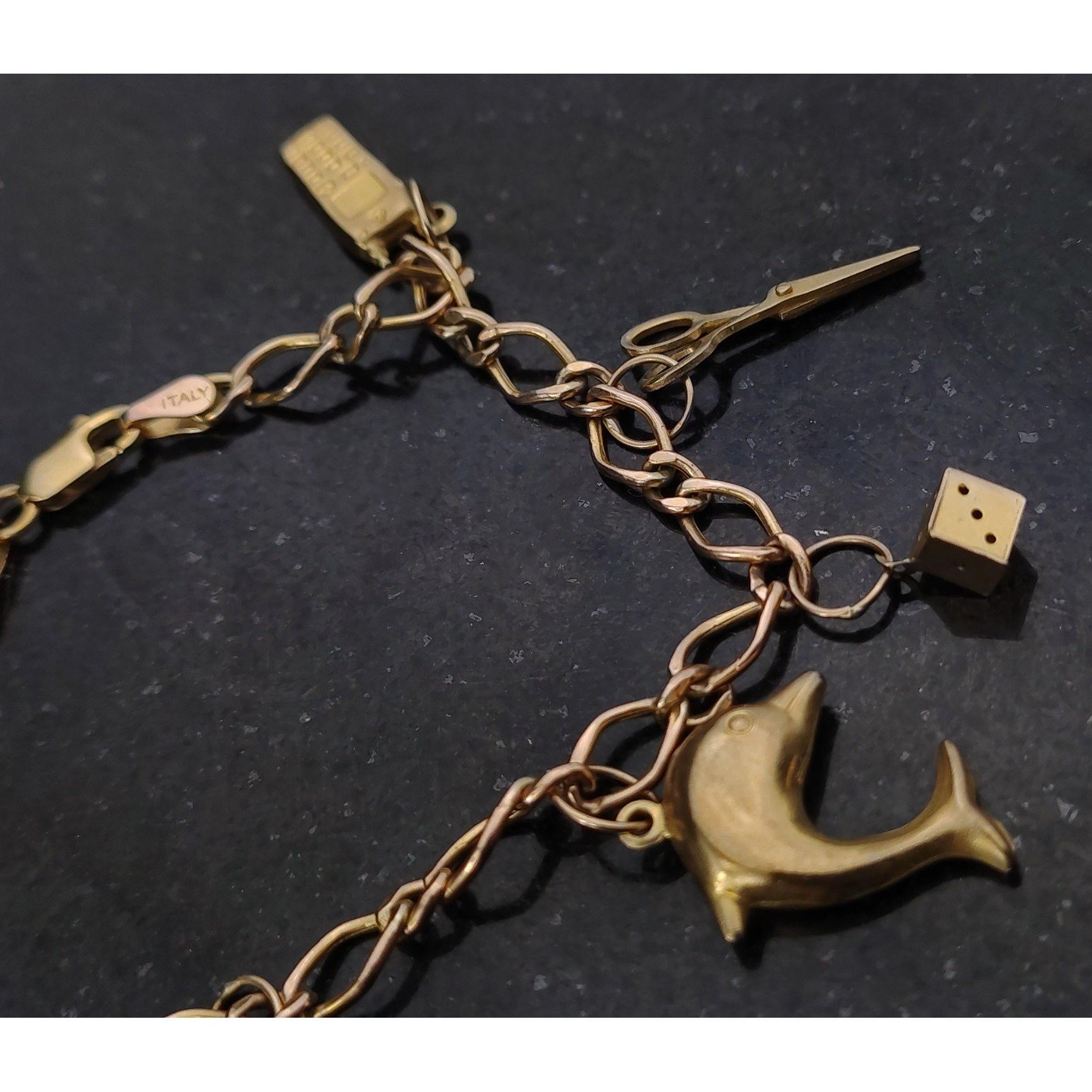 Fully hallmarked 9ct gold ITALY chain with seven unmarked charms, Anchor, Chilli, Heart, Dolphin, Dice, Scissors, Mobile Phone. Total gross weight 5g approx
