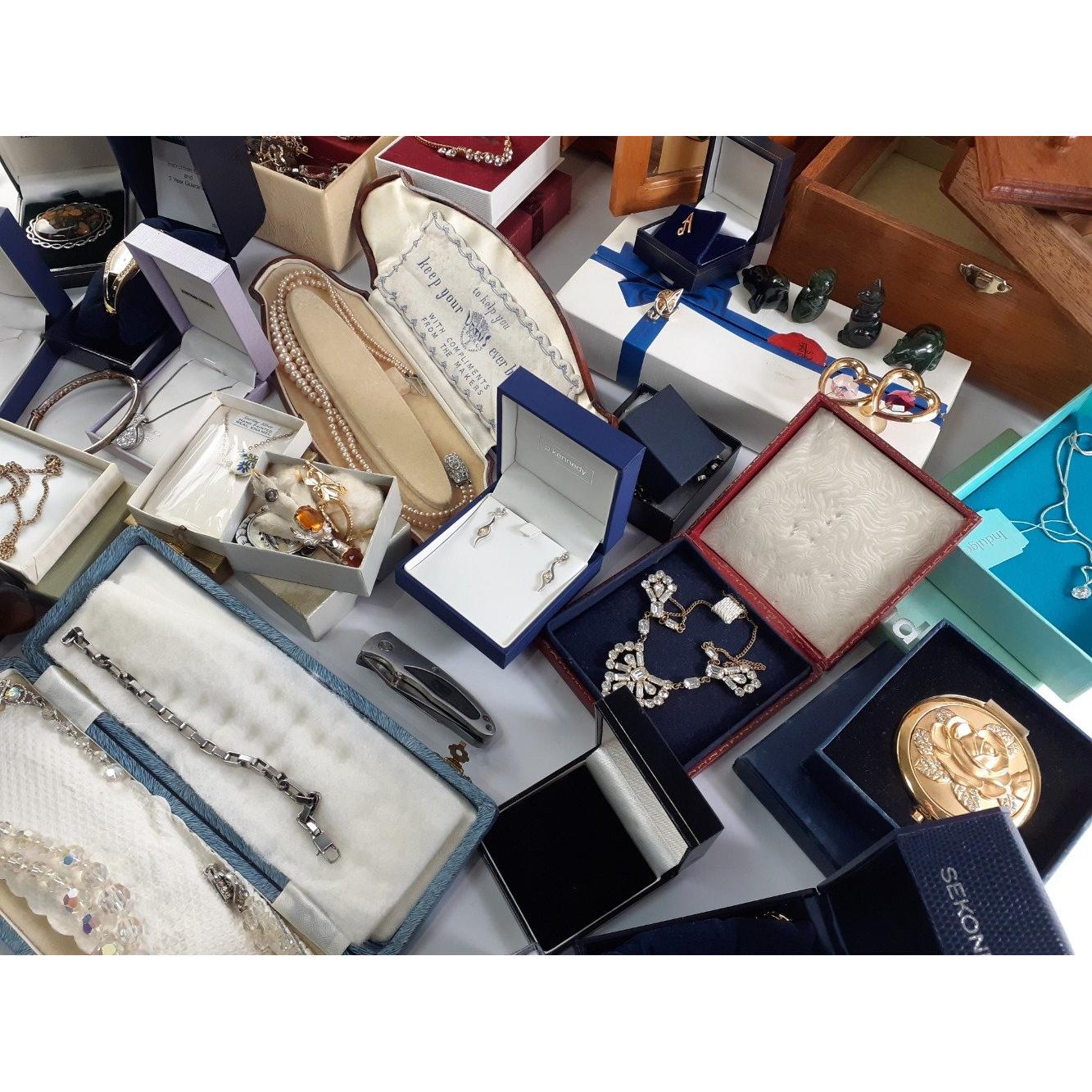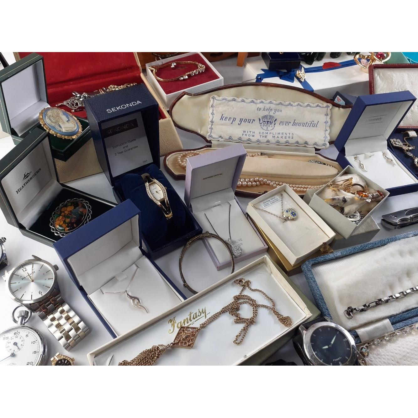 A super hoard of vintage and modern jewellery to include Heather Gems brooch, SEIKO Ladies Dress Watches, necklaces, pendants. Includes jewellery boxes and much, much else. A great lot with much of interest.