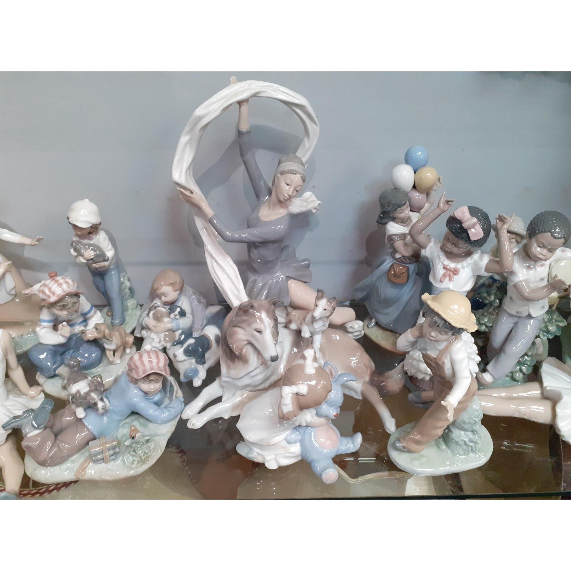 A large collection of LLADRO and NAO porcelain figures to include two substantial table lamps, ballerina's etc, - 11 in total including the table lamps - tallest table lamp 45cm tall approx