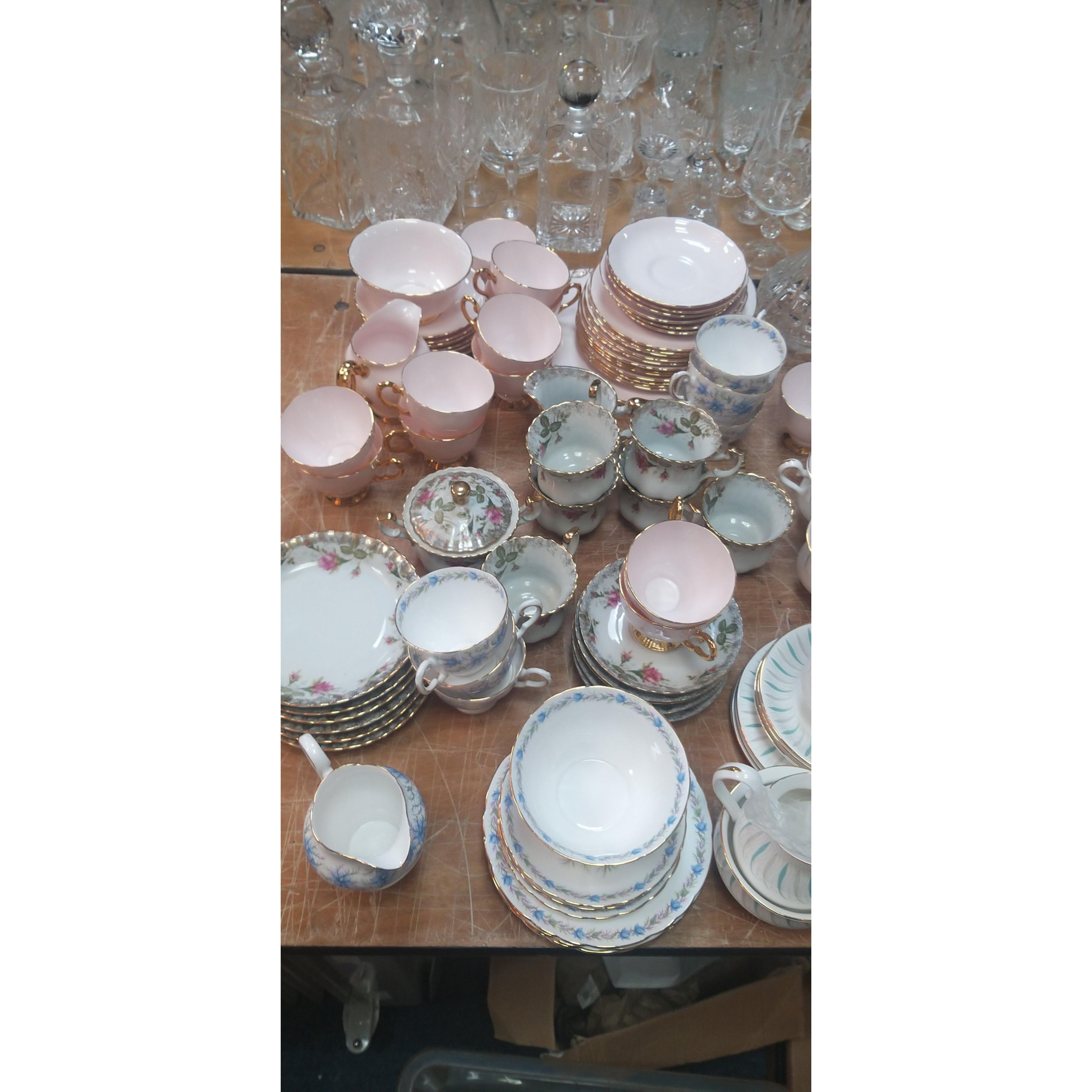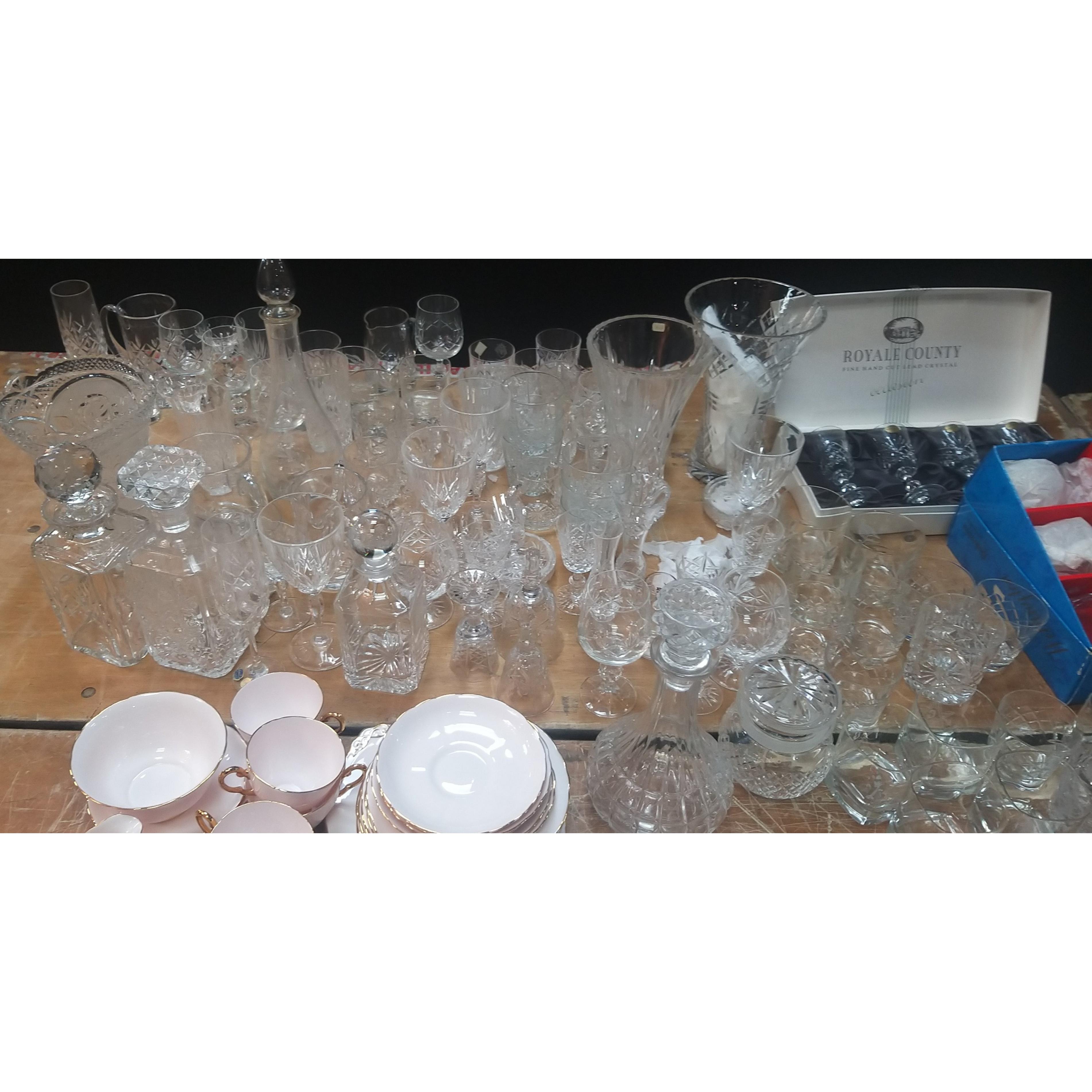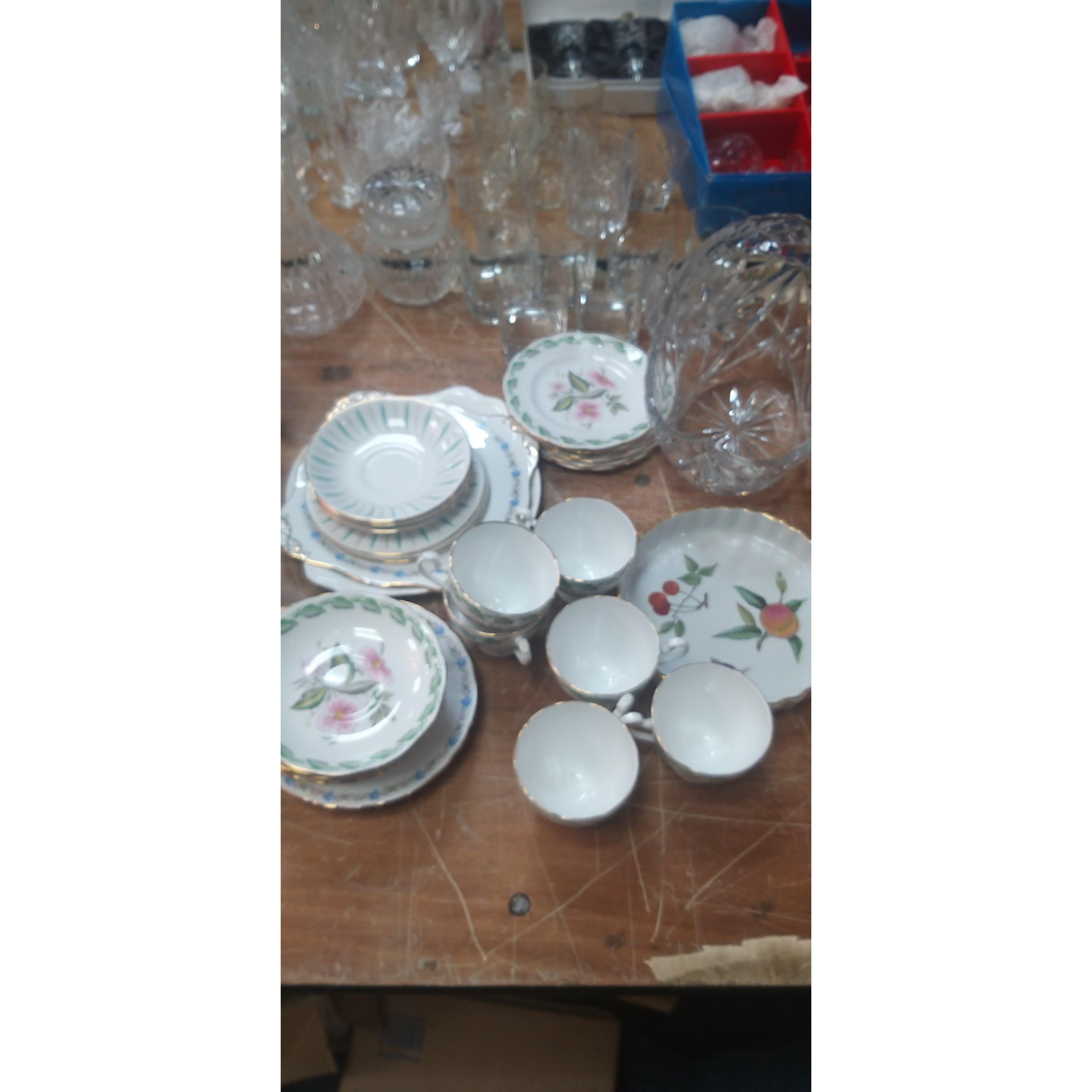 A great selection of part tea services to include ROYAL ALBERT, ROSLYN, TUSCAN, CHODZIEZ and others including Royal Worcester Evesham flan dish. A wonderful wide useful selection. Comes with a substantial lot of crystal and other glassware including Robert Burns decanter, boxed BOHEMIA and boxed ROYAL COUNTY glasses, engraved GROUSE whisky tumblers, engraved Masonic whisky tumblers and others. A huge lot !