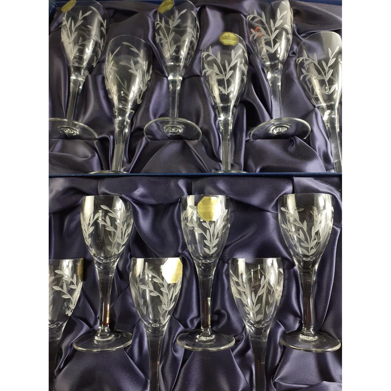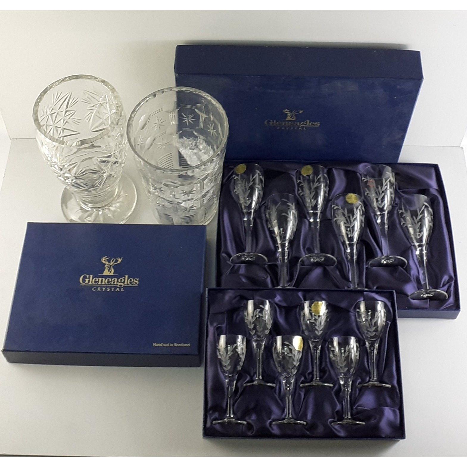 Two boxed sets of GLENEAGLES glasses and two substantial crystal vases. The largest 30cm. All in good useable condition.