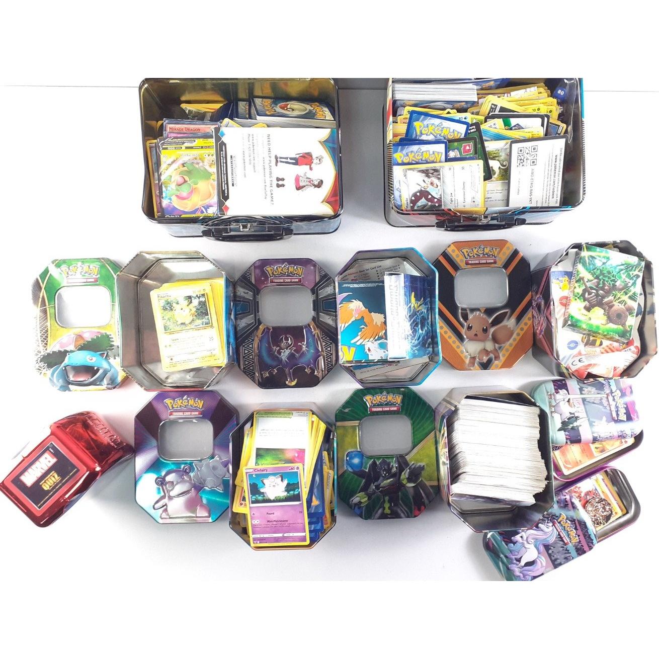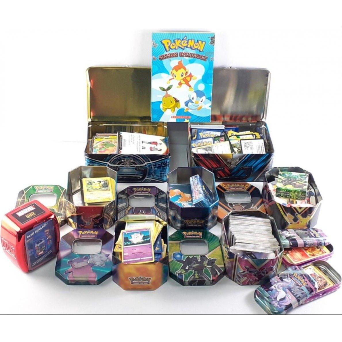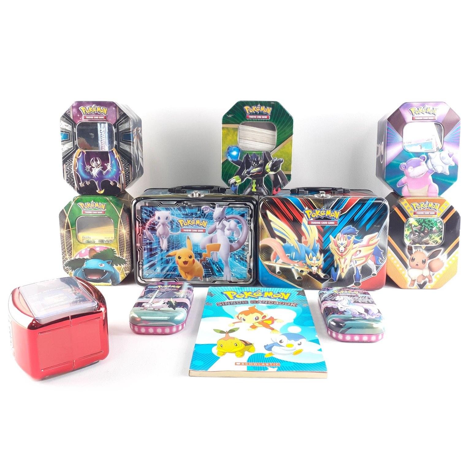 A large collection of POKEMON trading cards to include 2 lunch boxes tin of loose cards, 5 mini tins and others