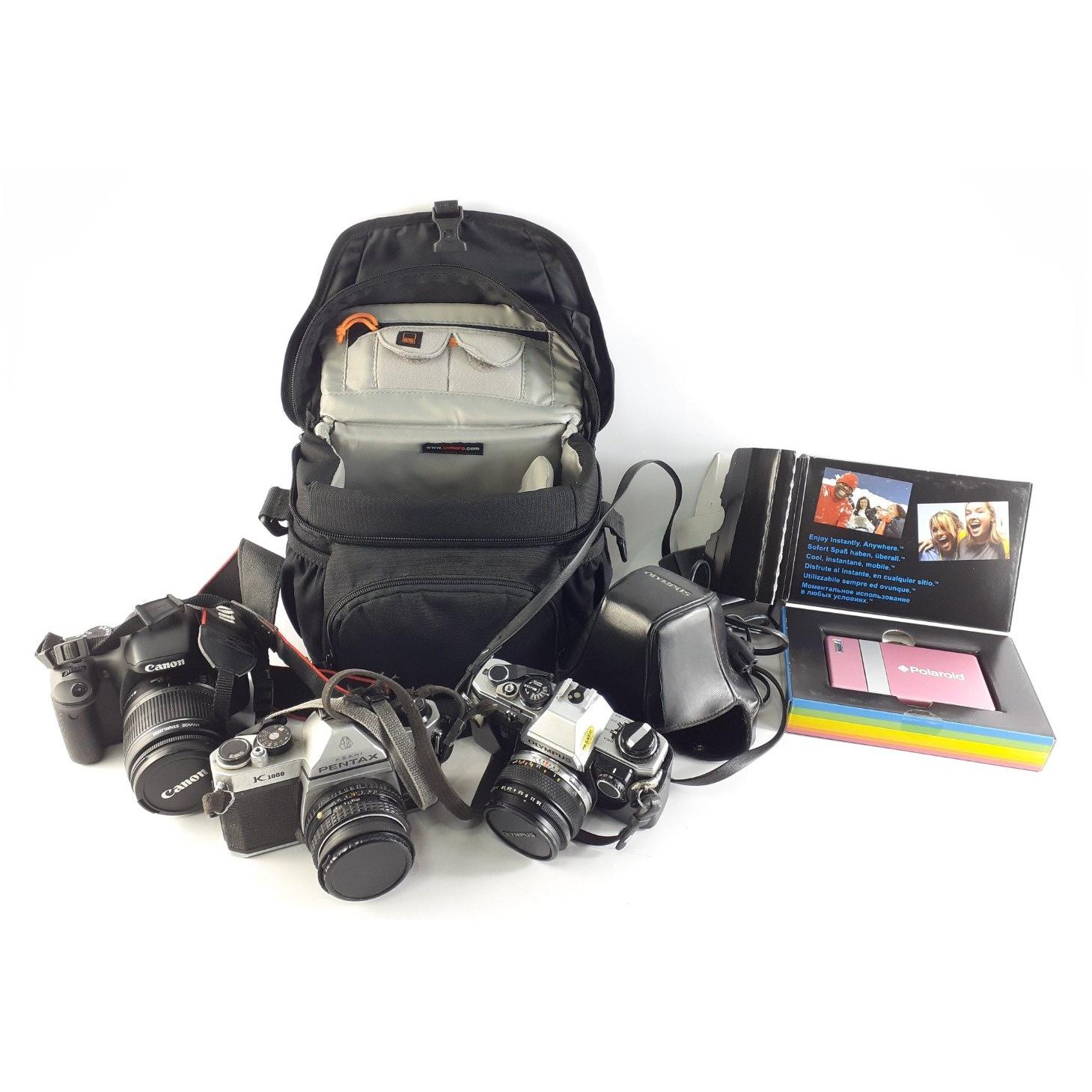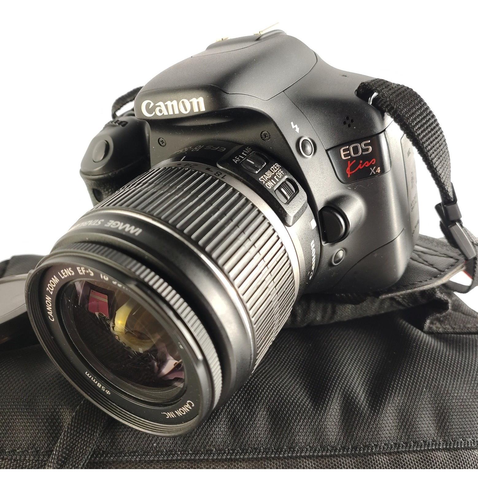 Four cameras. CANON EOS KISS with 18-55mm lens. OLYMPUS OM10 IN CASE, PENTAX K1000 and a boxed POLAROID POGO printerApprox 3 pieces