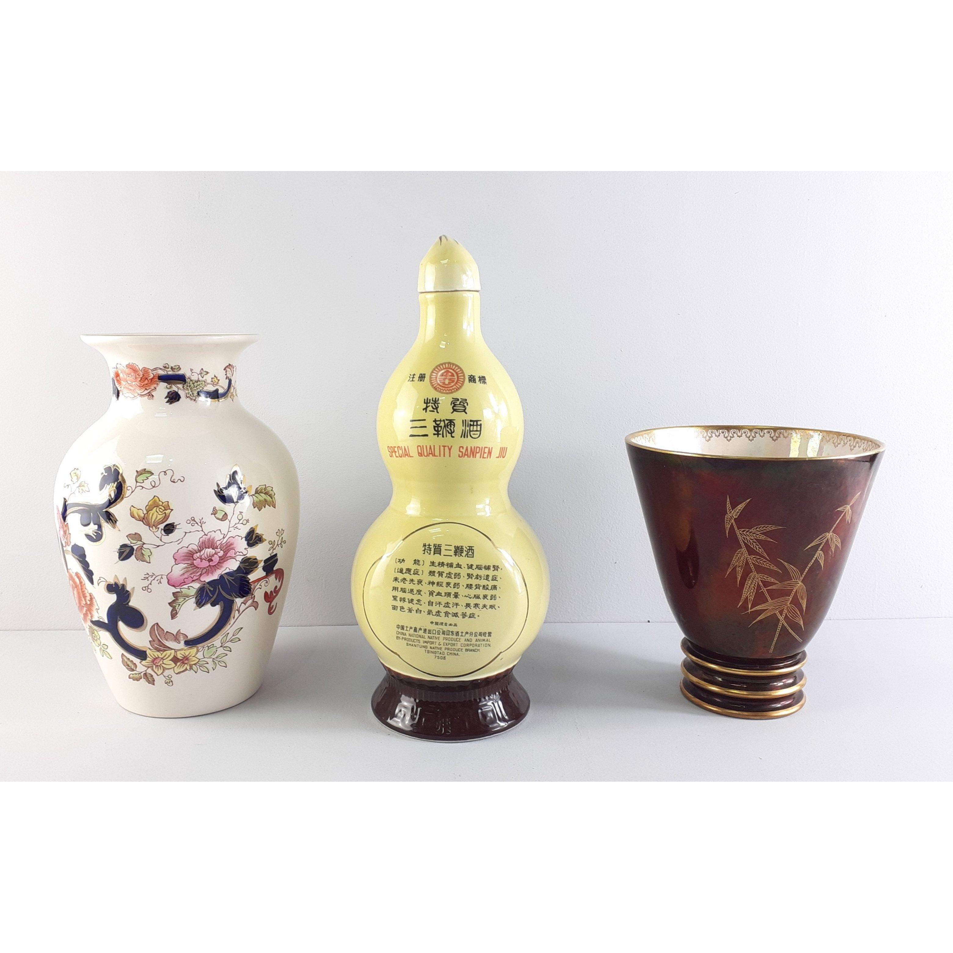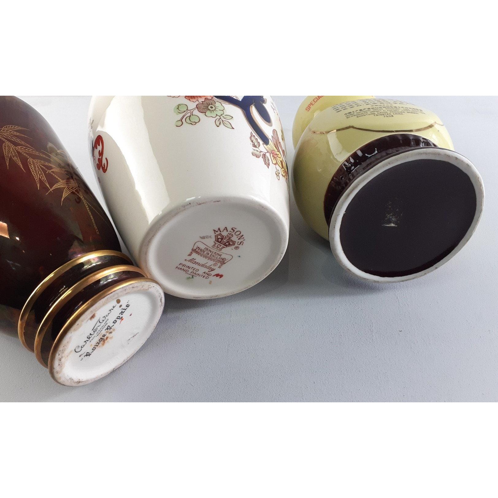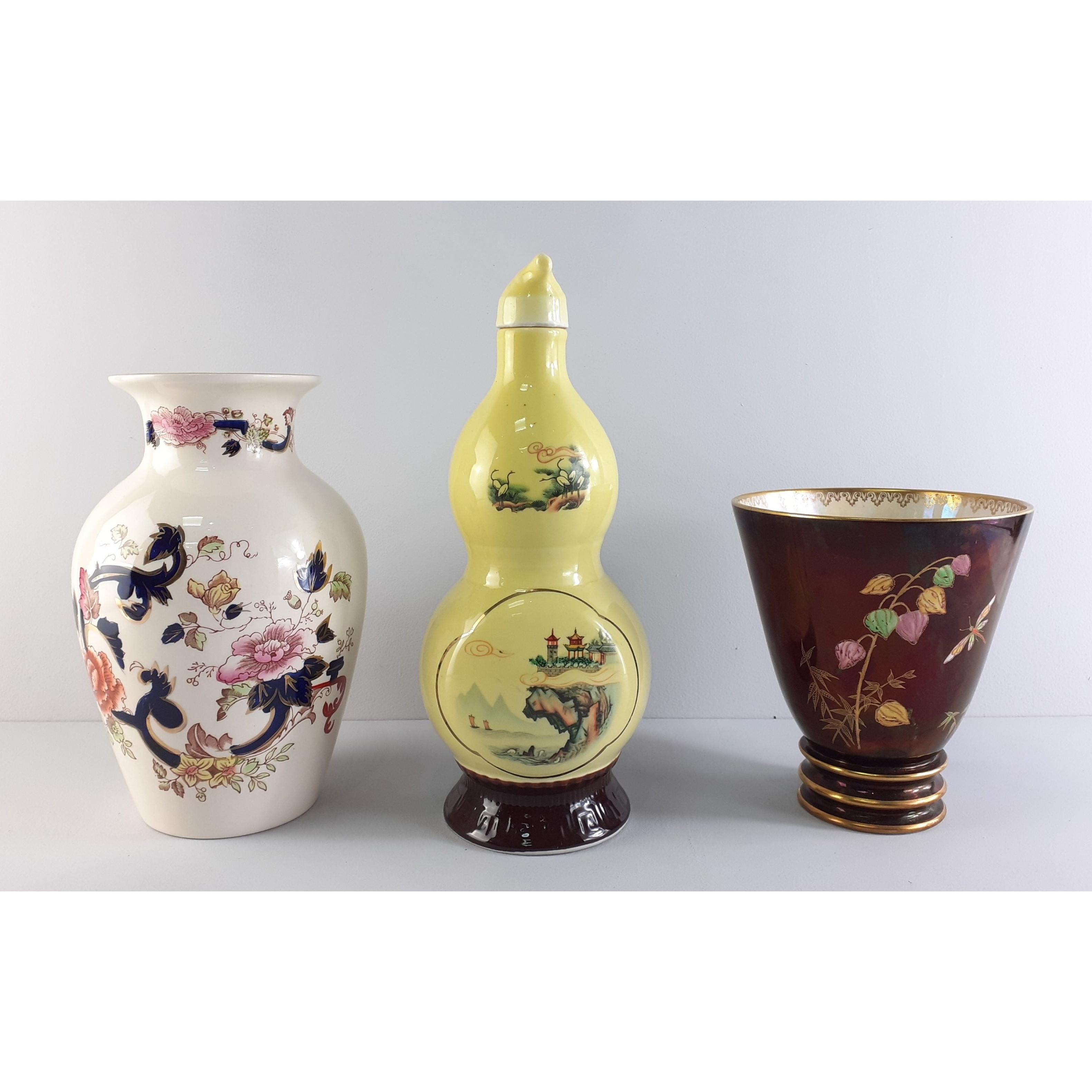 Three attractive decorative pieces. A CARLTONWARE Rouge Royale vase, a MASON'S ironstone vase and an unusual SANPIEN JIU decanter (27cm approx). Approx 3 pieces