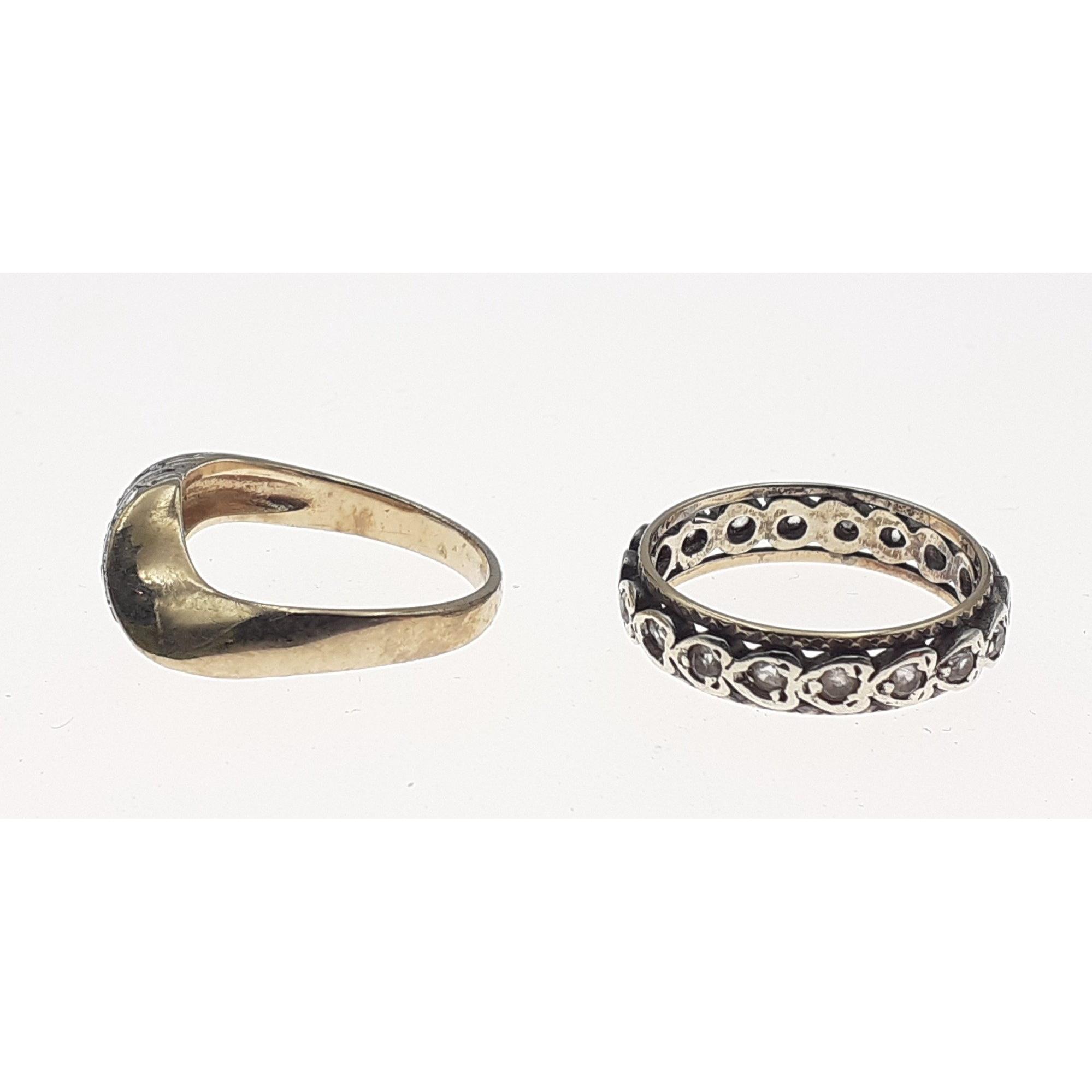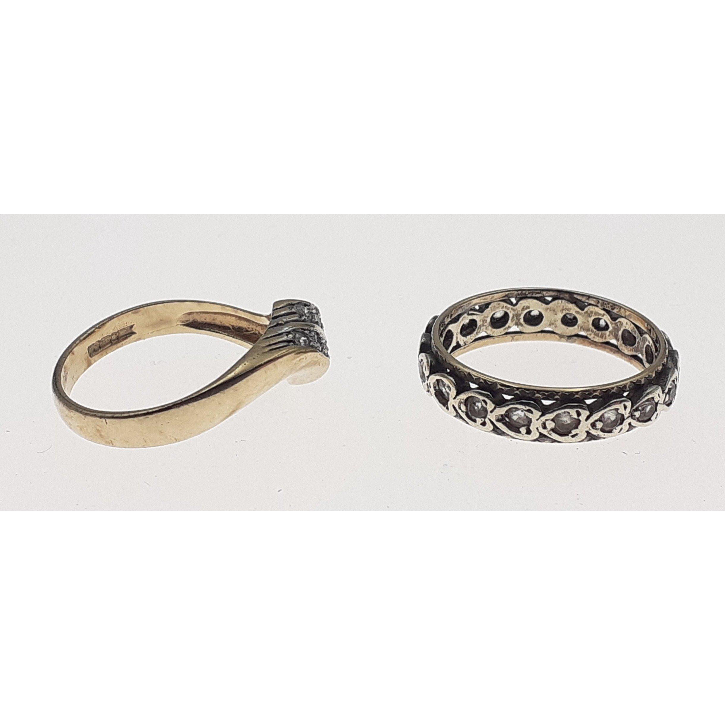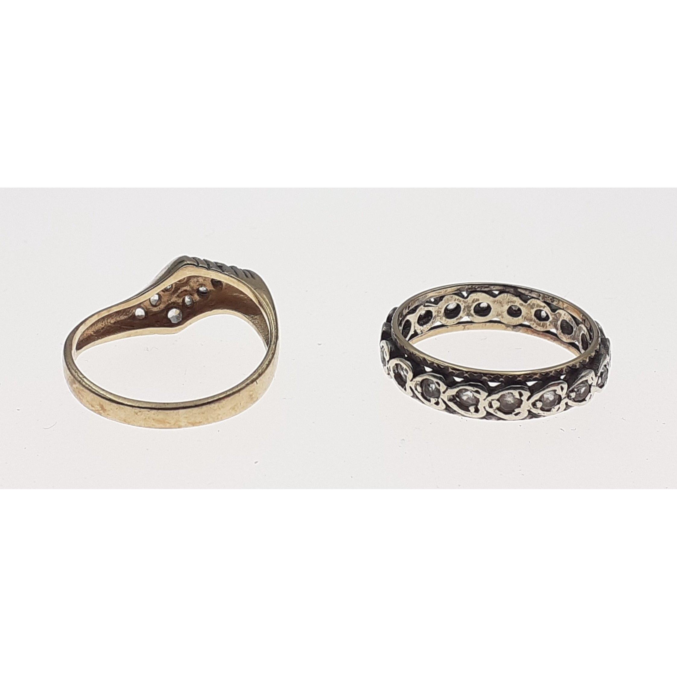 Two gold rings one with full 9ct hallmarks size N 2.5g approx. The other an eternity ring set with clear stones also size N gross weight 2.9g . Total gross weight 5.4g approx