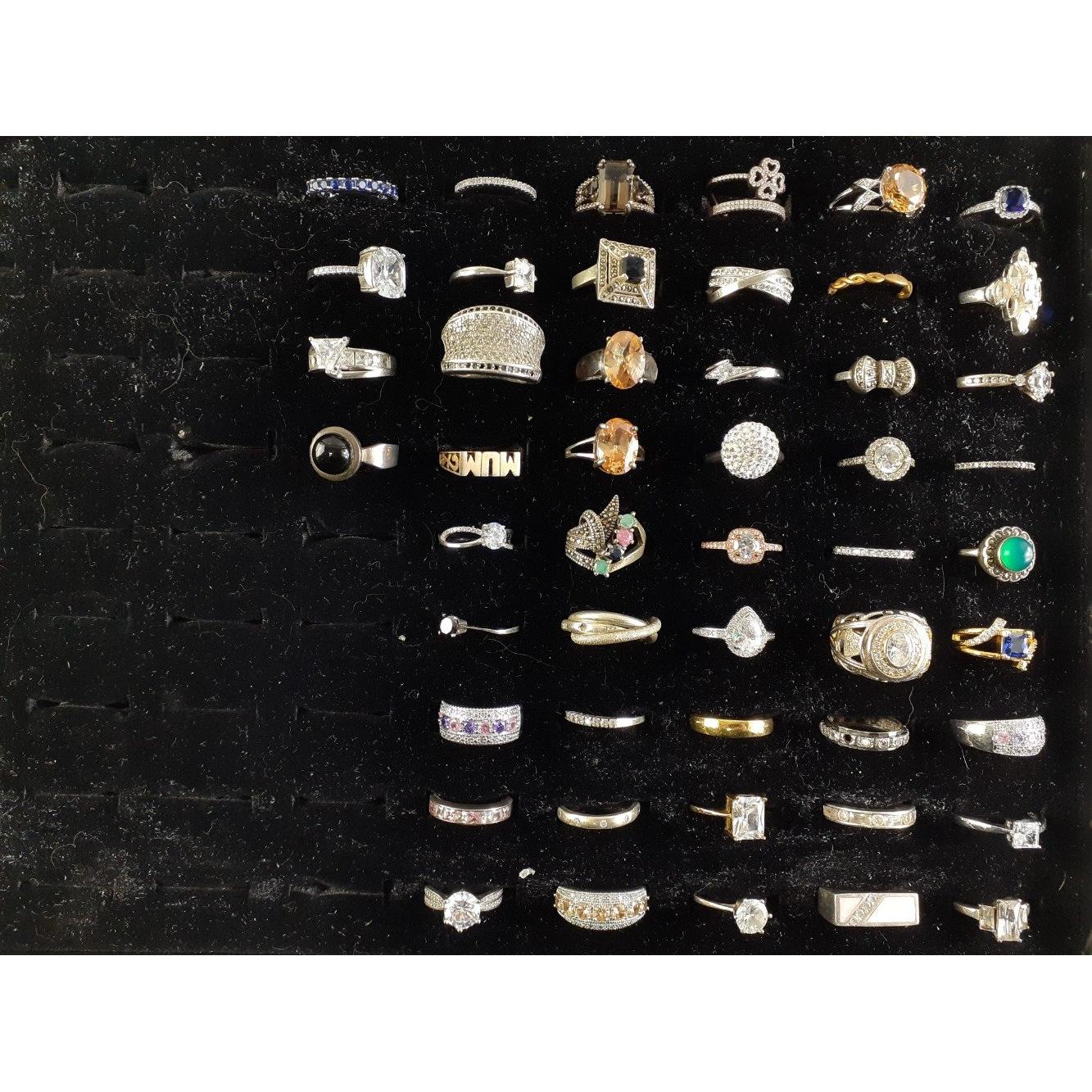 A good ring display box containing 49 rings all with 925 or SILVER stamps. Various styles, sizes and designs. An amazing lot. Gross weight 200g approx.