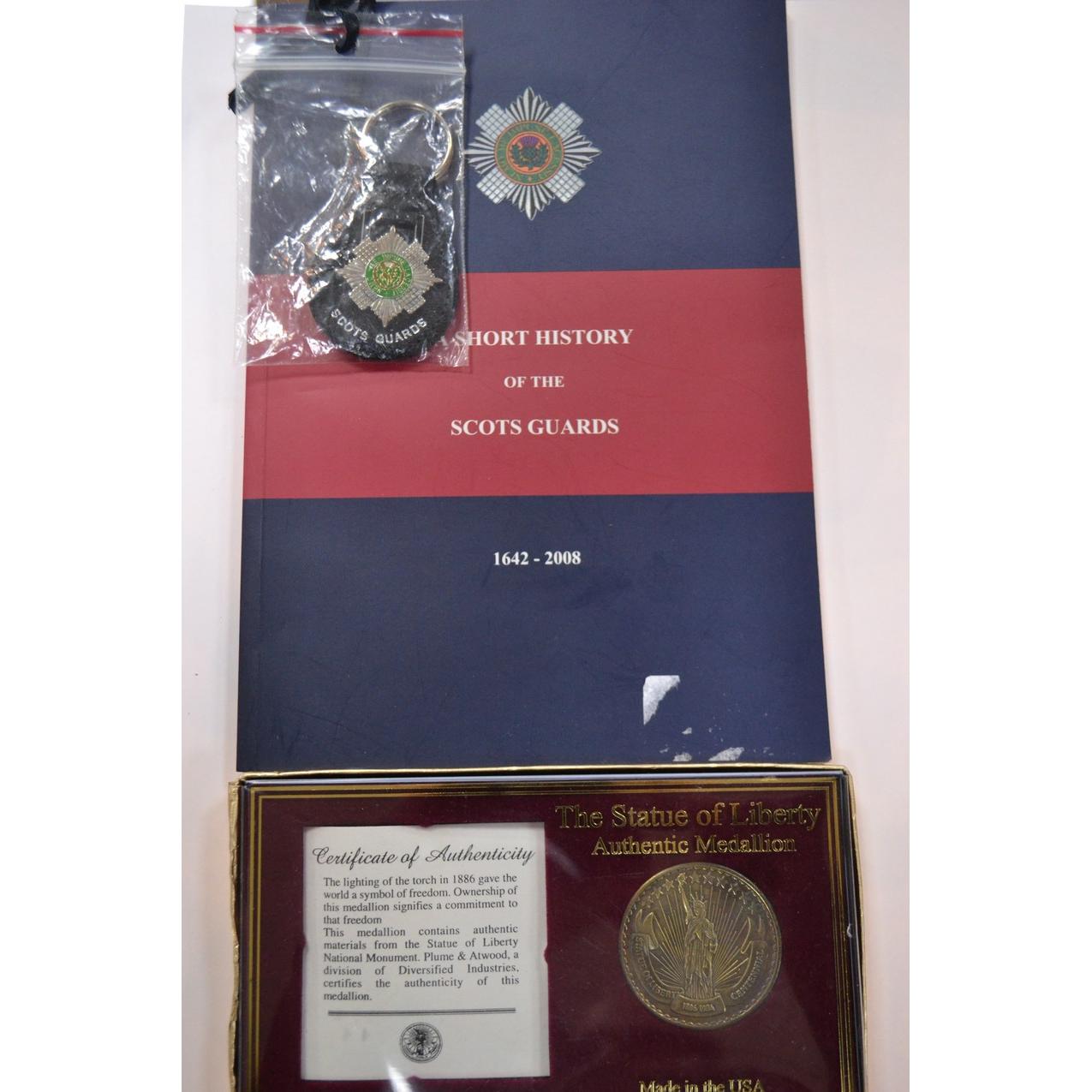 Booklet of short history of Scots Gaurds with Scots Guard fob and 'The Statue of Liberty' USA medallion