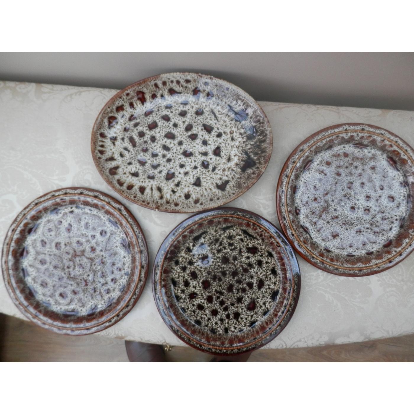 3 dinner plates and an oval steak platter in the brown honeycomb pattern from the Fosters Cornish studio pottery in Redruth. In good condition no chips or cracks.