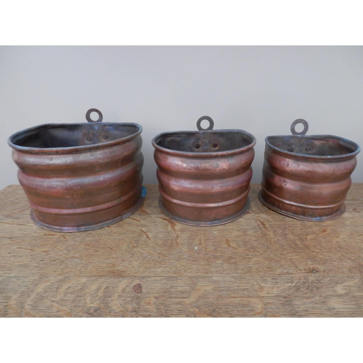 3 graduated French copper wall hanging planters. The largest is 10 cm tall and 15 cm wide