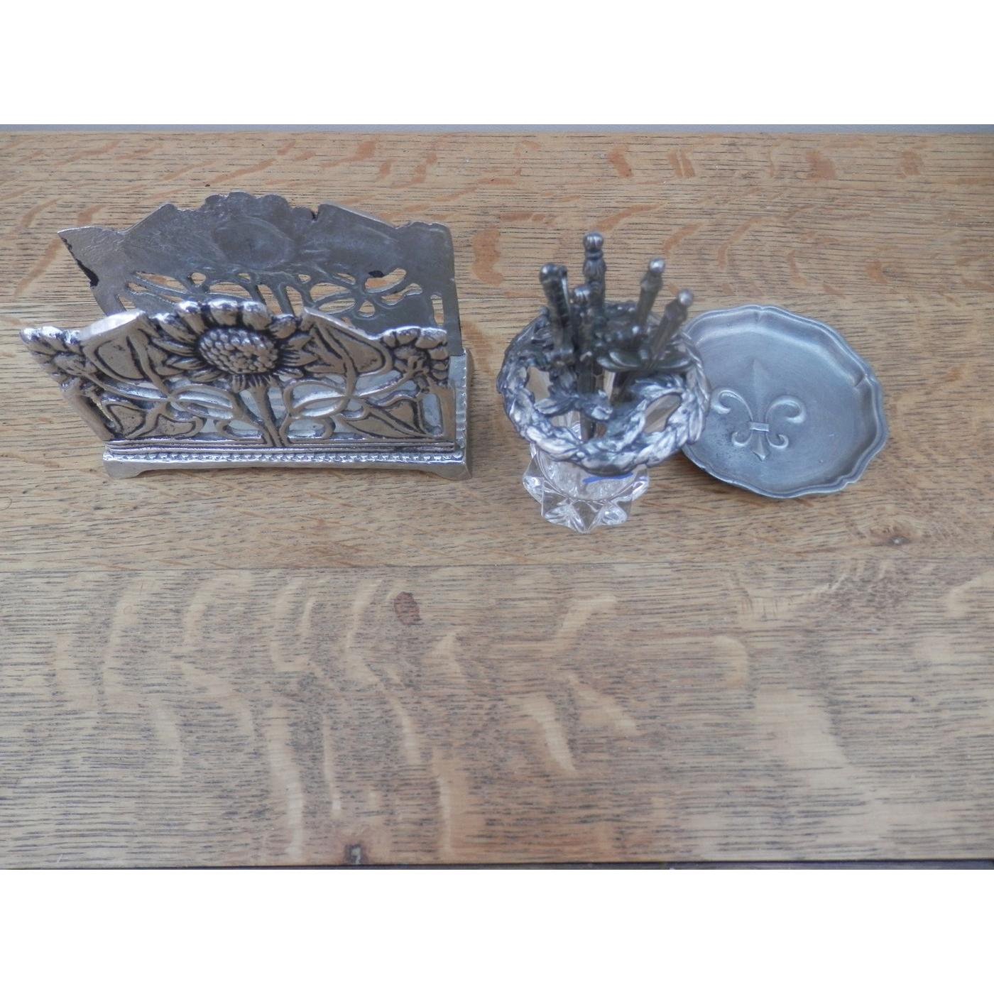 Metal letter rack with a sunflower design, a Cocktail stick set in the form of swords in a thistle glass and pewter holder and a pewter pin dish with fleur de lys design.