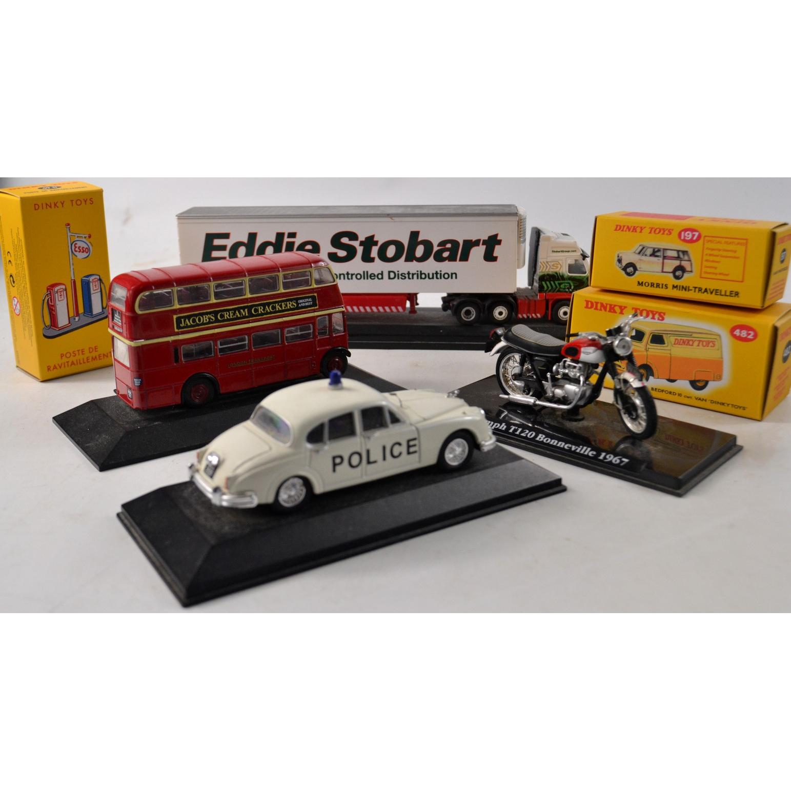A collection of play toy cars and display lorries to include also 3 Dinky toys Morris Mini traveller, ESSO petrol station, a Bedford 10 dinky vam, all Dinky's in pristine condition boxed