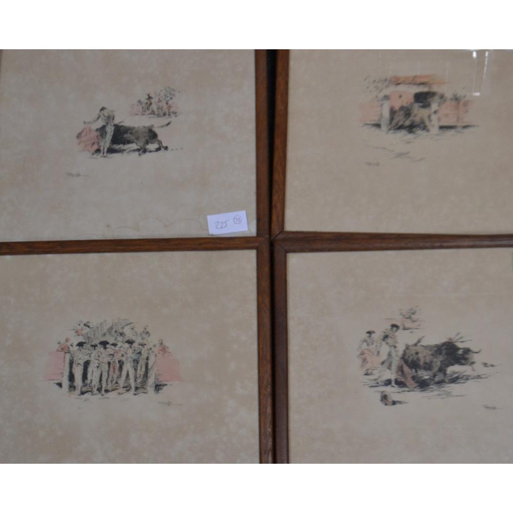 A set of 4 SEVILLE by TERVELLA coloured and penned scenes of Matadors and bull fighting c1920's