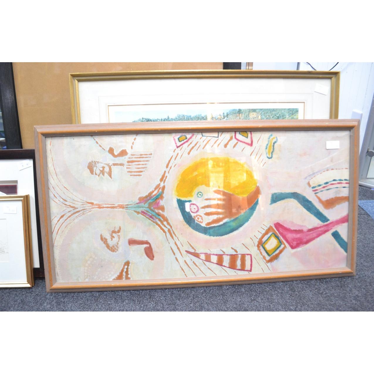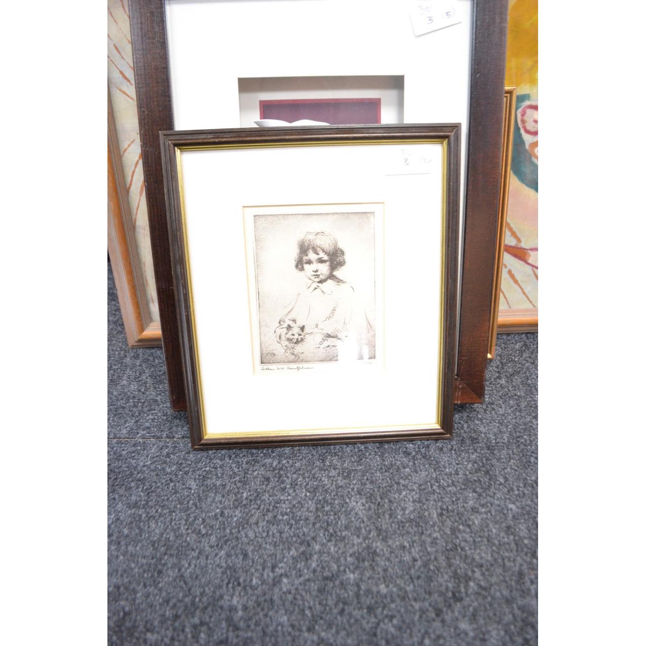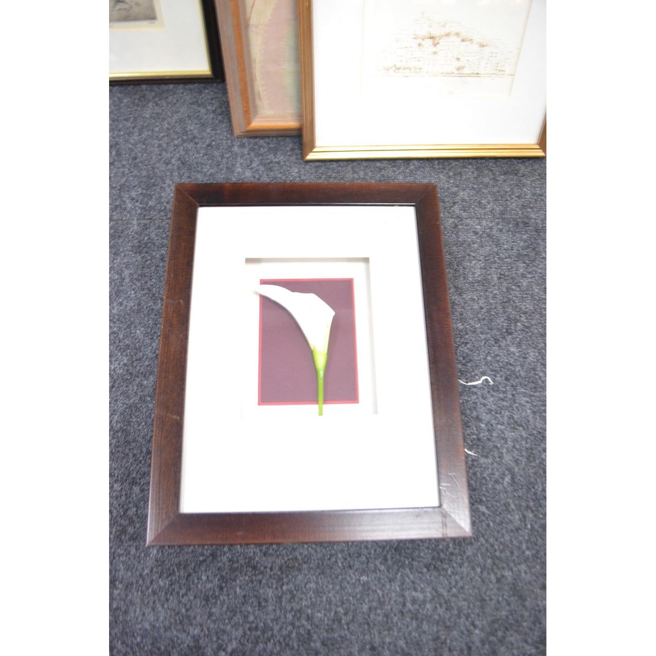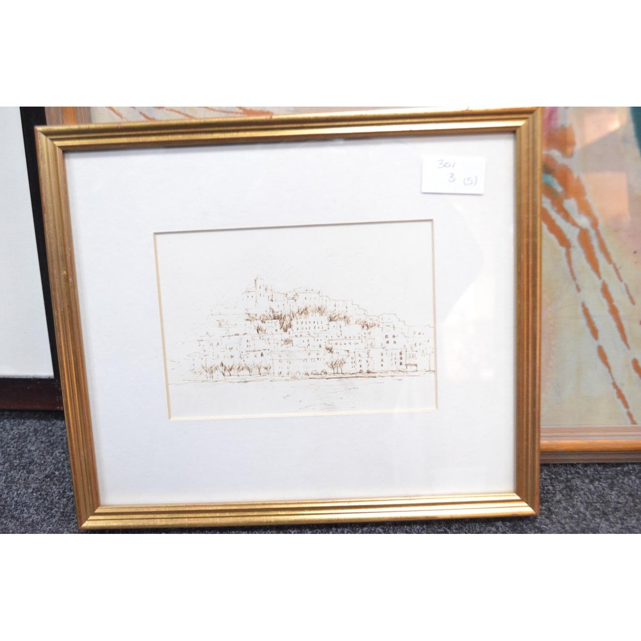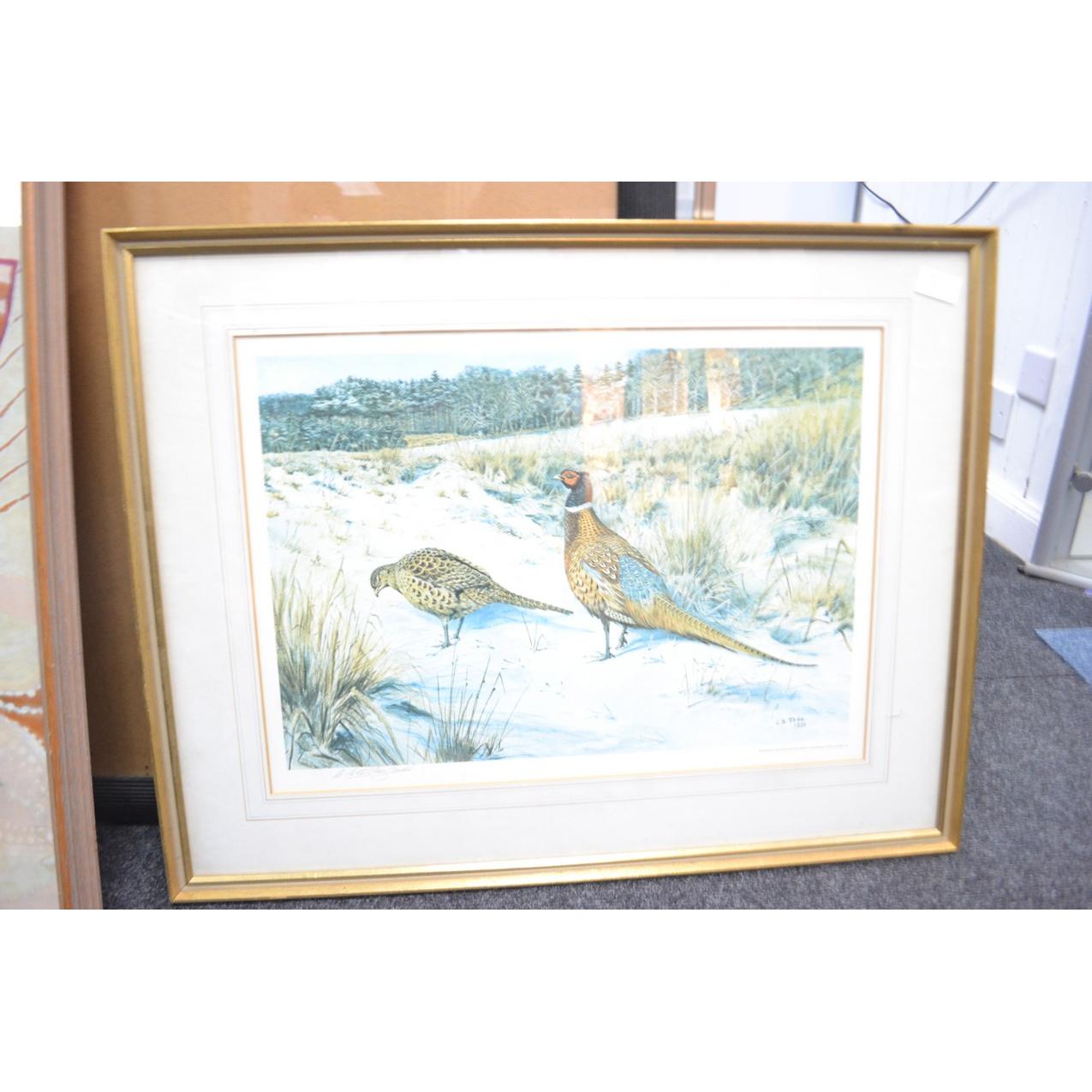 Selection of pictures to include C S TODD partridge print, portrait, African panel, box frame with flower and sketch of town (5)