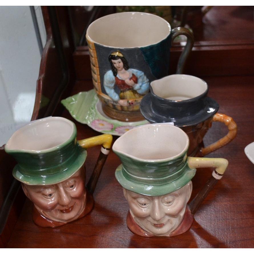 5 pieces of BESWICK WARE to include 3 miniature character jugs, Micauber, Pickwick and one other all 8.5cm H, Romeo and Juliette mug No 1215 H 16cm and a pin dish No 628 10cm no chips or cracks